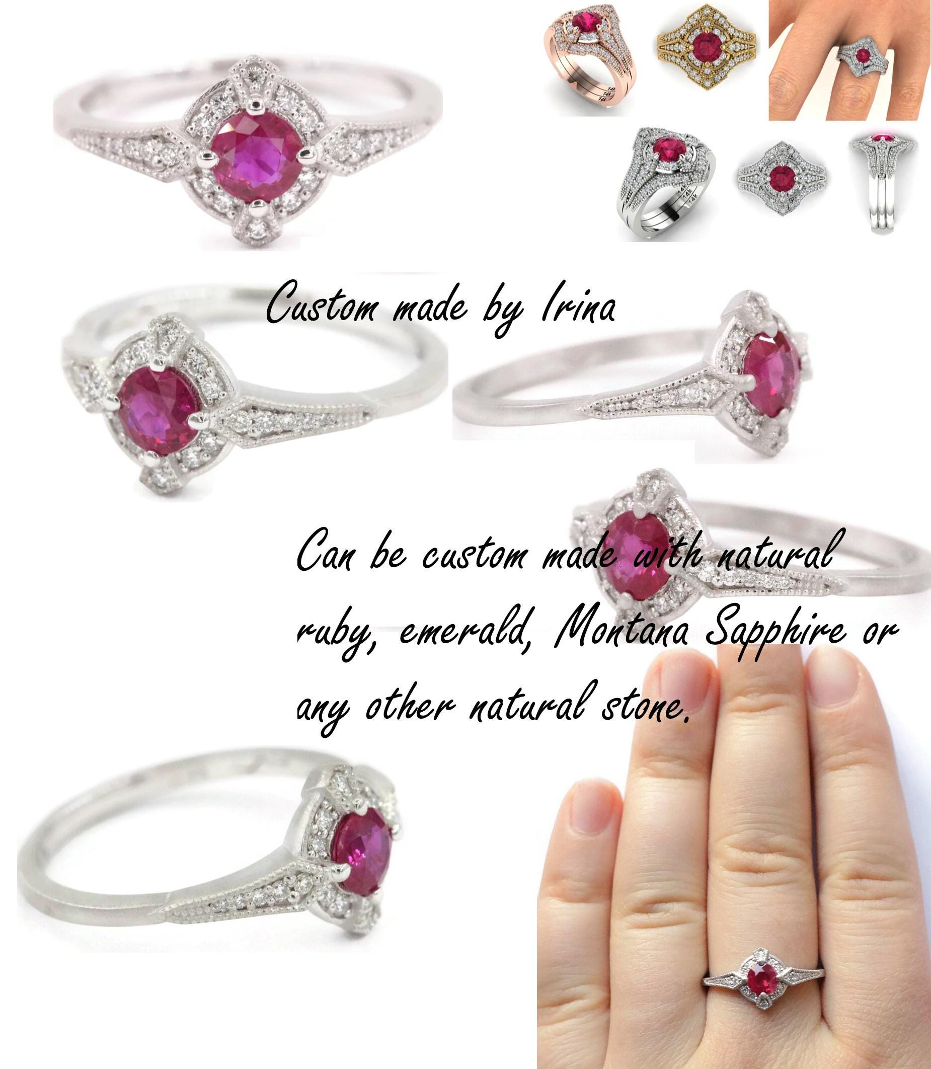 Can be custom made with ruby, emerald, natural Montana sapphire or any other center stone.