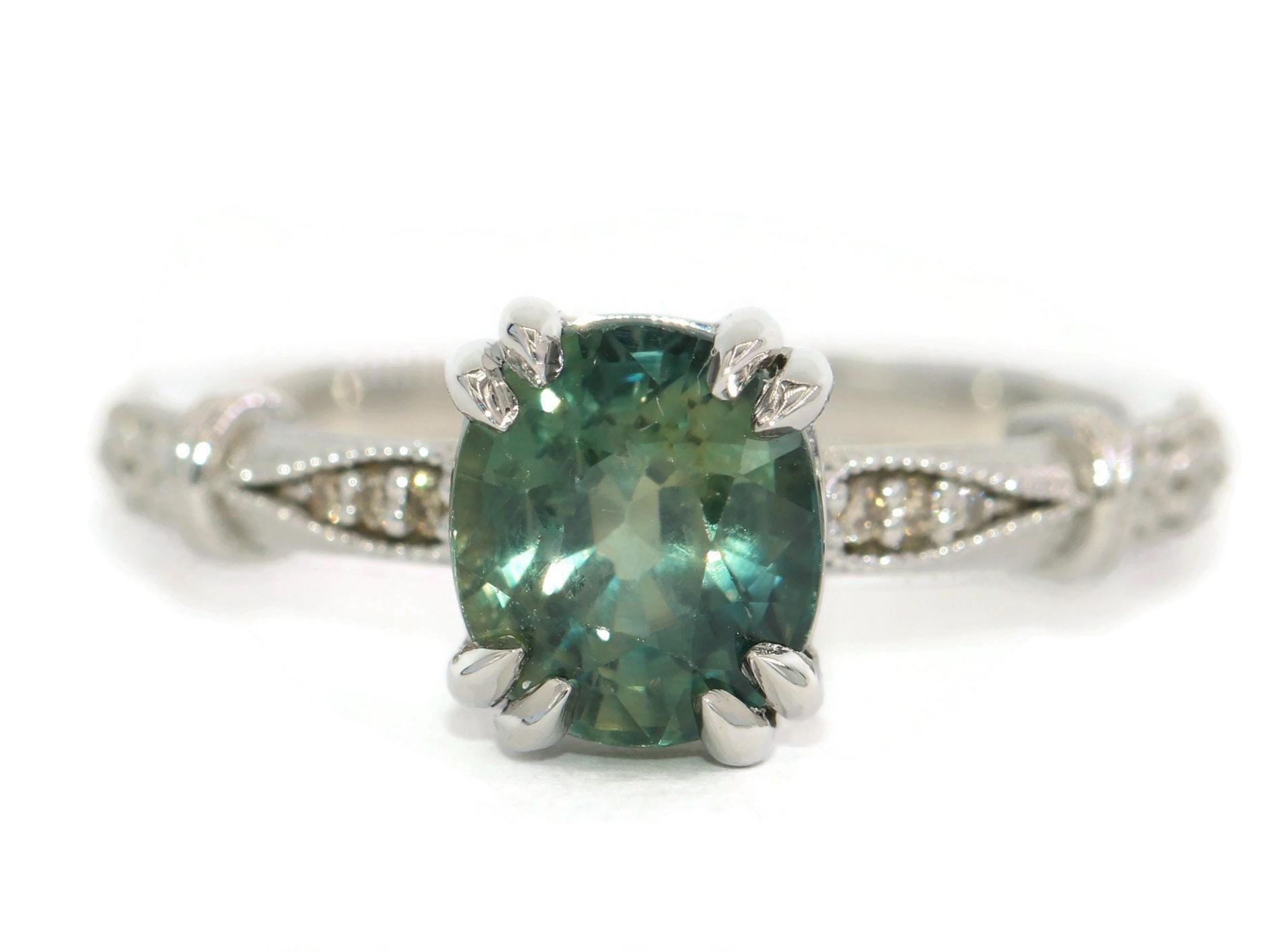 Custom-made almost 3 carat Blue Green Natural Sapphire Engagement Ring with nature inspired flower patterns.