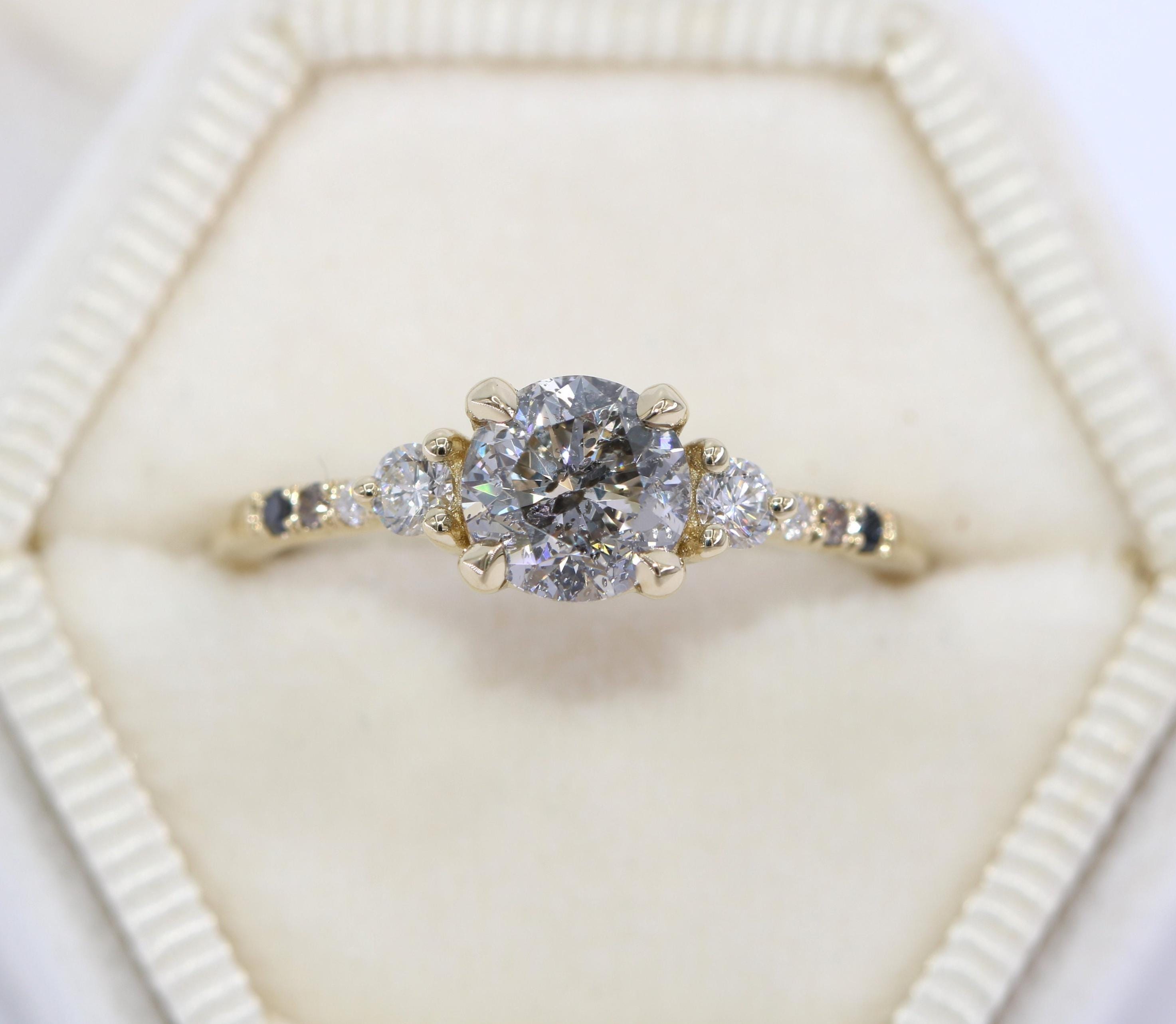 Center stone: High Quality Shiny 1ct round salt and pepper natural diamond.