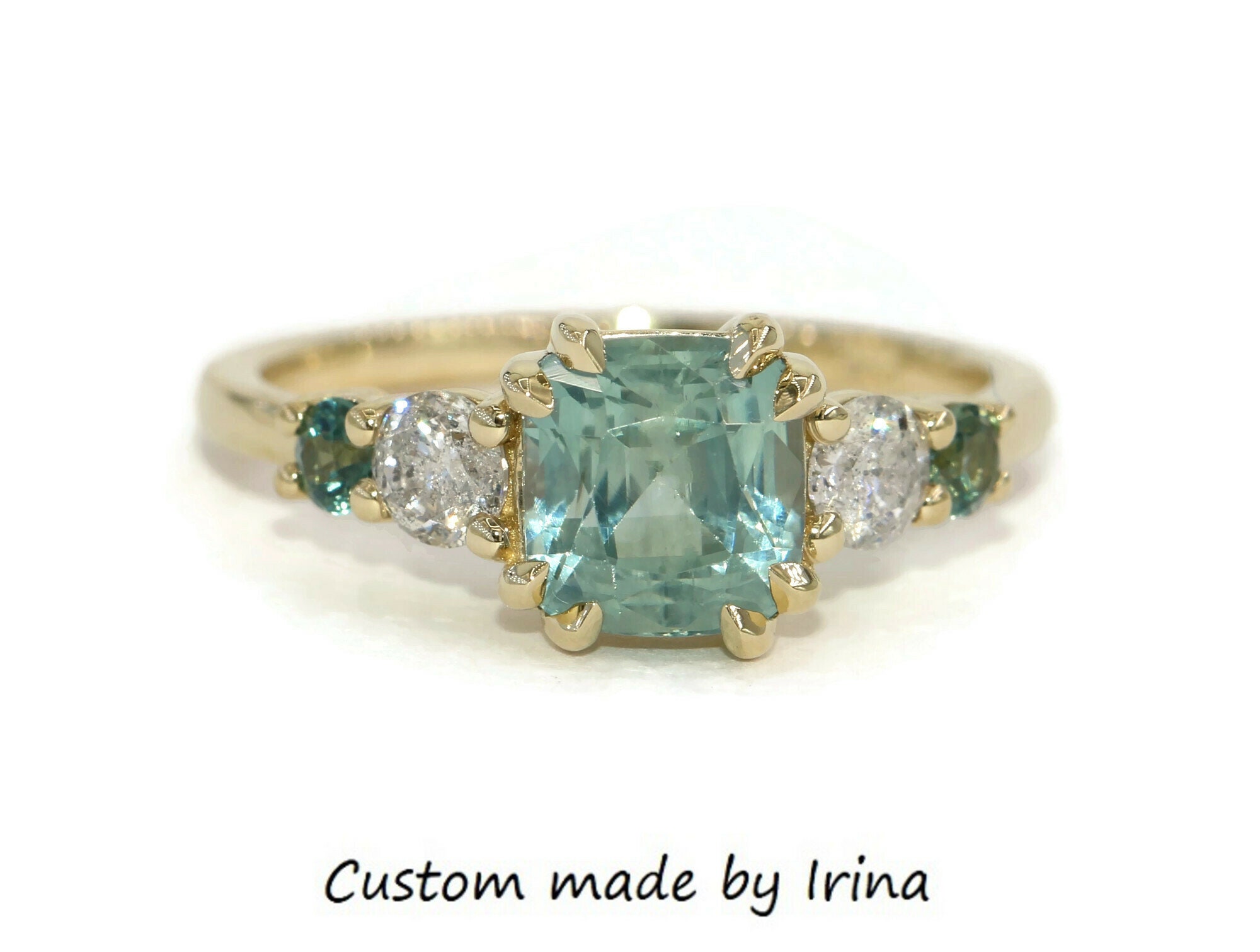 Custom Made 5 Stone teal Sapphire Engagement Ring.