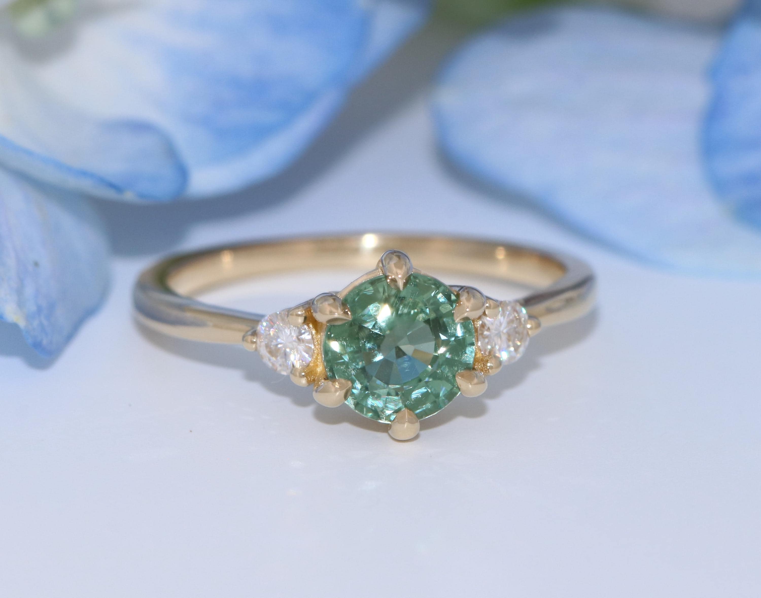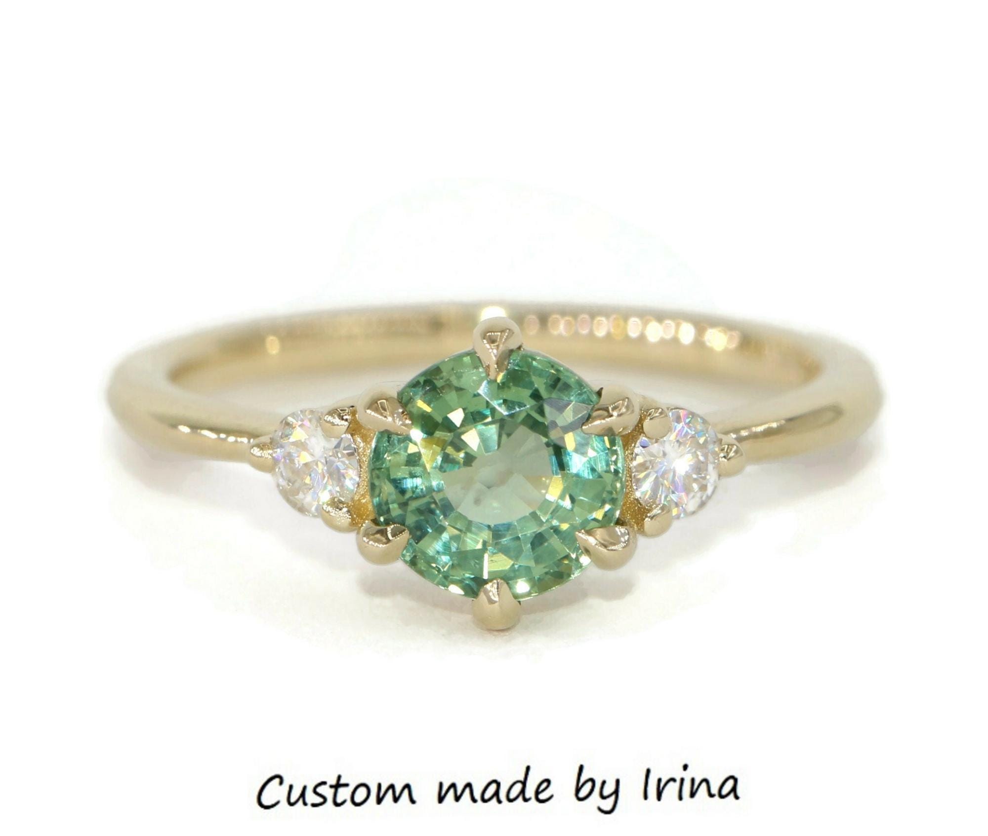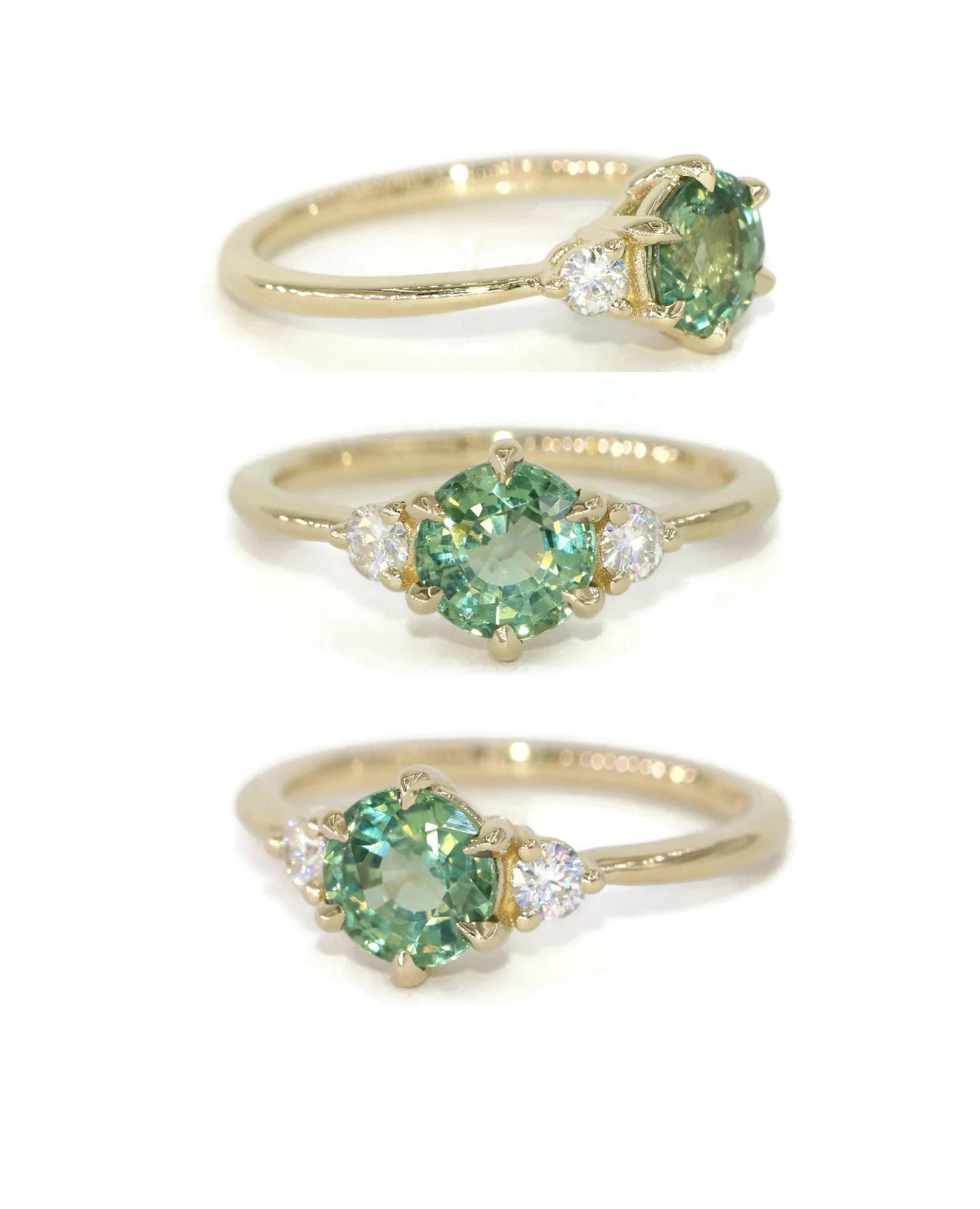 3 Stone Teal Green Sapphire Engagement Ring.