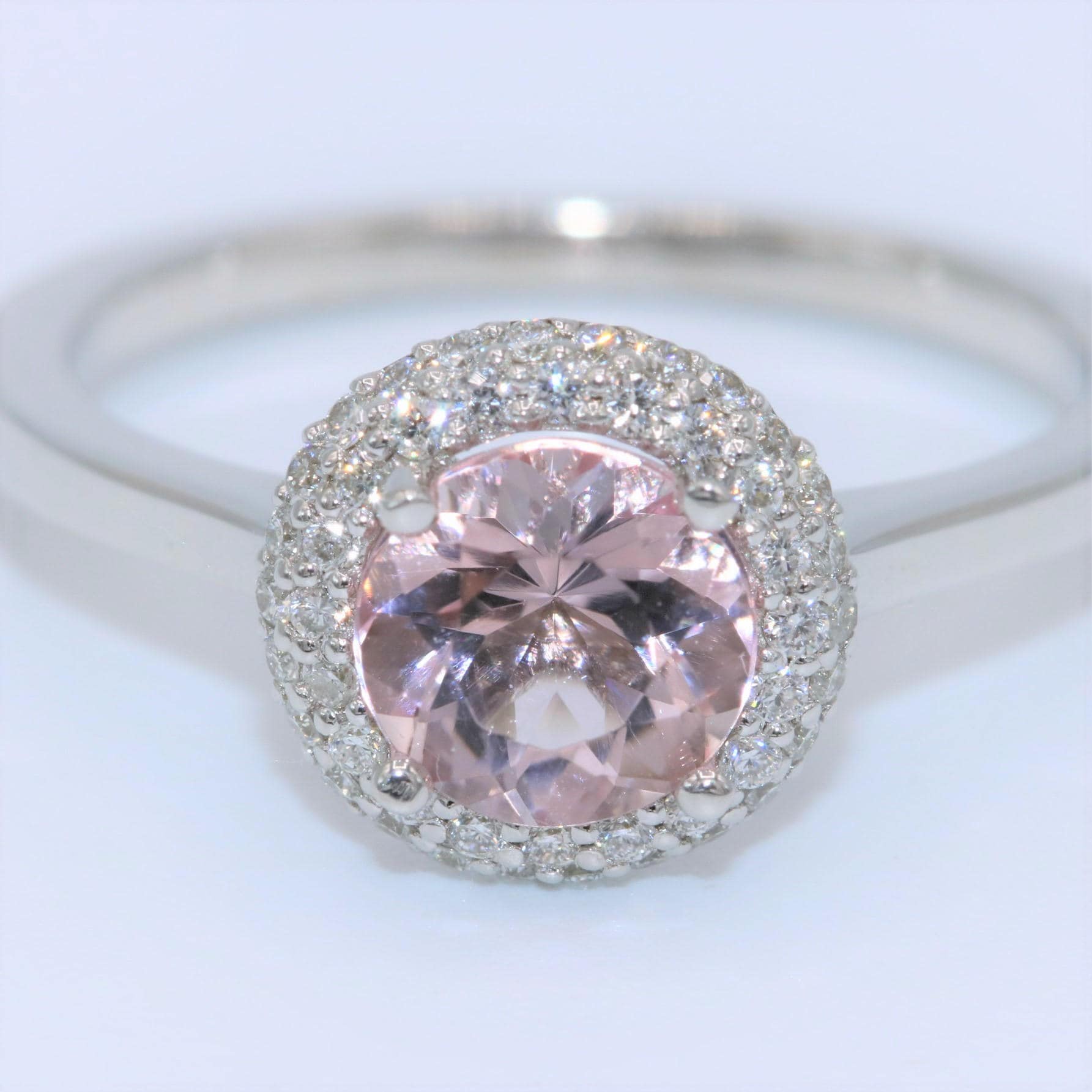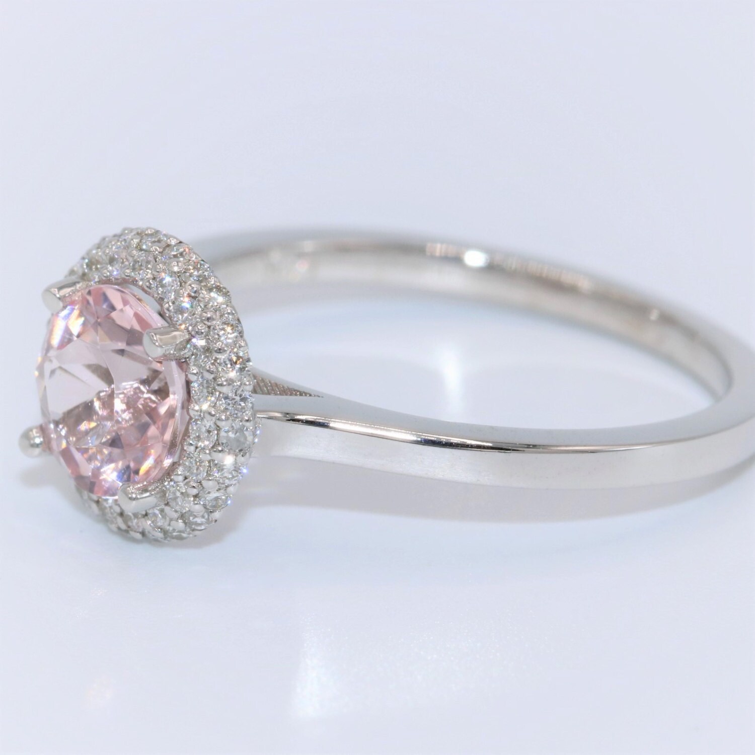 Shimmering brilliantly, this diamond halo makes a striking, modern alternative to the traditional engagement ring. The Portuguese cut pink morganite (1.03 carat) is set in a meticulously hand-crafted prong-setting of 14k White solid gold.
