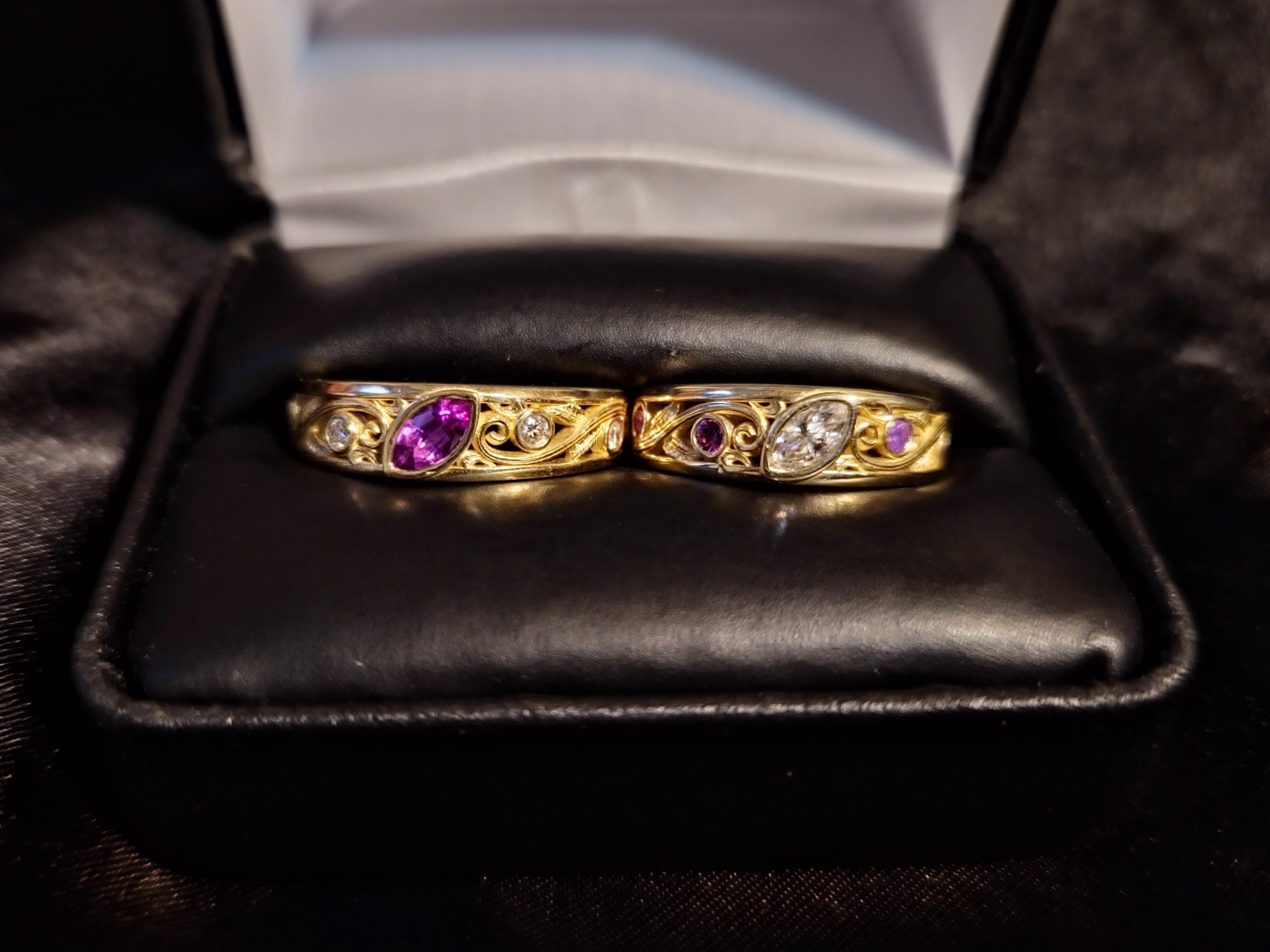 My fiancé and I wanted unique wedding bands that embodied who we are as a couple. We spent months searching for the perfect rings, and finally decided to have one created for us. We sent Irina pictures of our inspiration and after a thorough consultation, she got to work on our dream rings. She answered all of my questions (and I had a lot) and helped guide me through different options that would work best for me. The end results are jaw-dropping. My marquis cut diamond glitters and sparkles so much it looks like it has billions of facets catching the light. My fiancé has a purple sapphire that seems to be glowing from the inside, always showing it's brilliant color. Every part of the rings are perfect. Everything we dreamed of and more. I never could have imagined such gorgeous creations, but Irina is a master at her art.