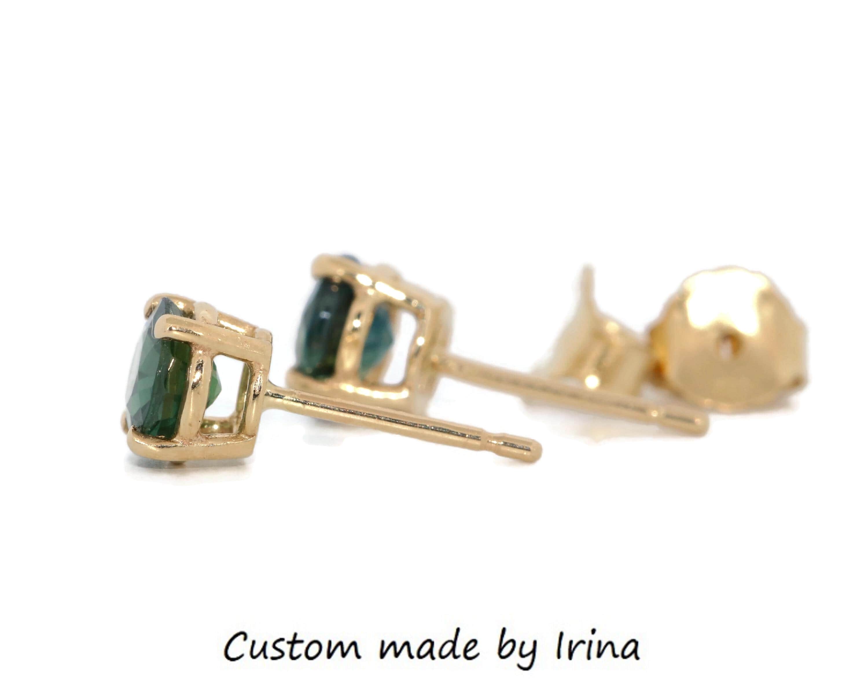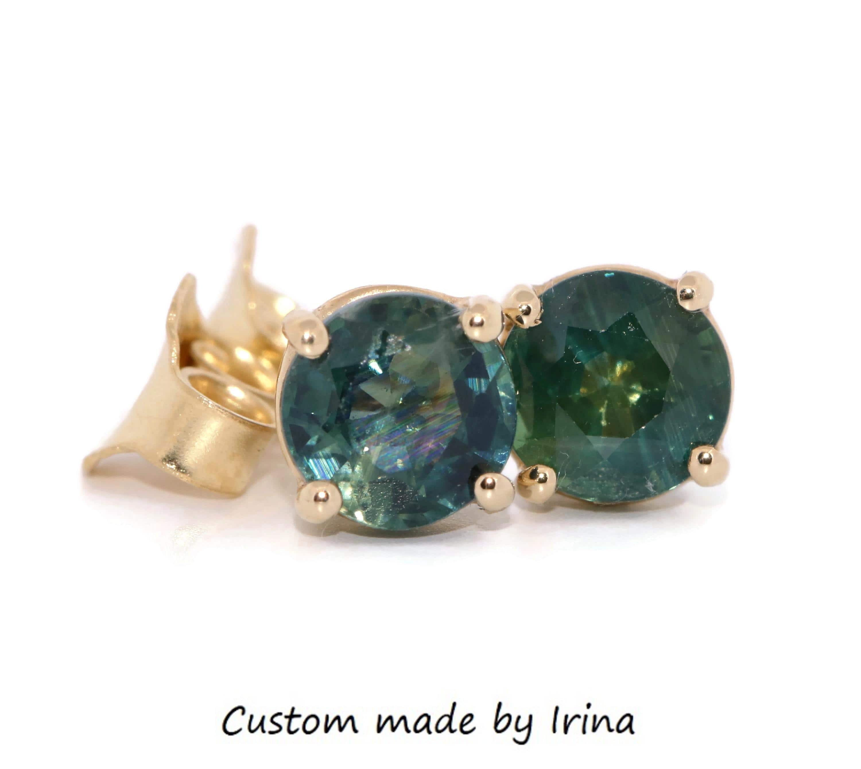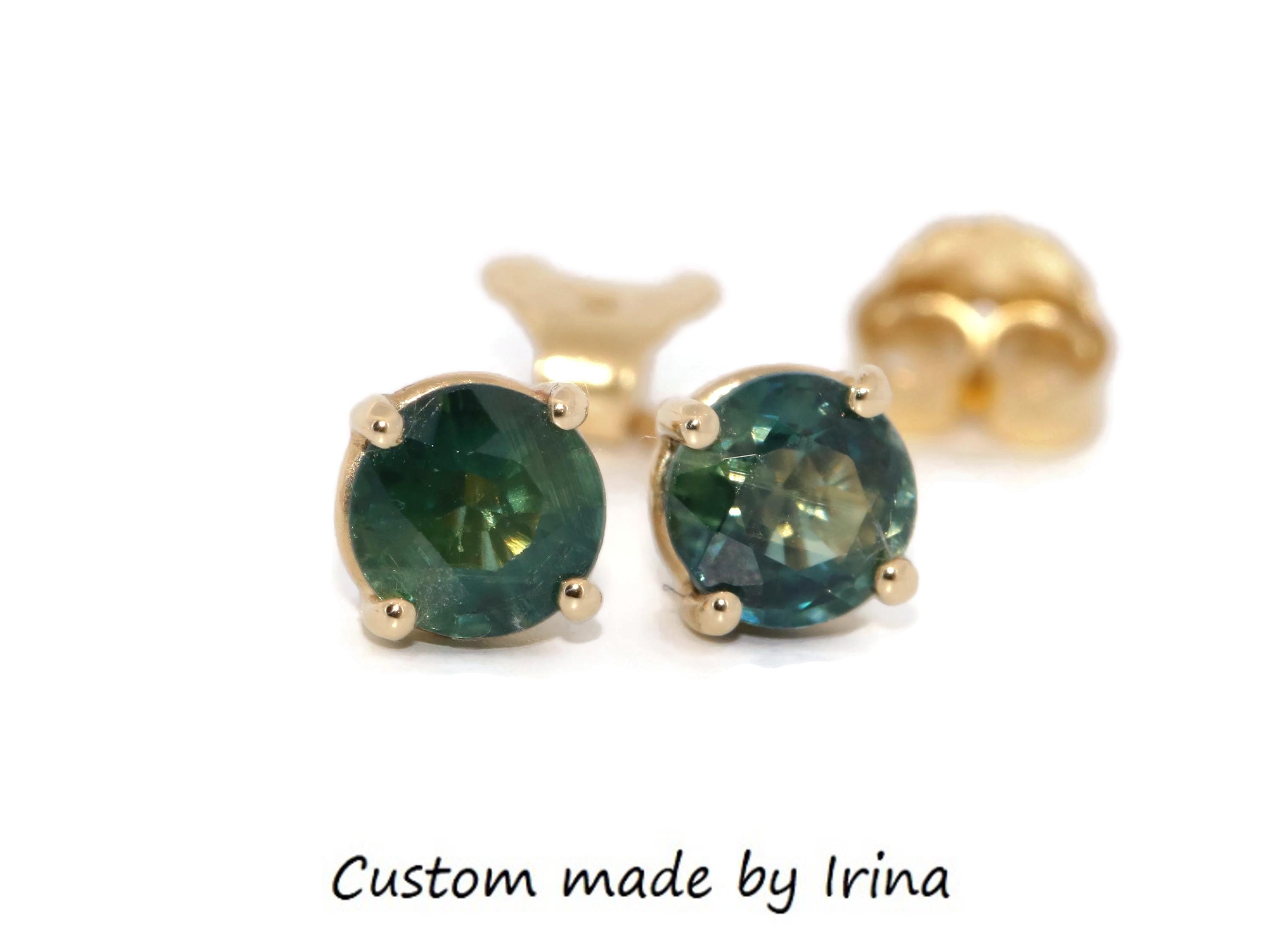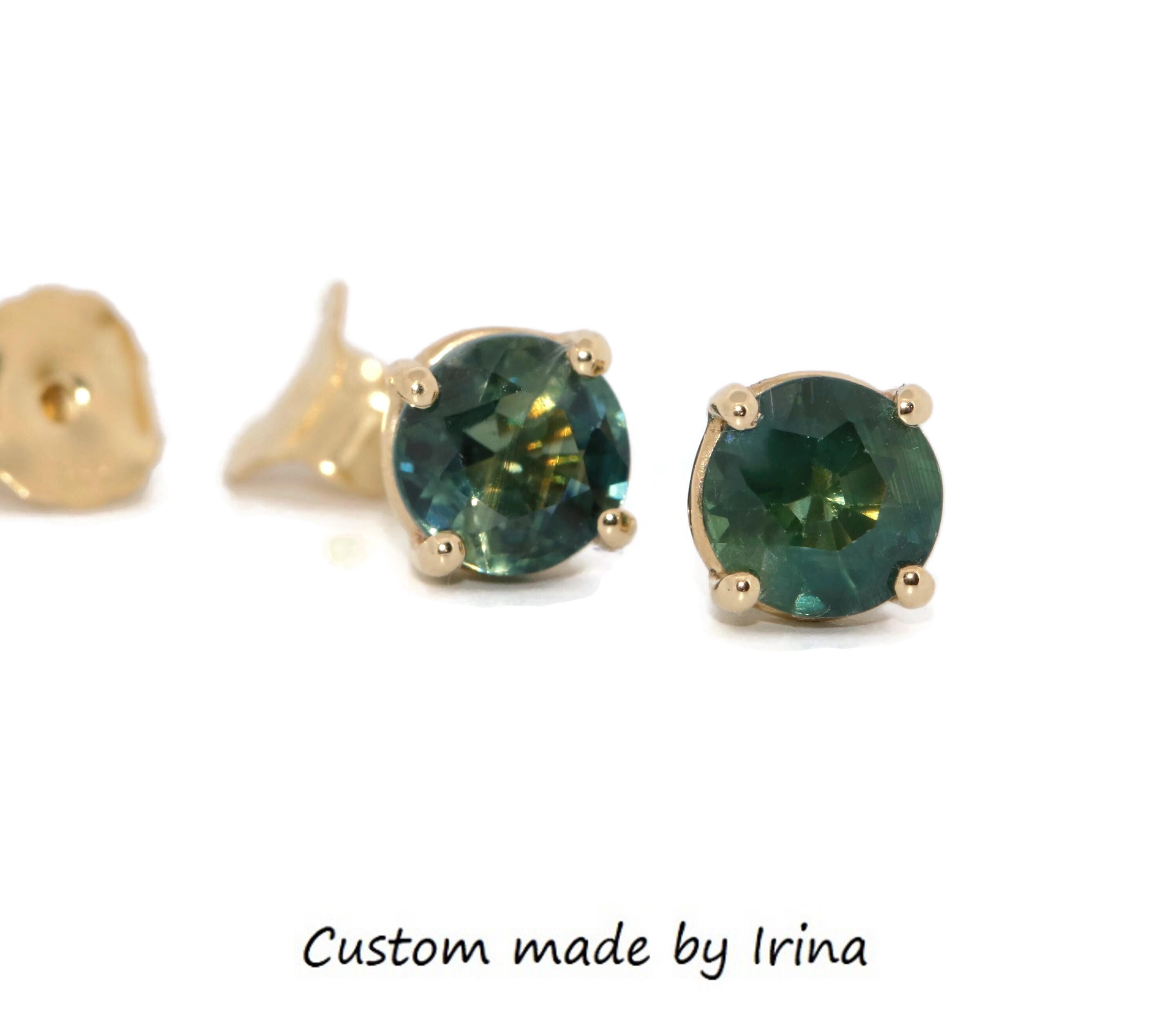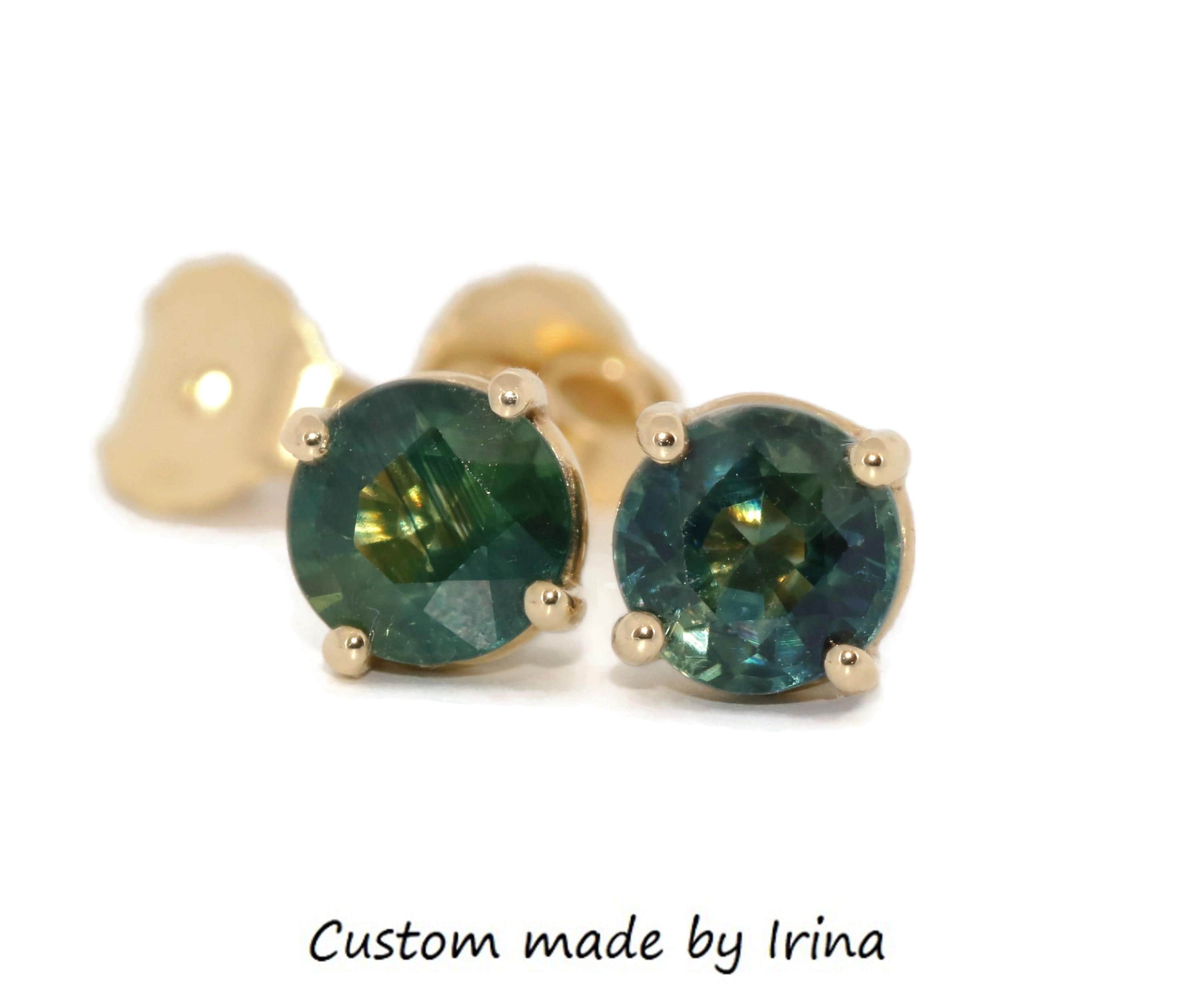 4 Prongs Blue Green Bi-color Sapphire stud earrings.