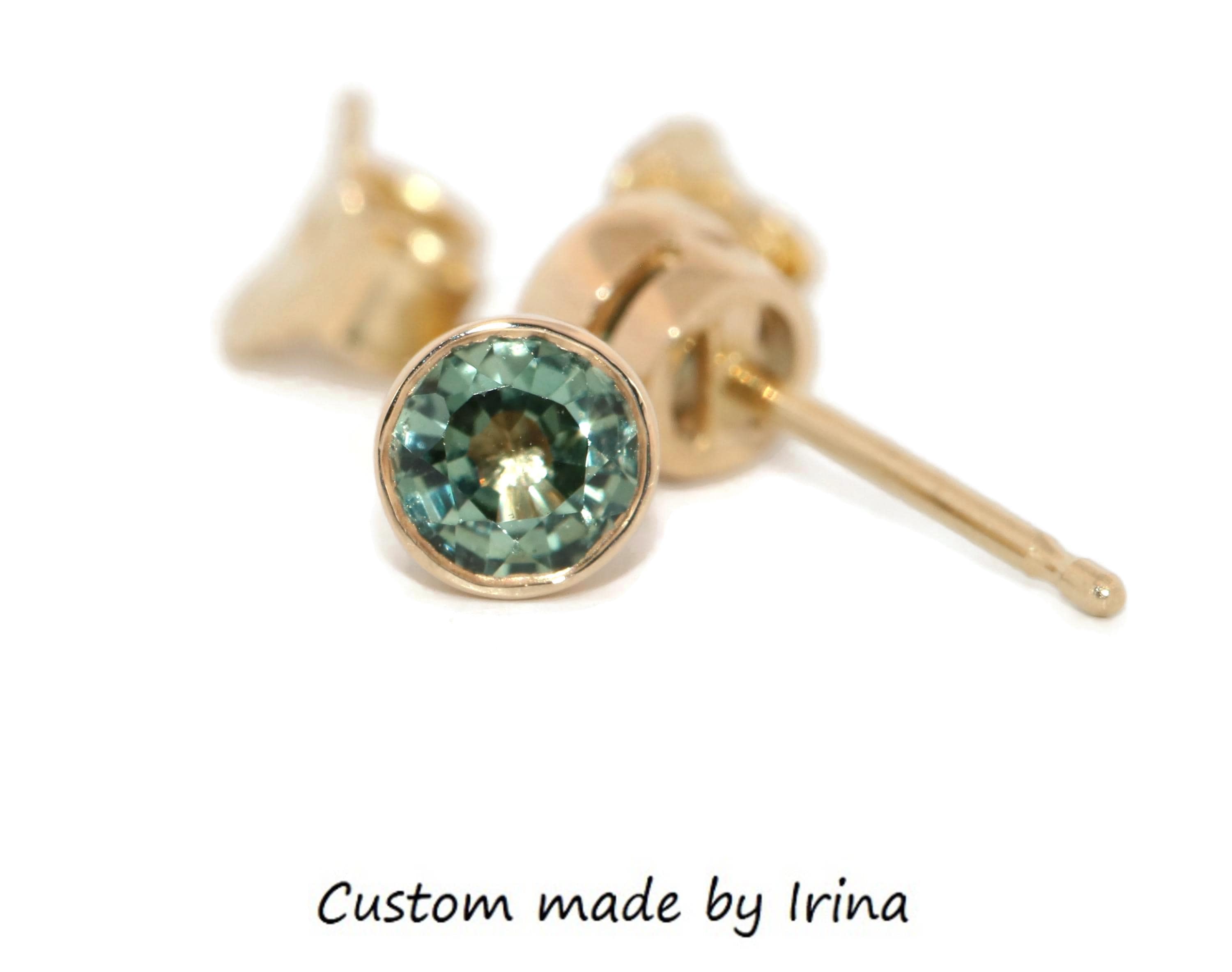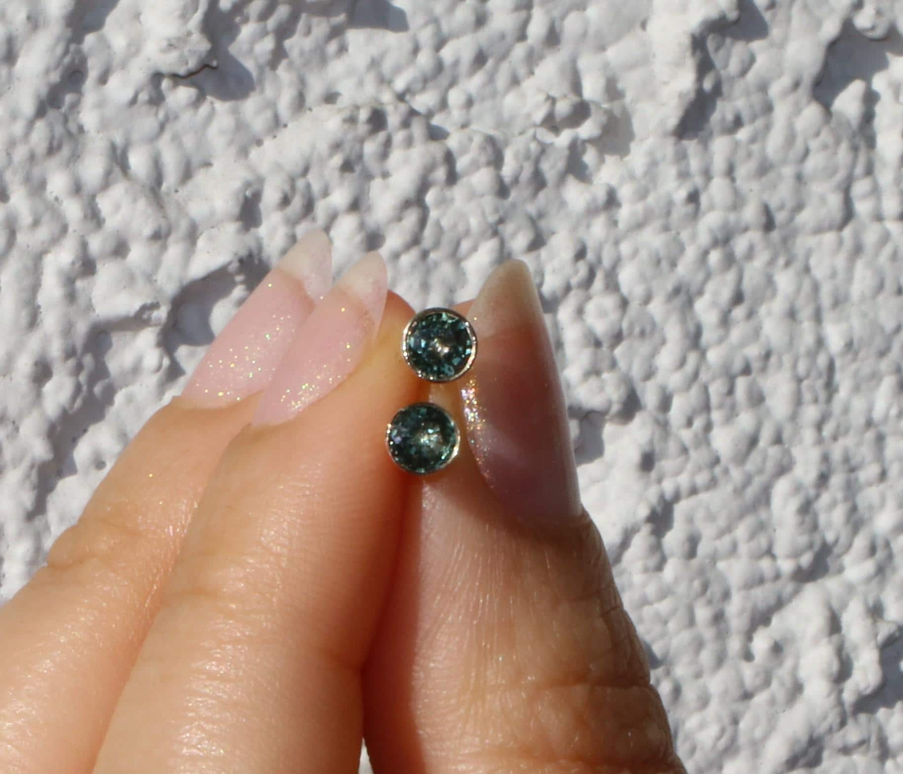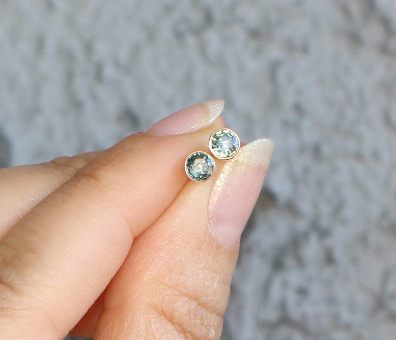 Bezel Frame Teal Blue Green Sapphire stud earrings. Ready to ship.