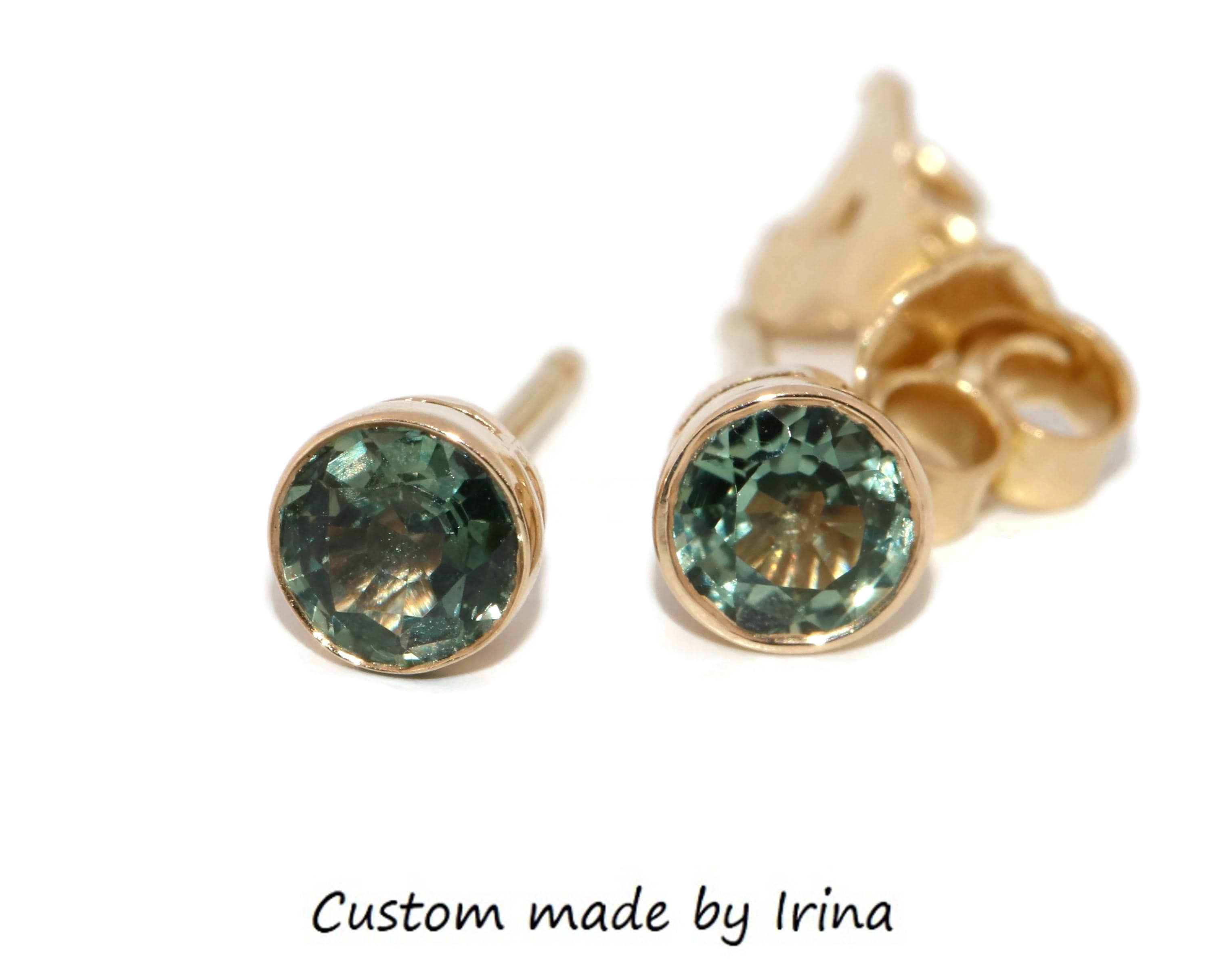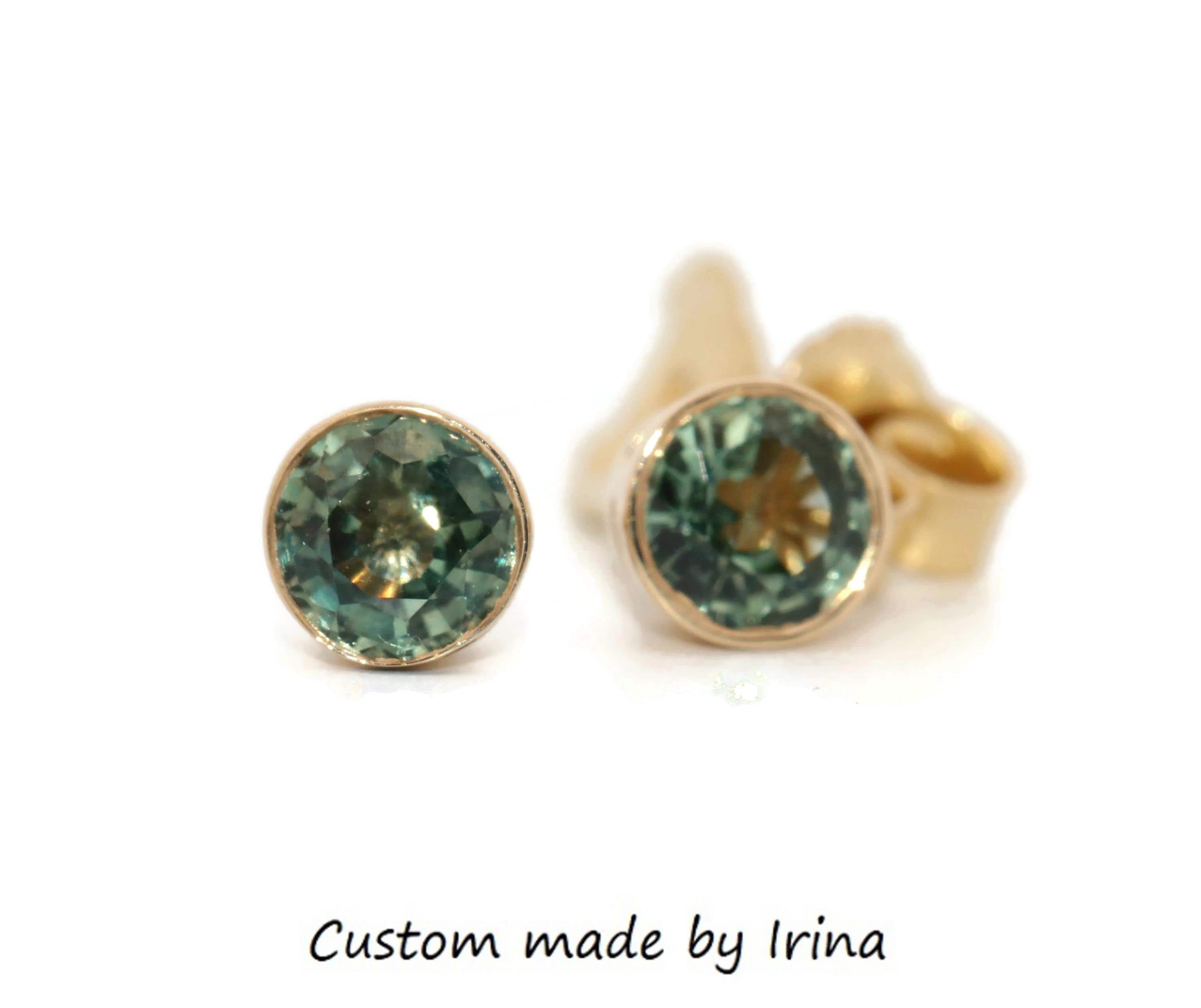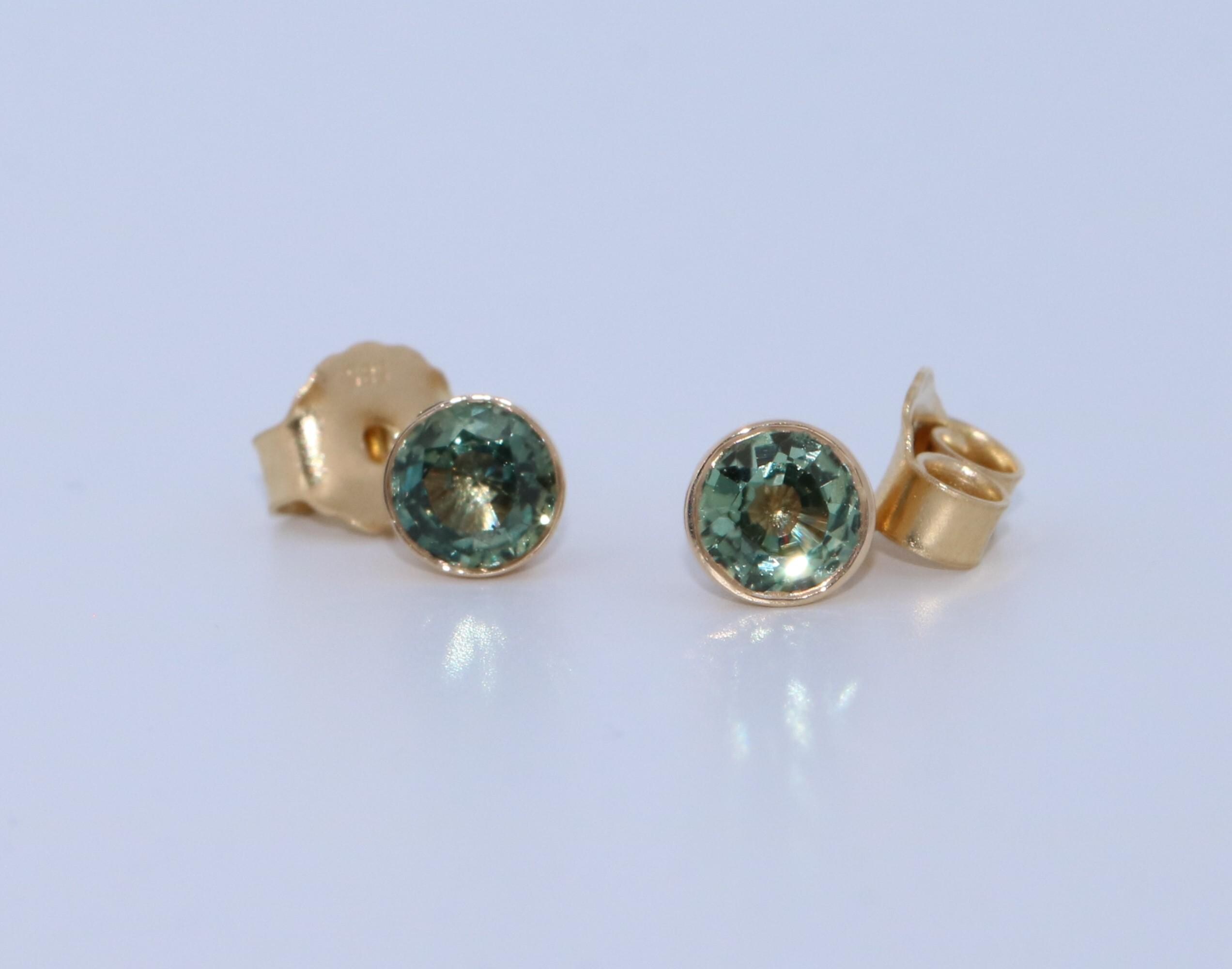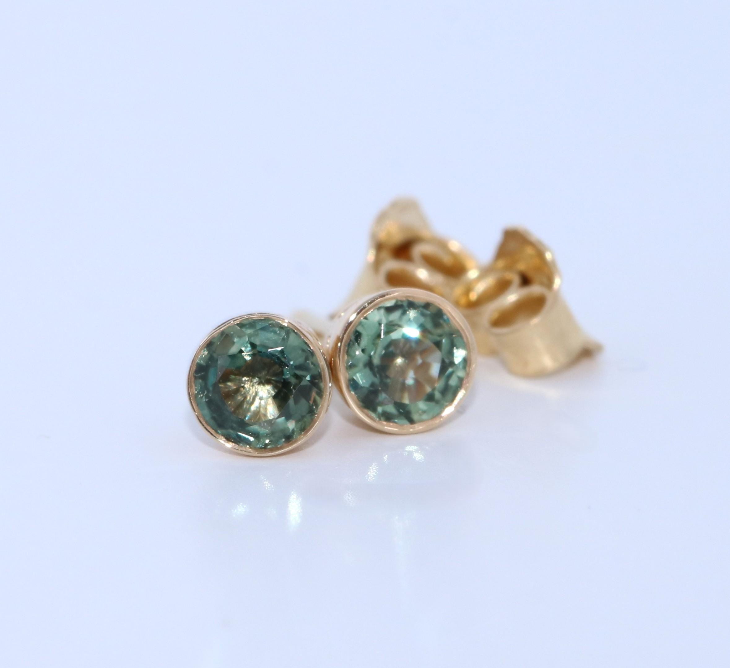 Bezel Frame Teal Blue Green Sapphire stud earrings. Ready to ship.