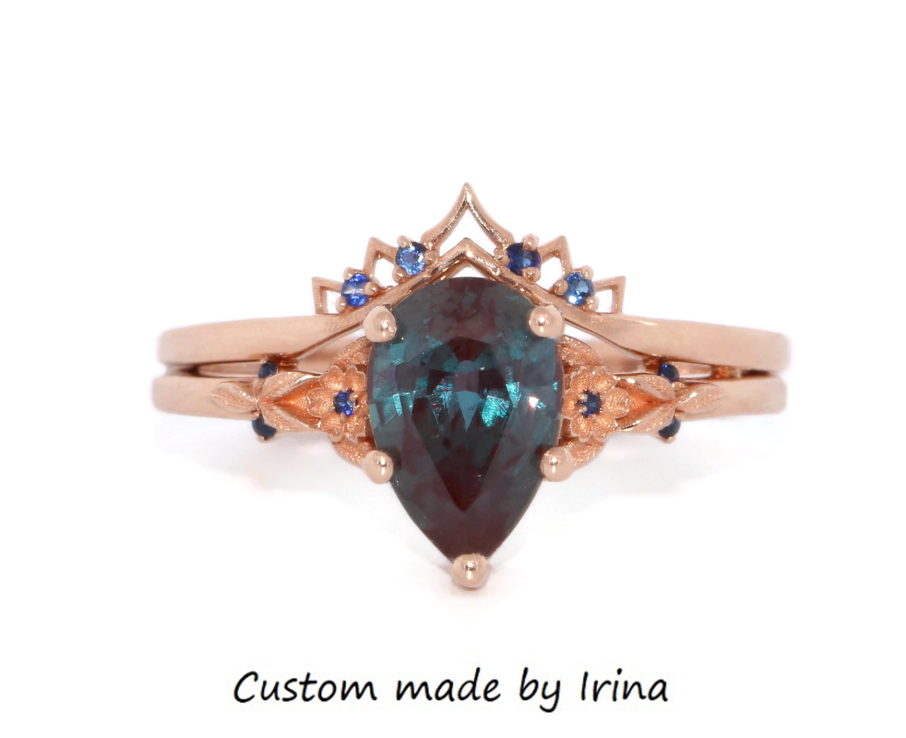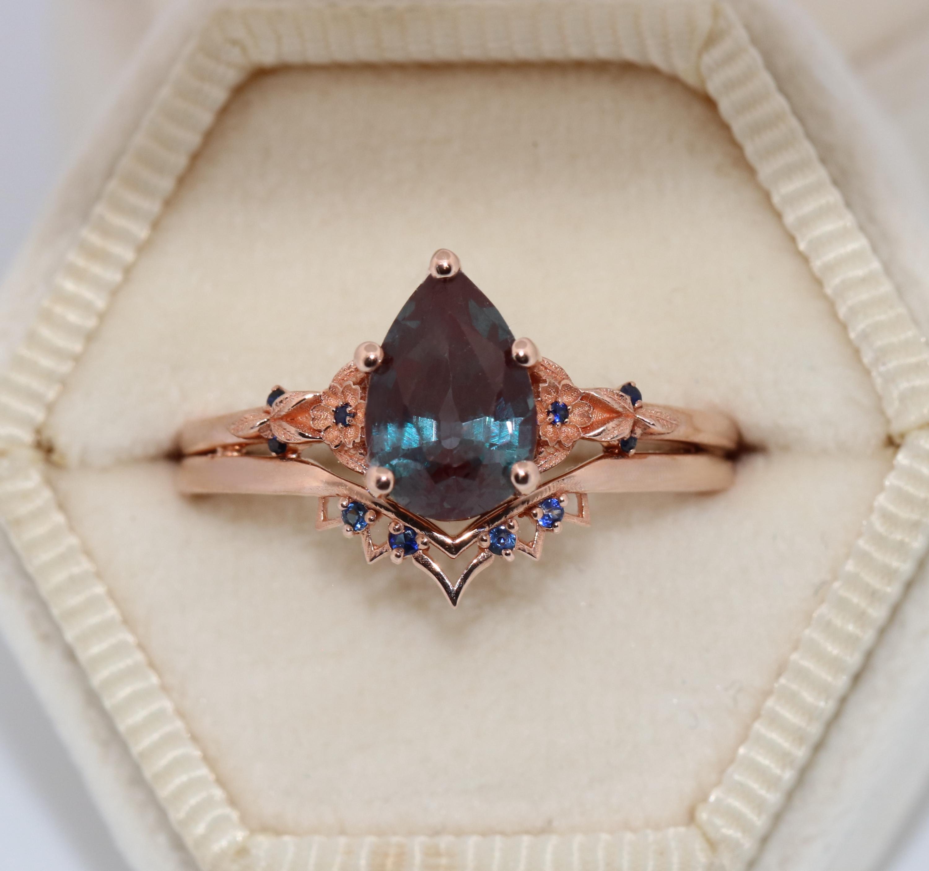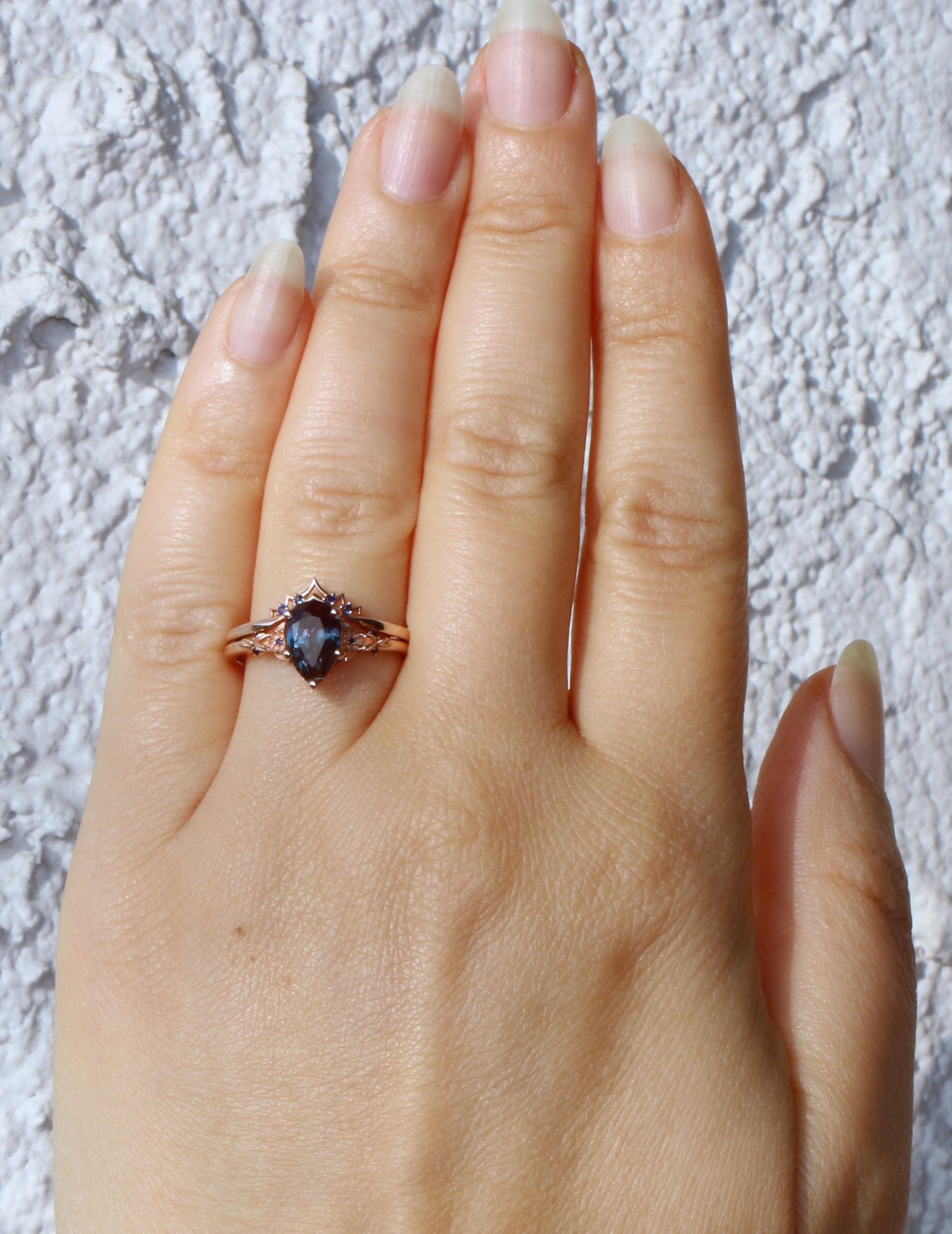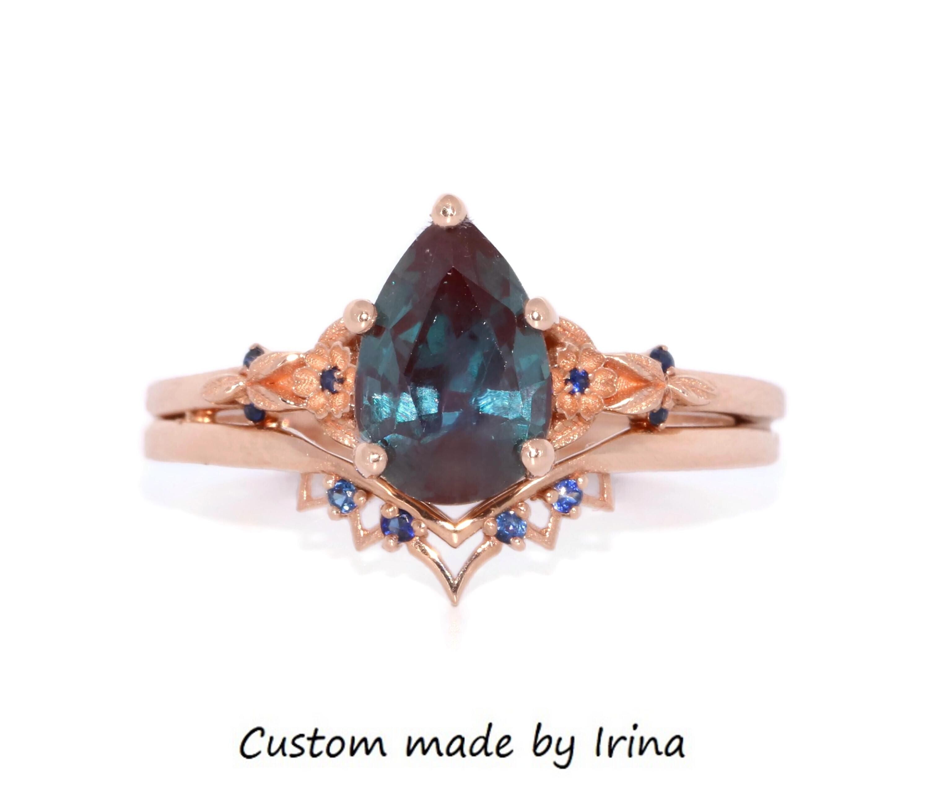 Center stone: Pear lab alexandrite approx. 9 mm by 6 mm