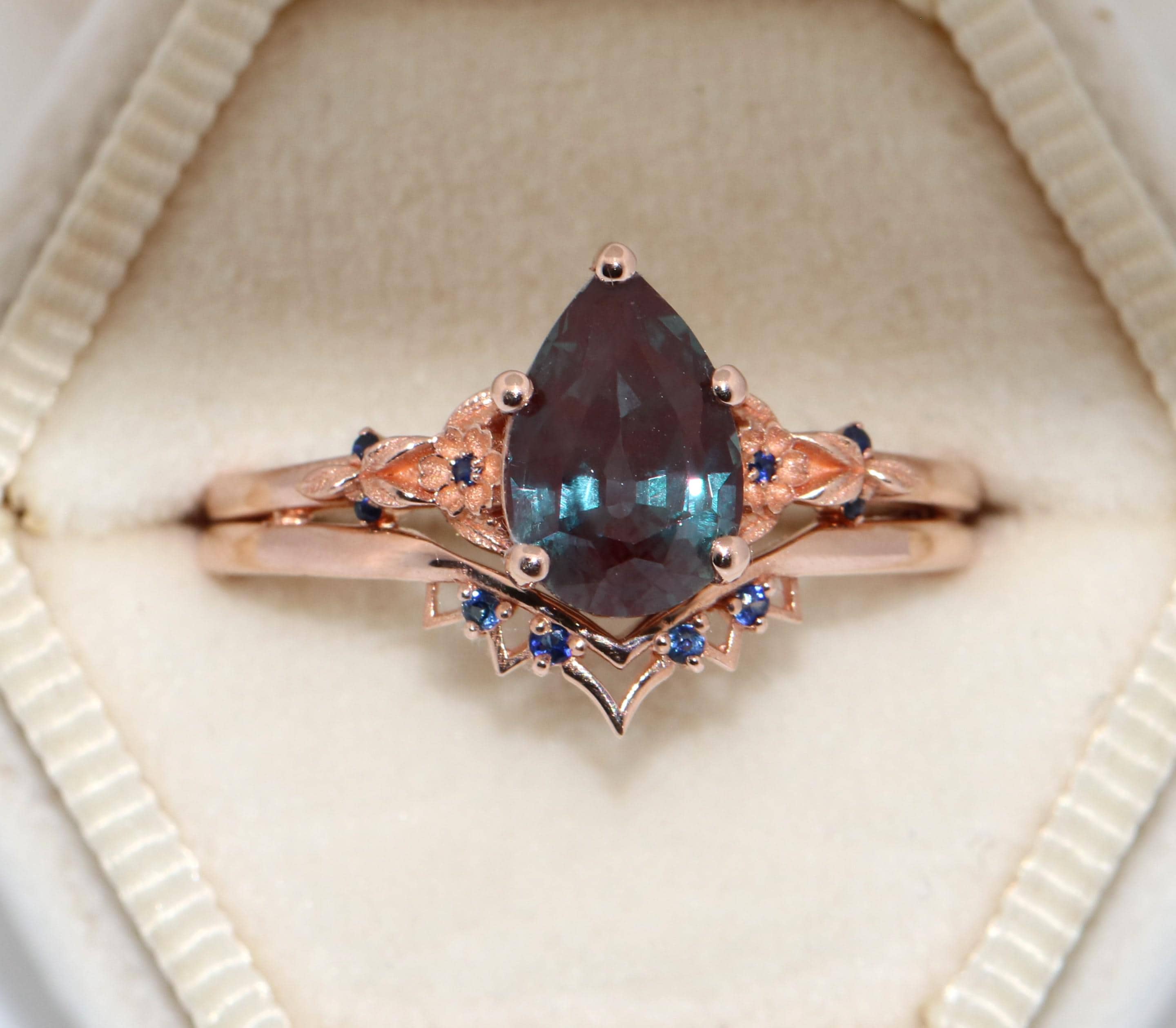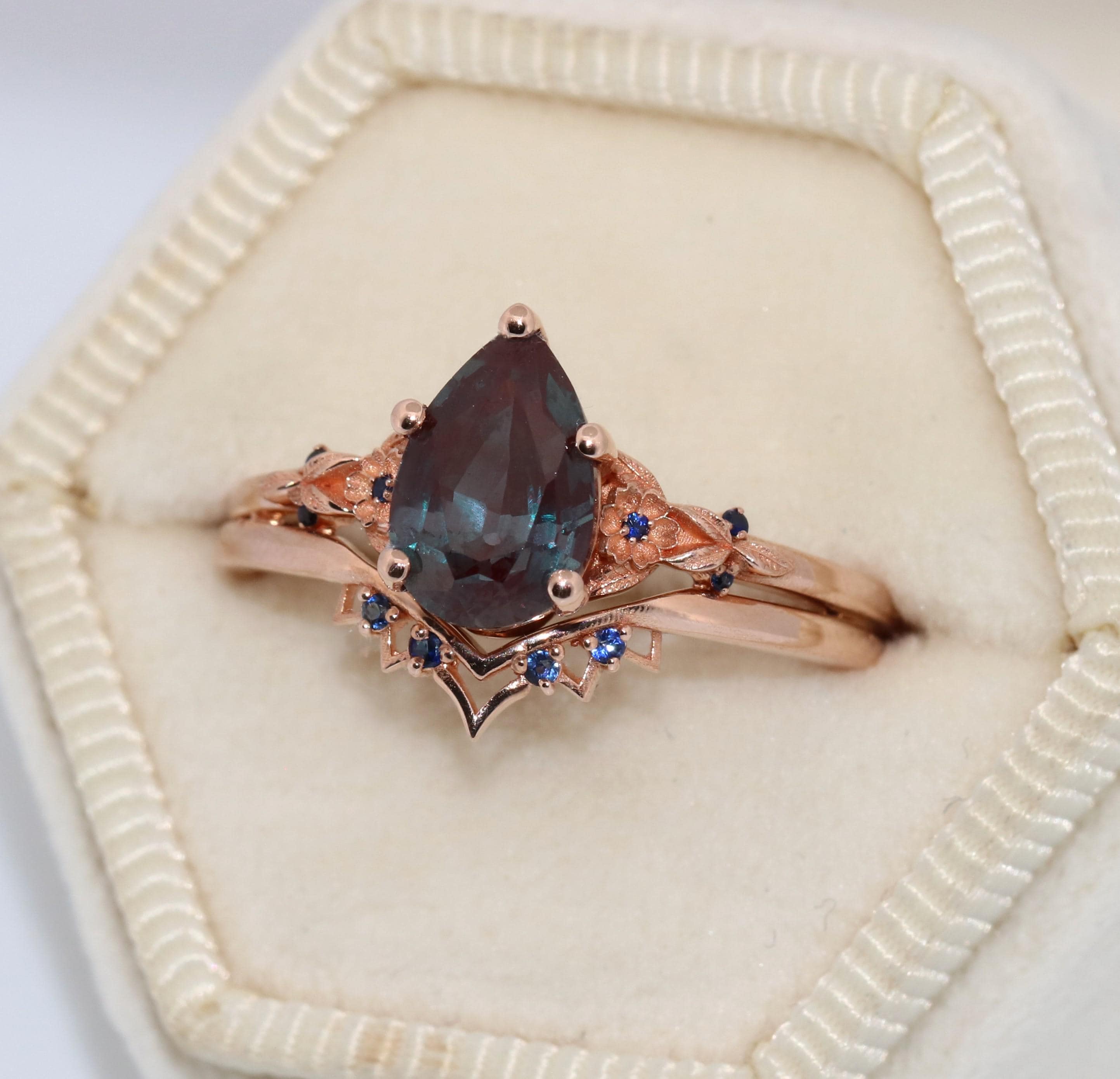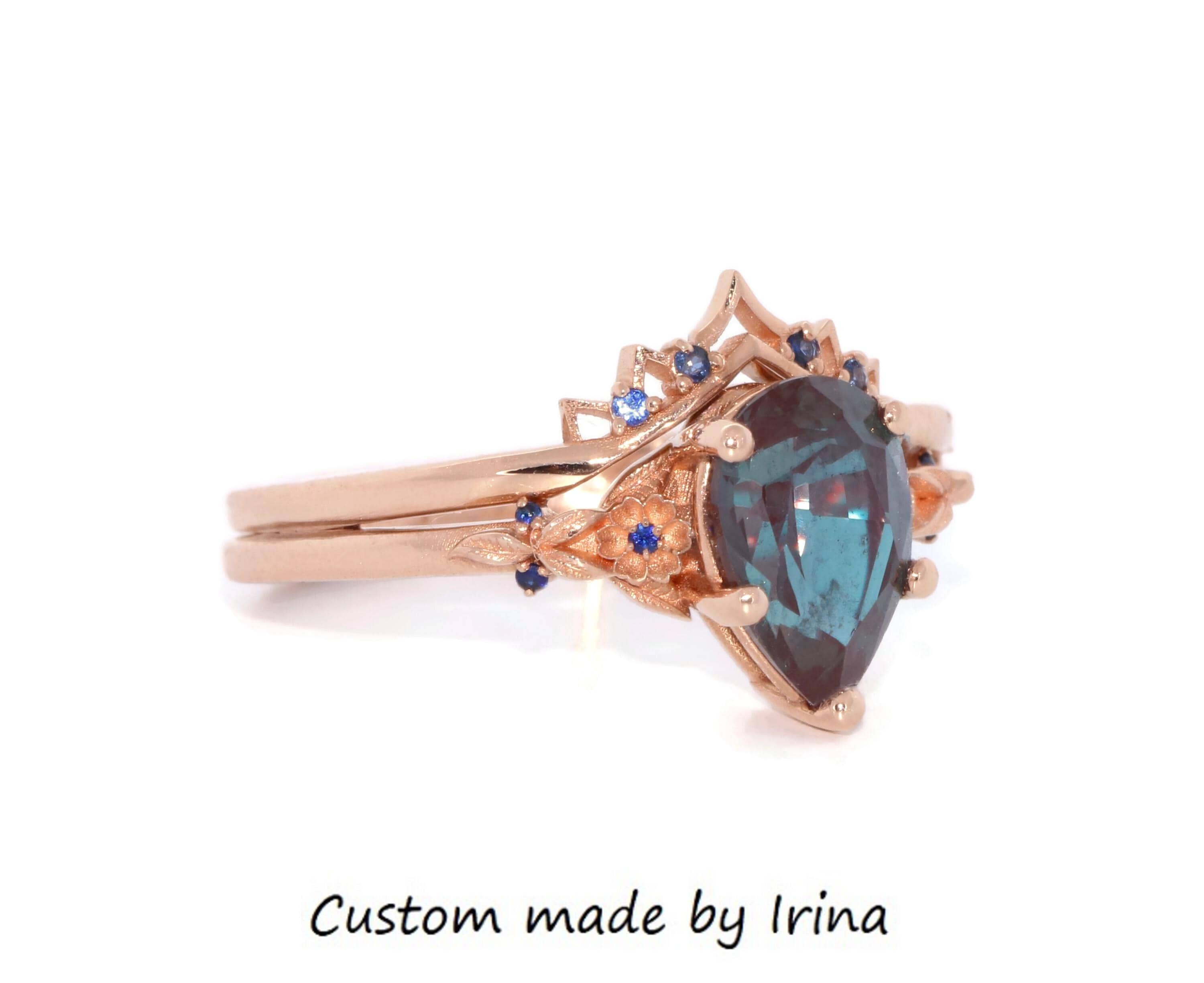 Center stone: Pear lab alexandrite approx. 9 mm by 6 mm