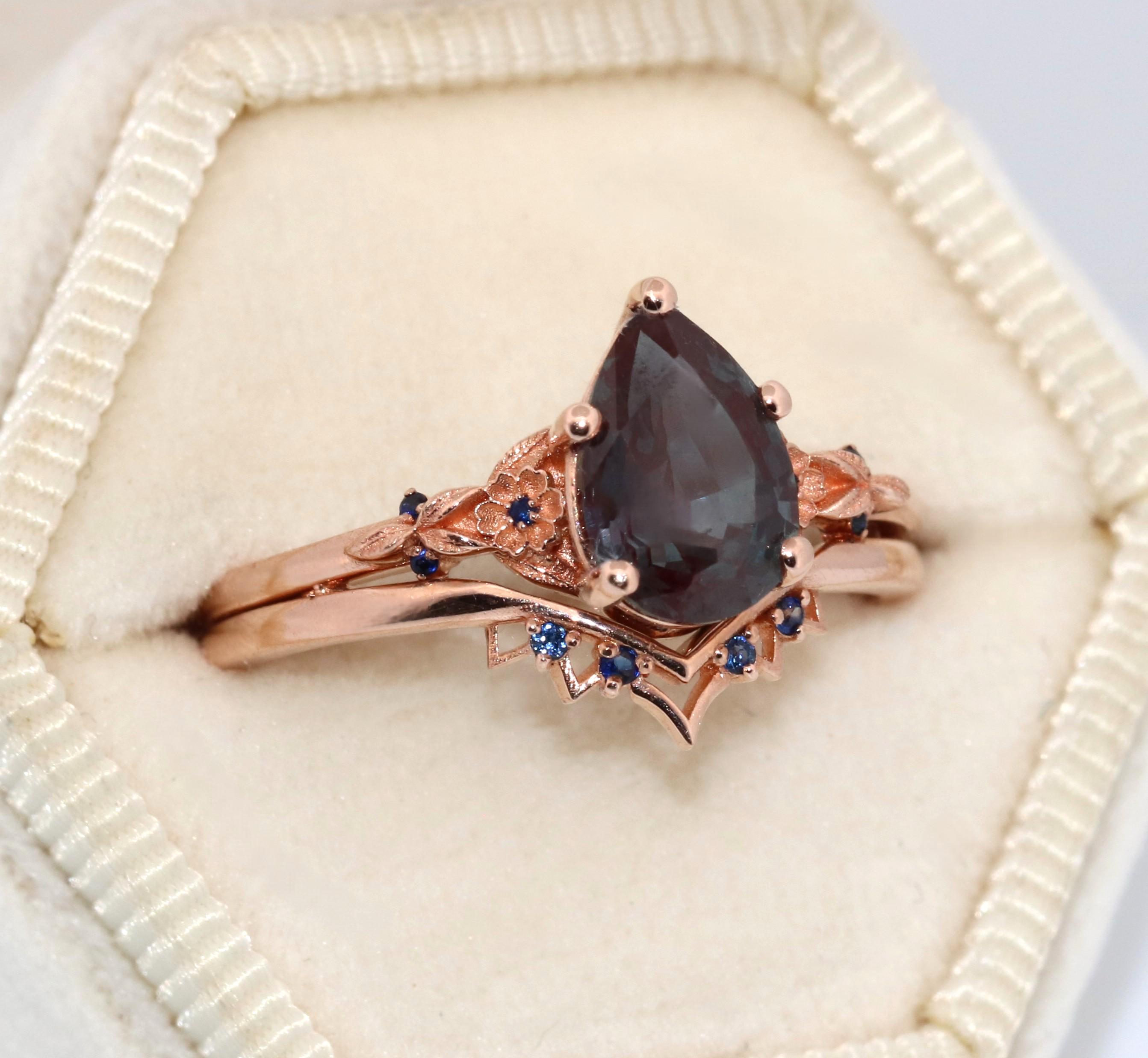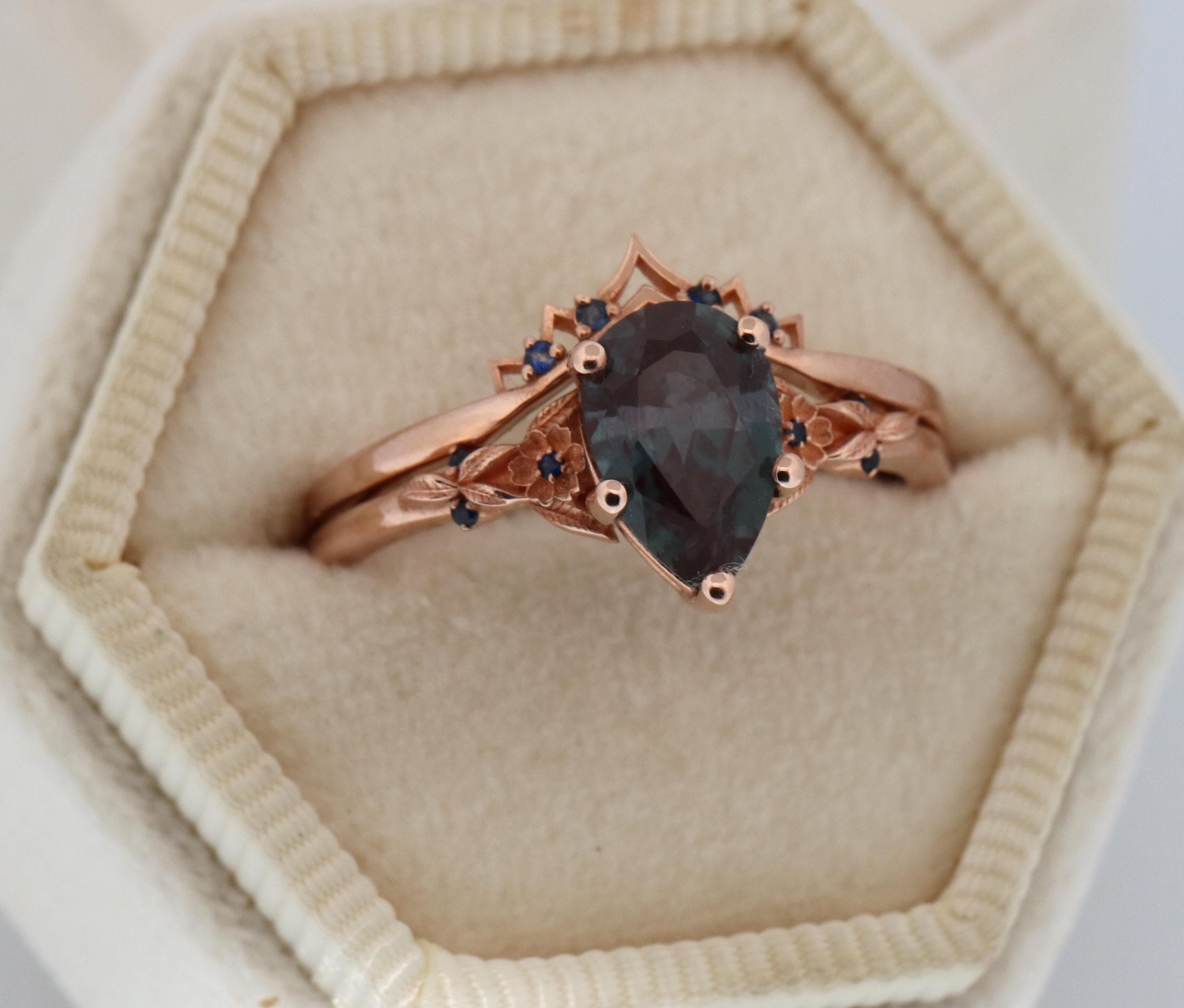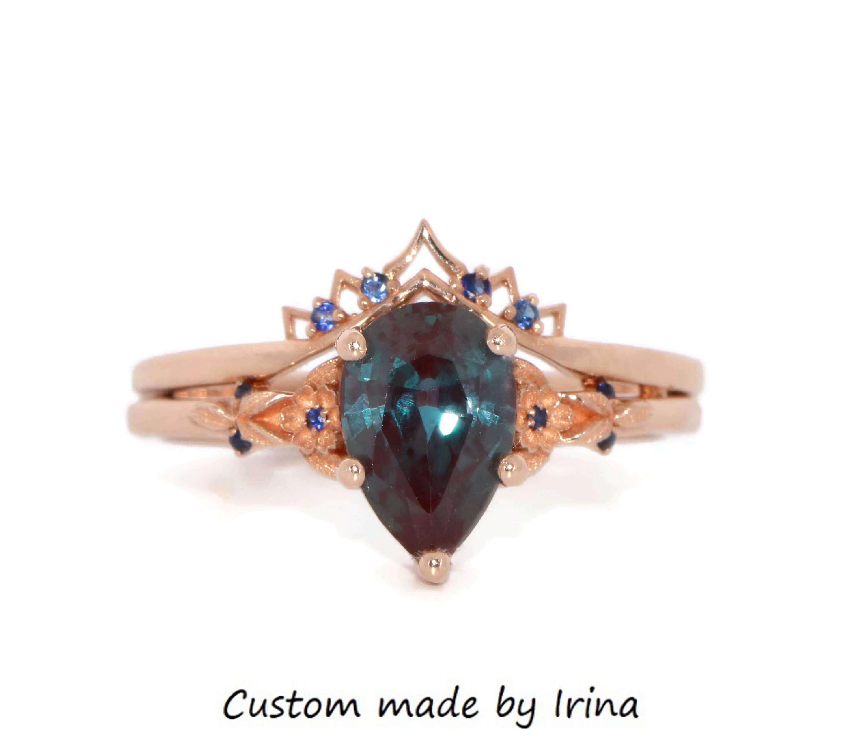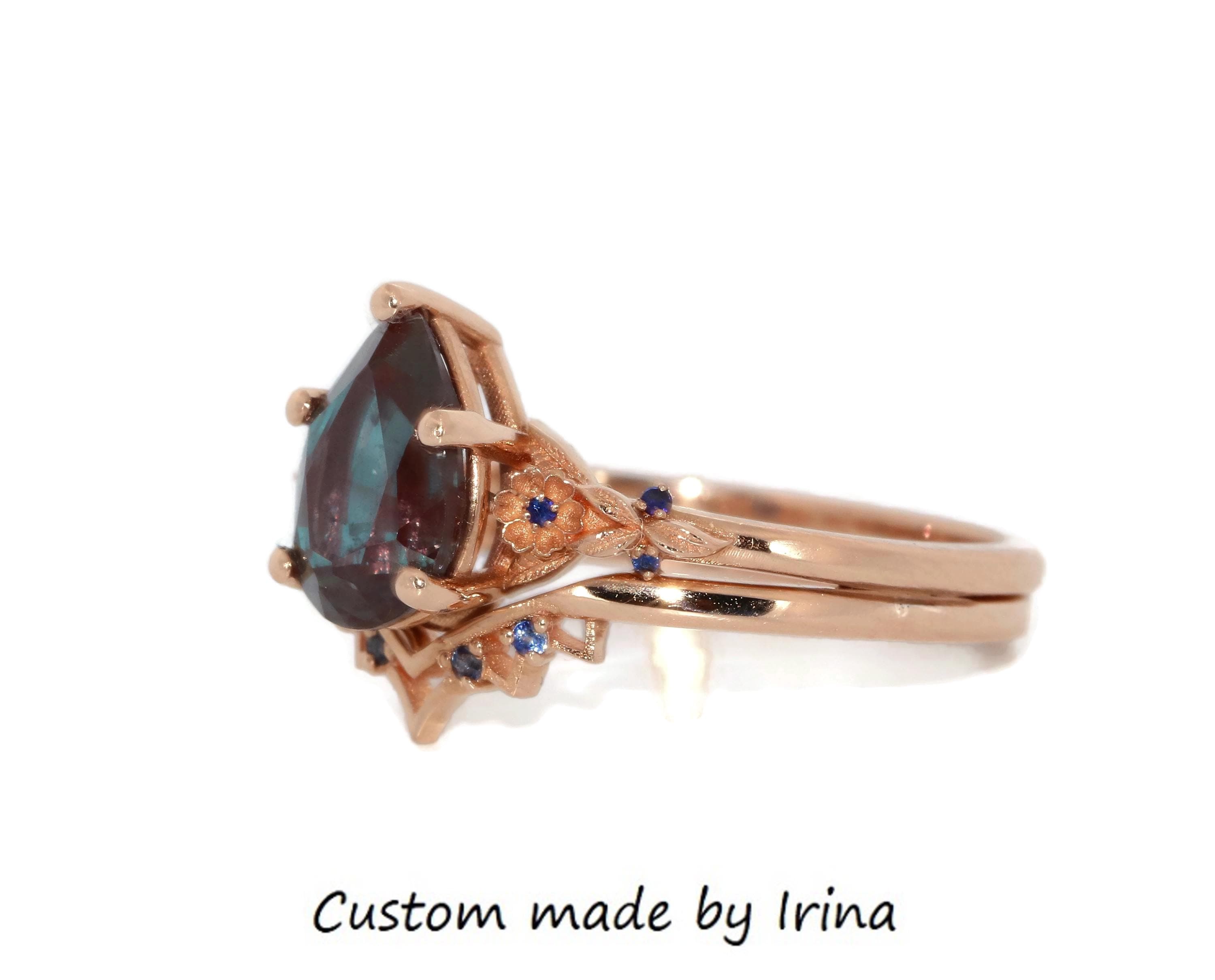 Center stone: Pear lab alexandrite approx. 9 mm by 6 mm