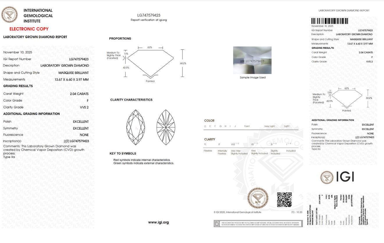 Center Stone: 2.04 carat IGI Certified Lab Diamond