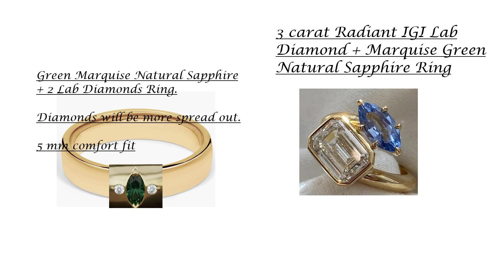 Stones: 3 ct IGI Certified Radiant Lab Diamond and 1 marquise green natural sapphire ring.