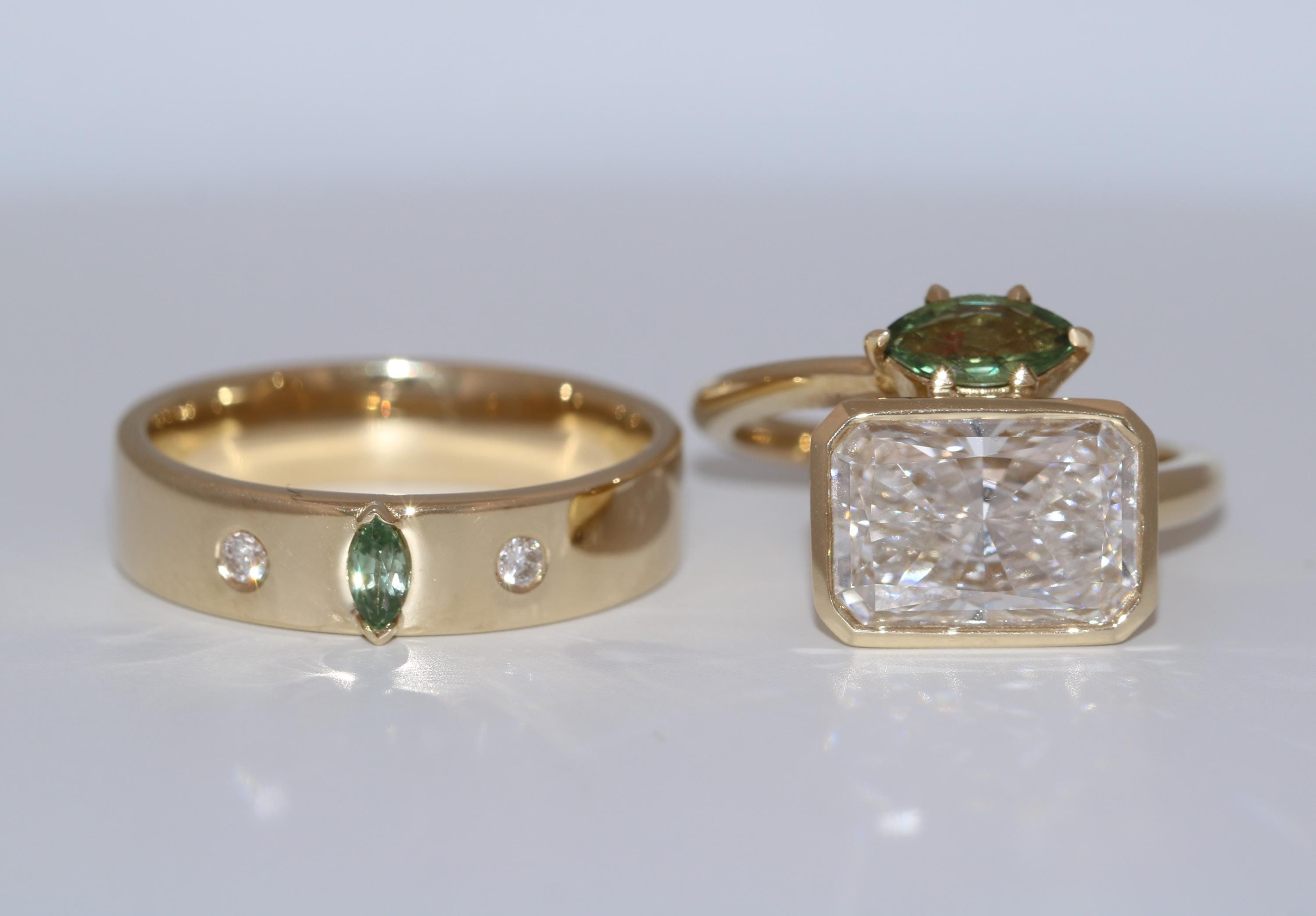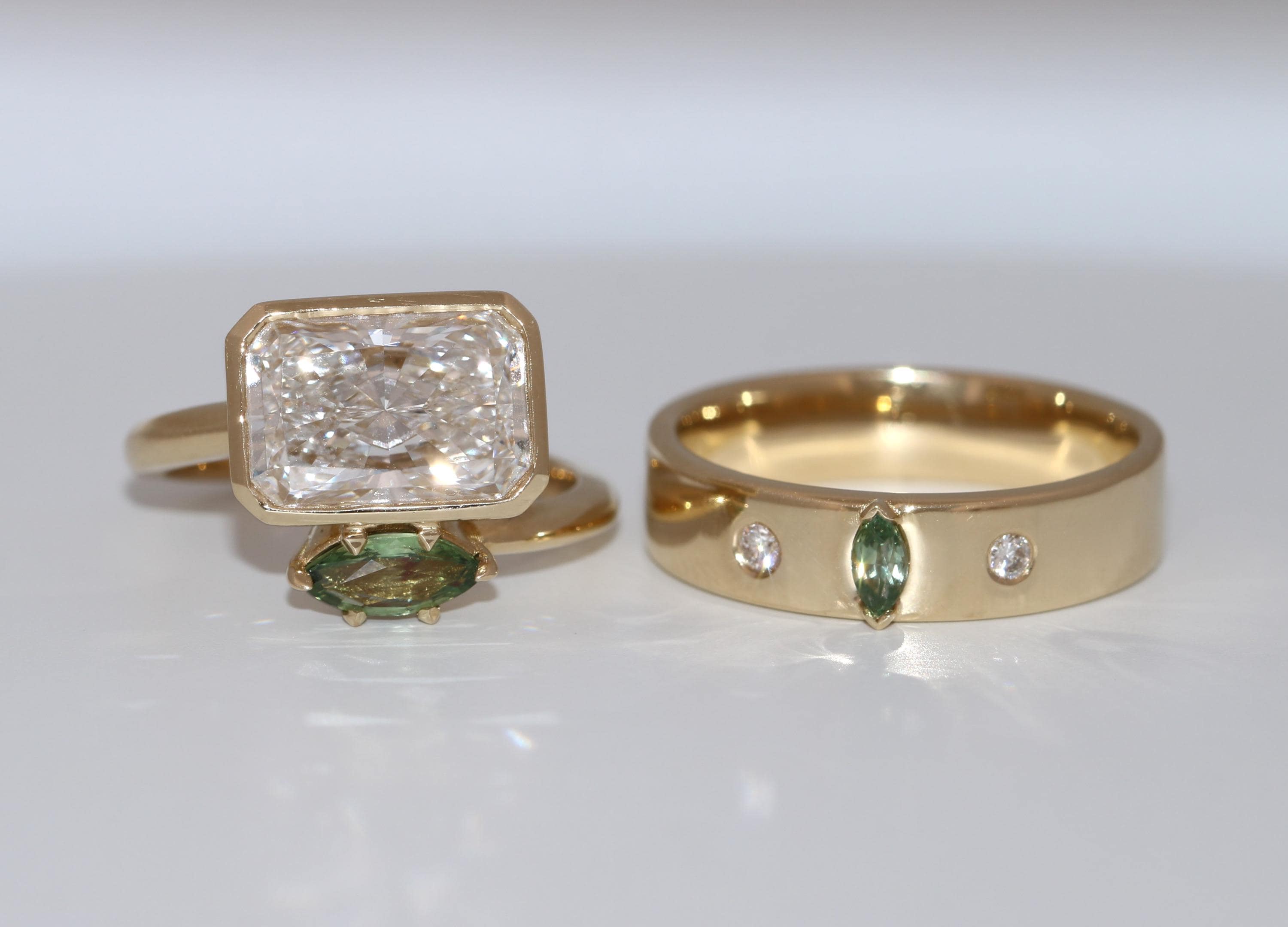 Stones: 3 ct IGI Certified Radiant Lab Diamond and 1 marquise green natural sapphire ring.