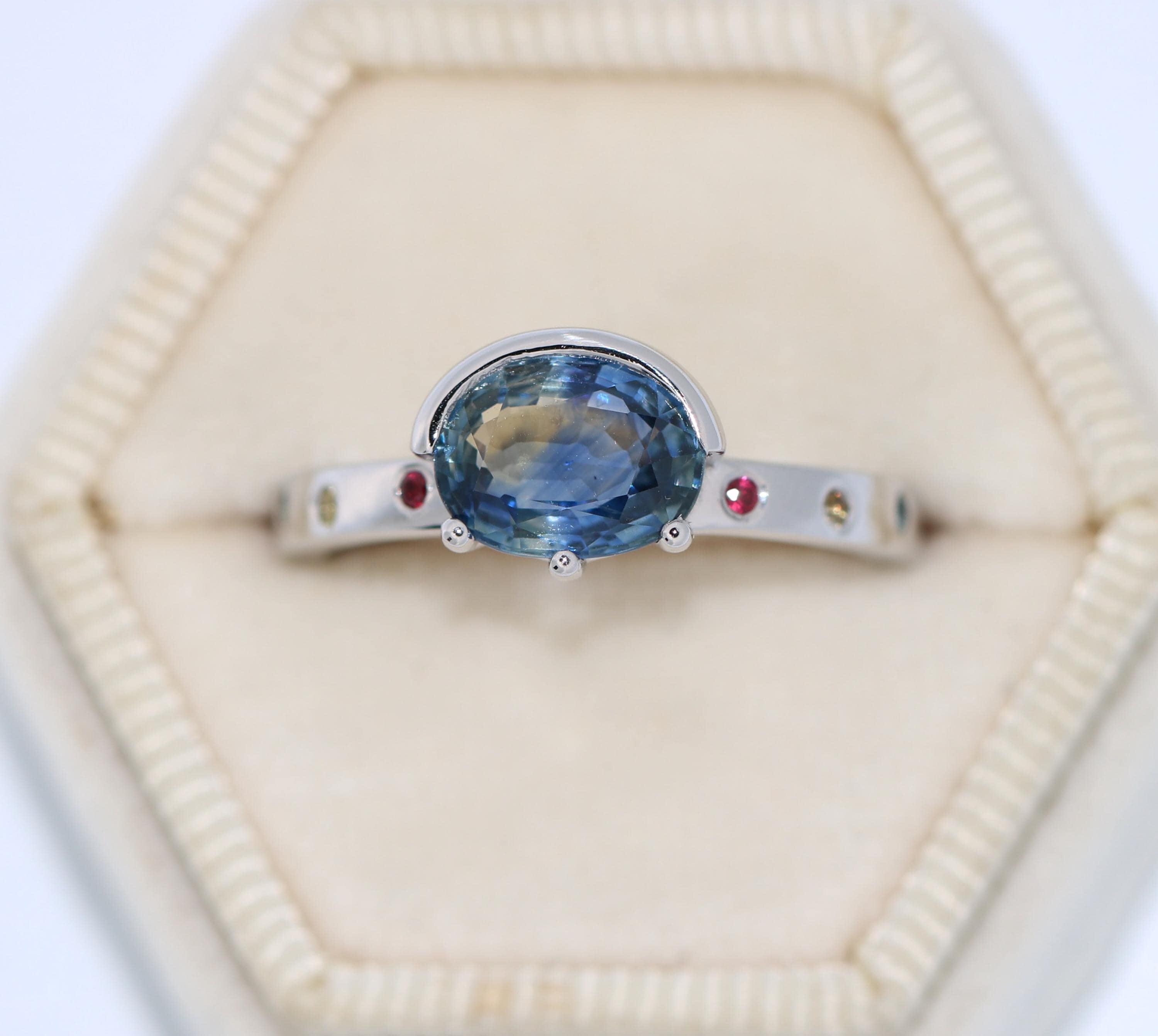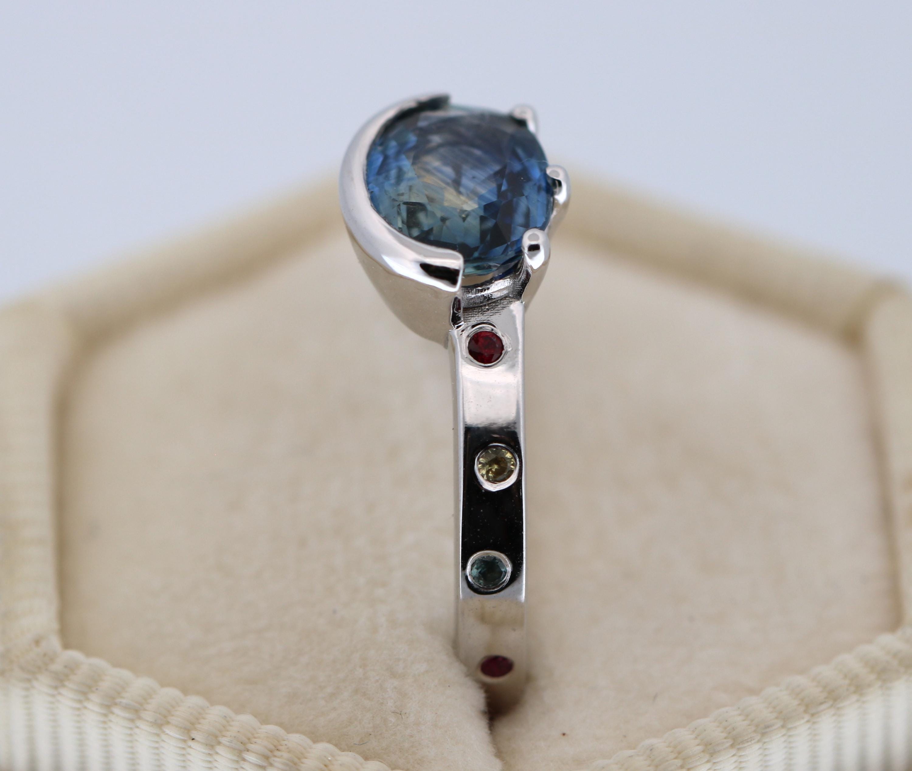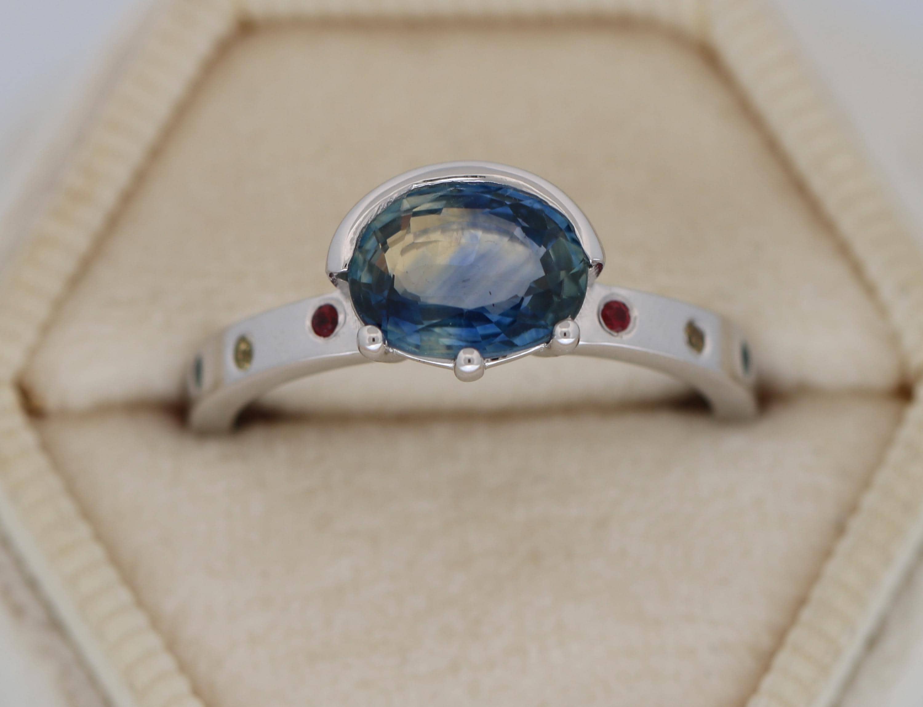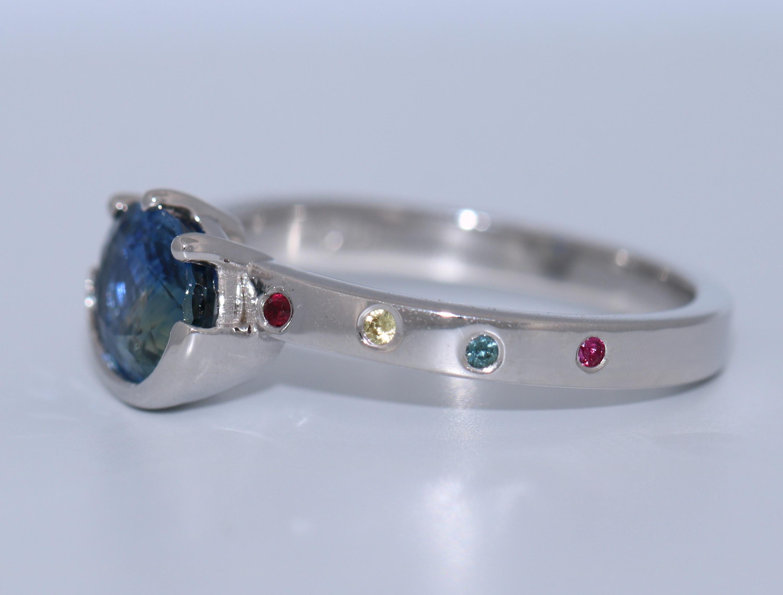 8 natural stones: 2 ruby + 2 teal sapphires + 2 yellow sapphires + 2 pink sapphires (0.07 cwt.)