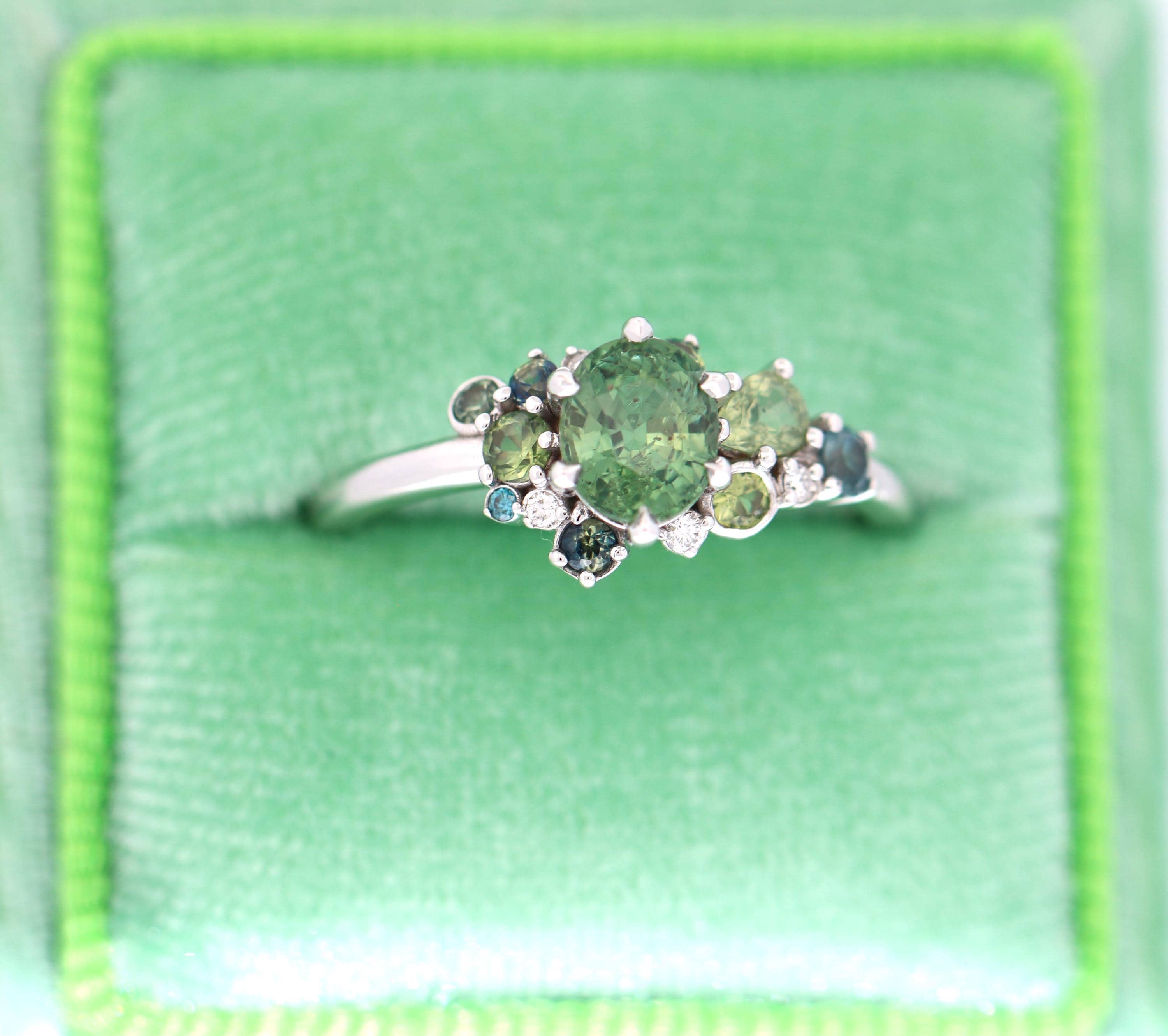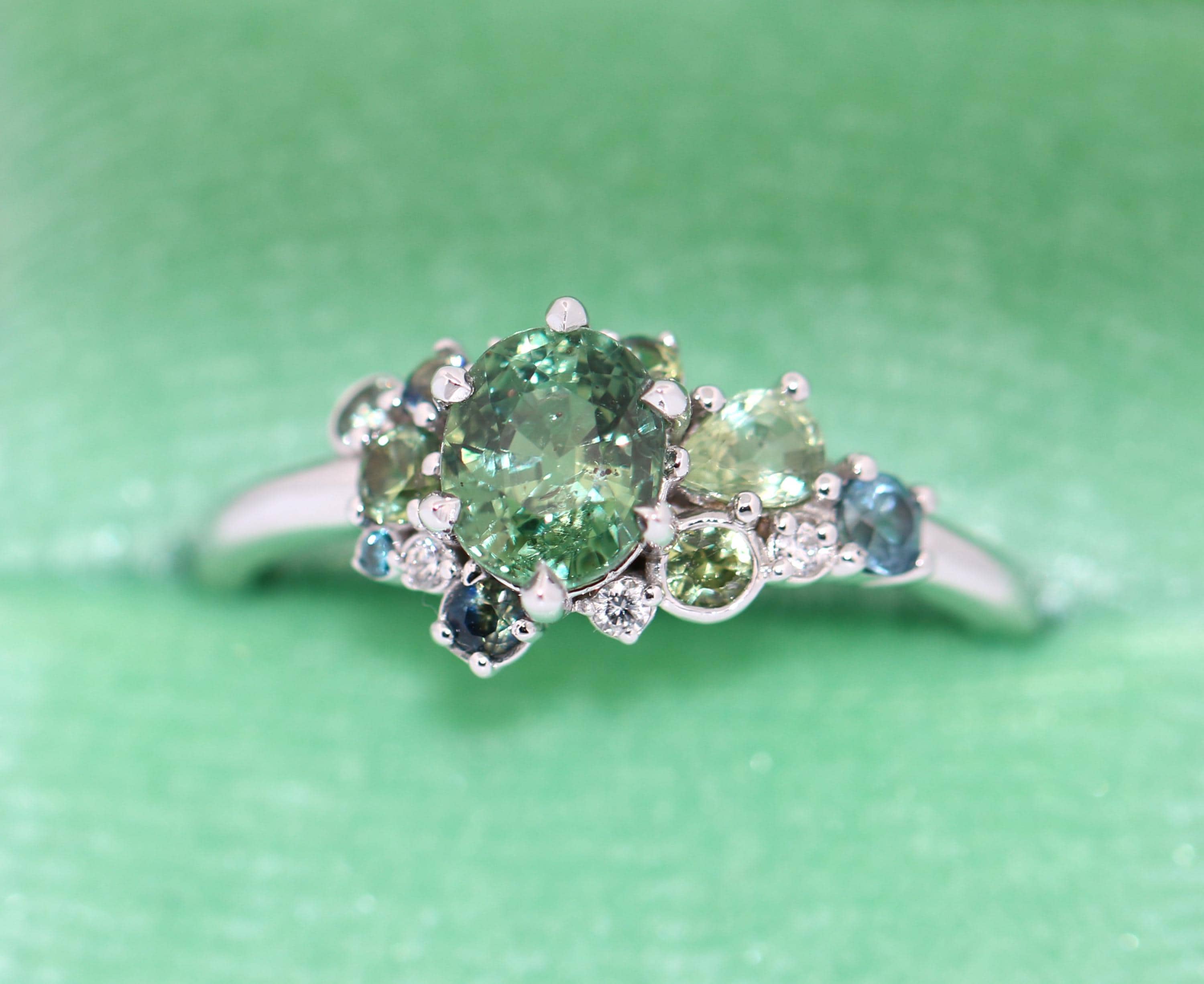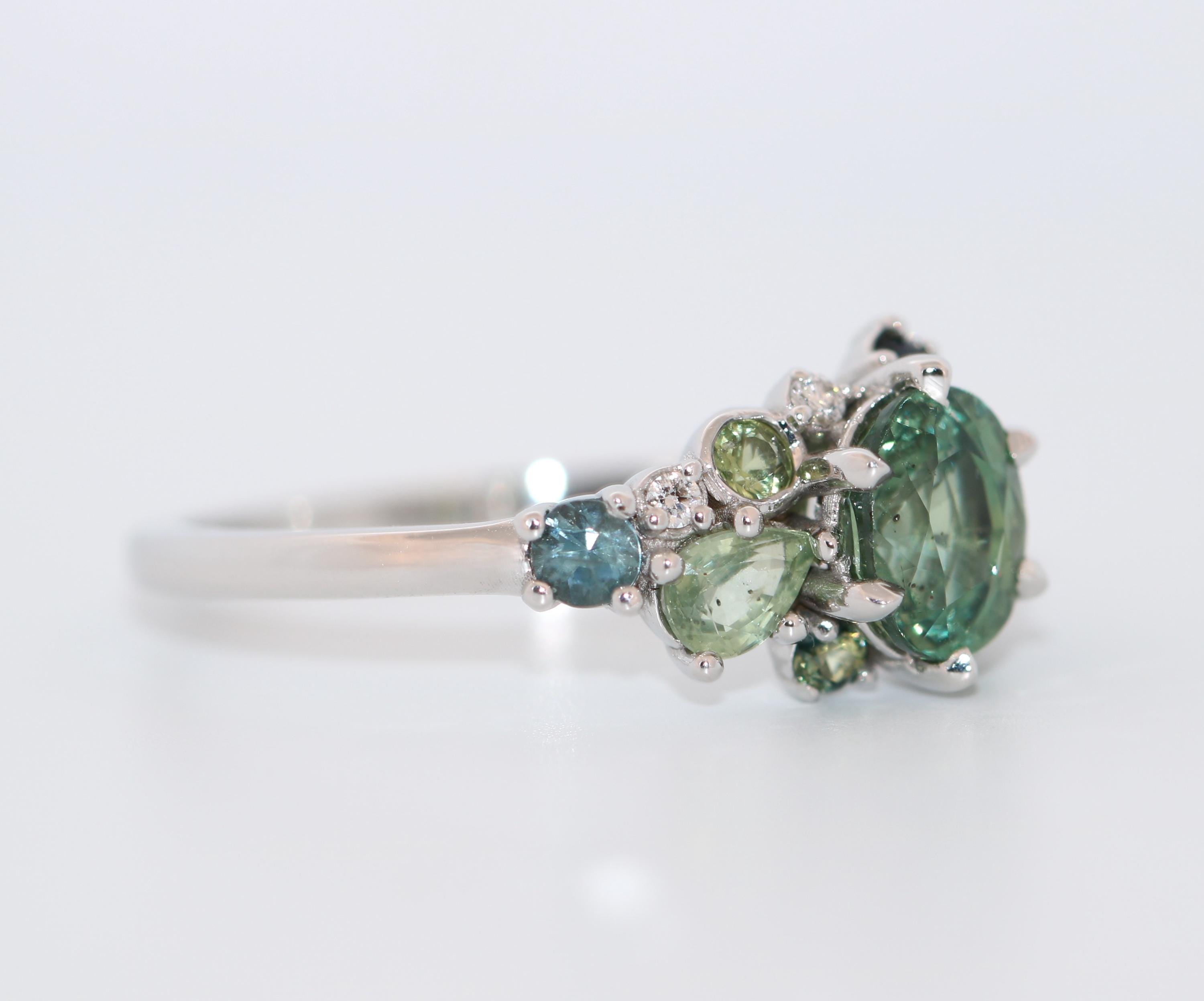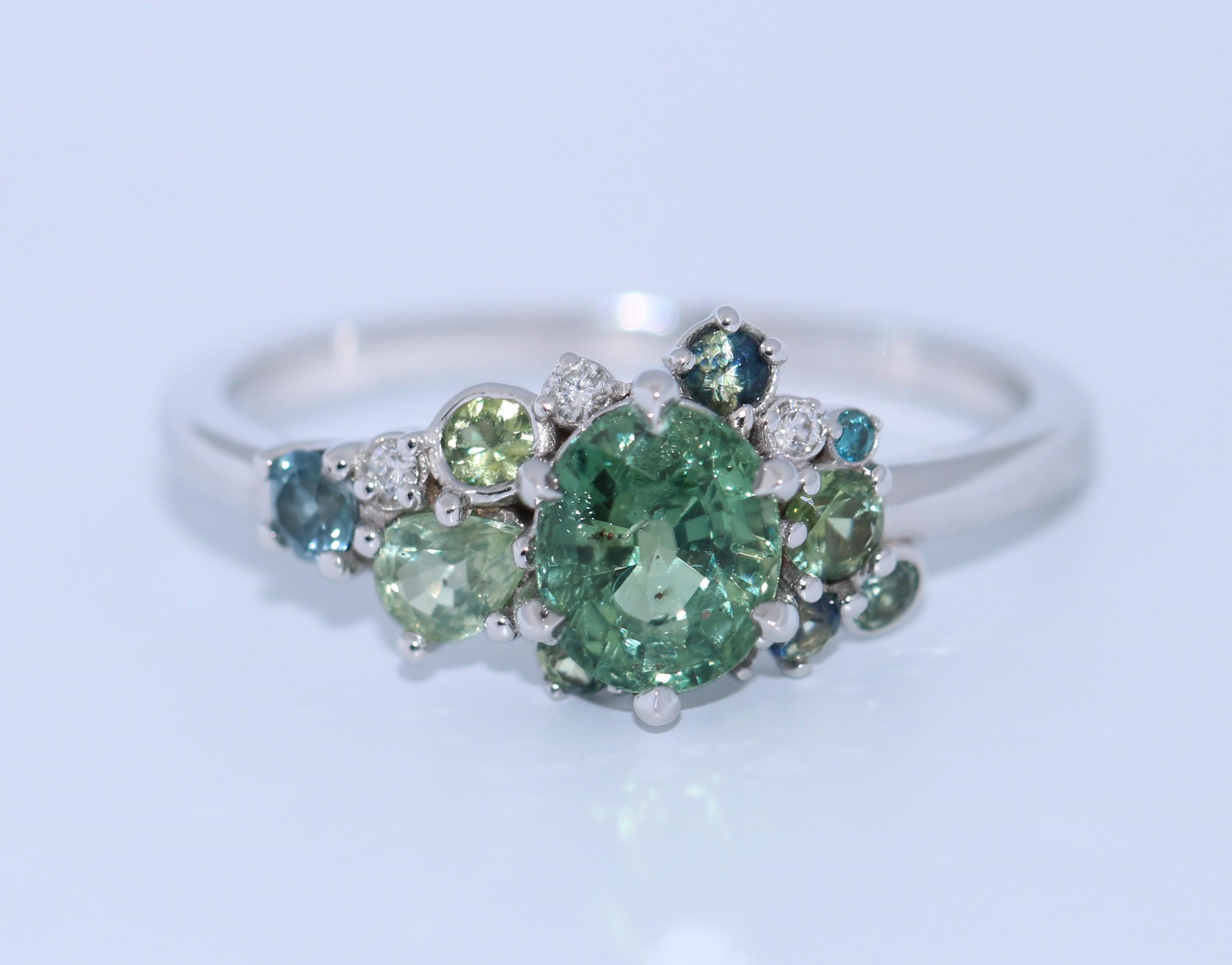Ombre cluster stones: teal blue green natural sapphires and diamonds
