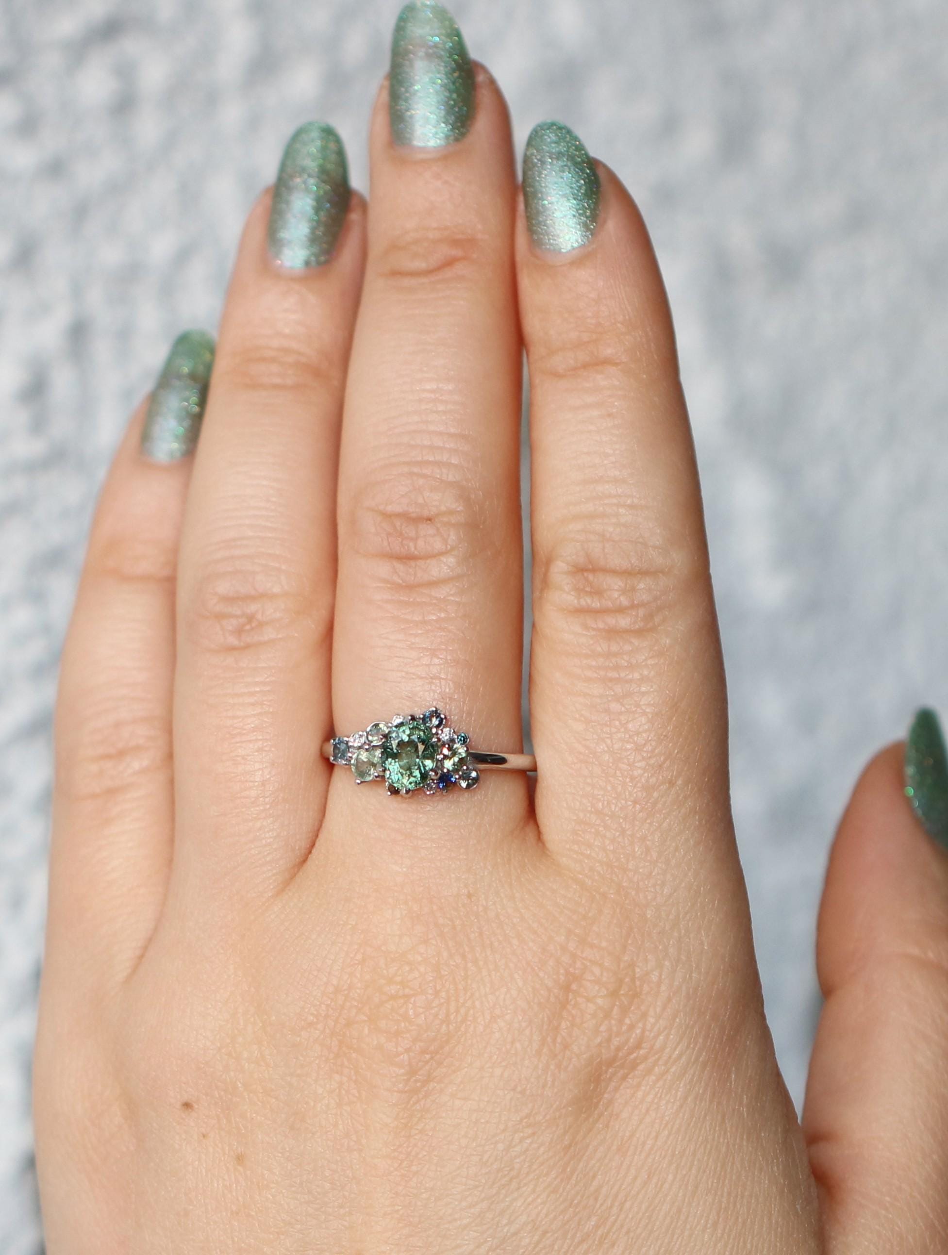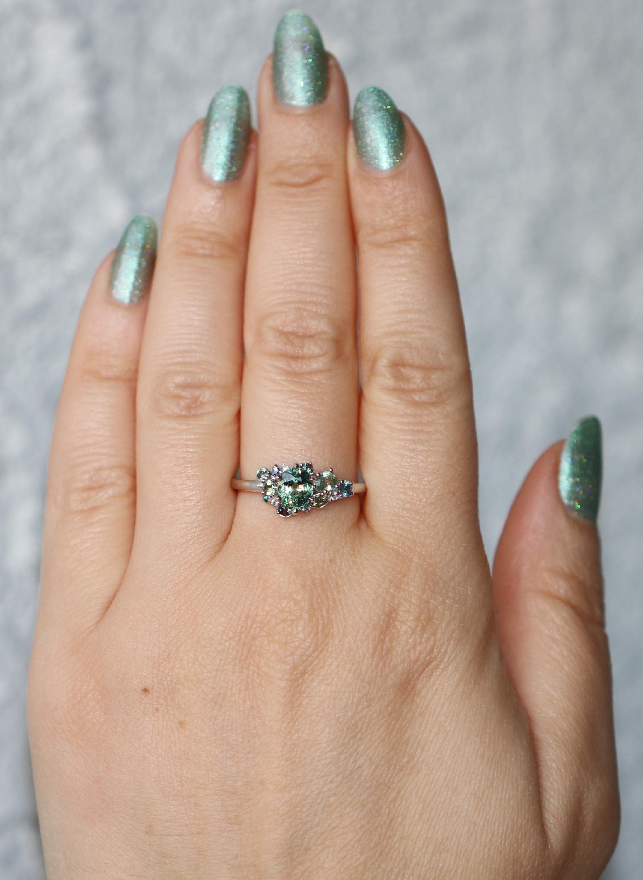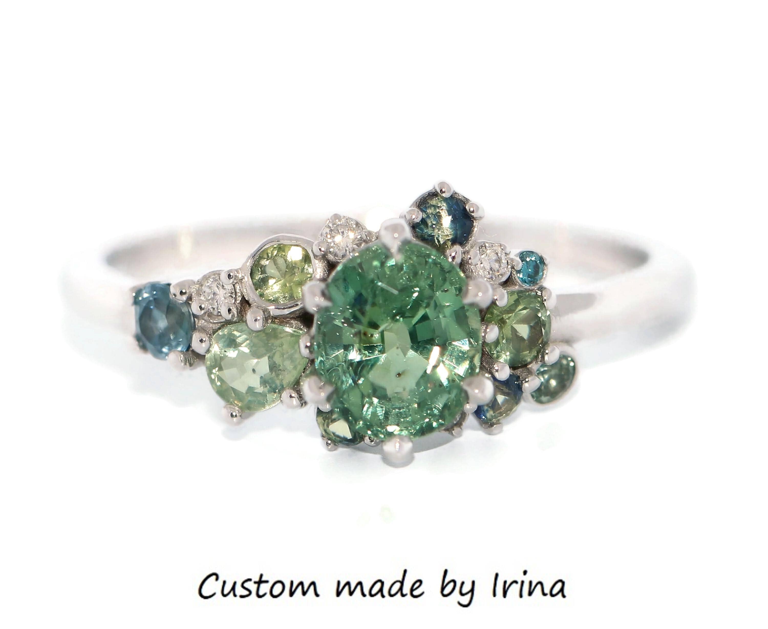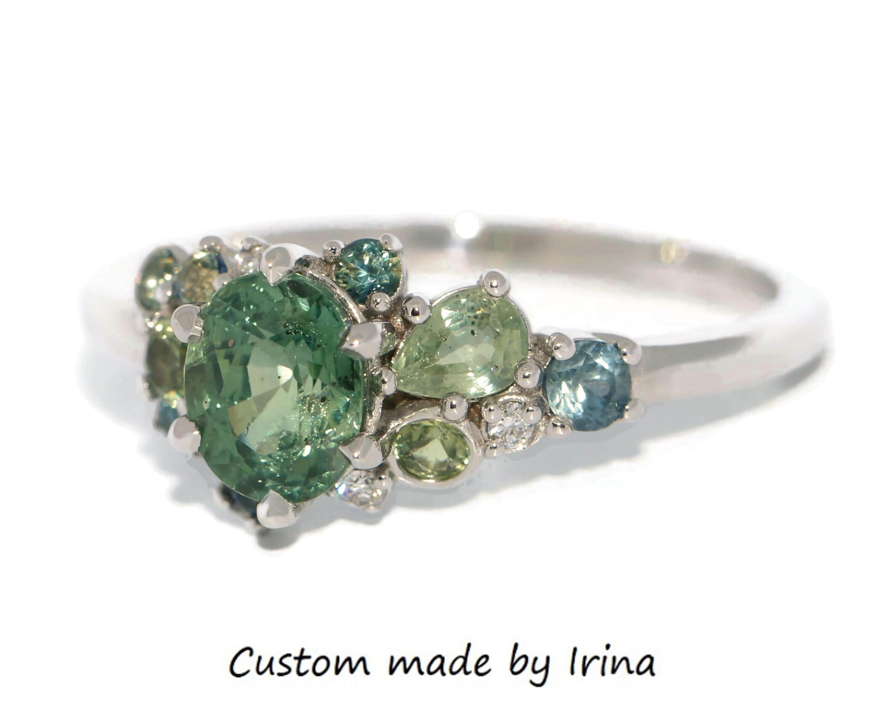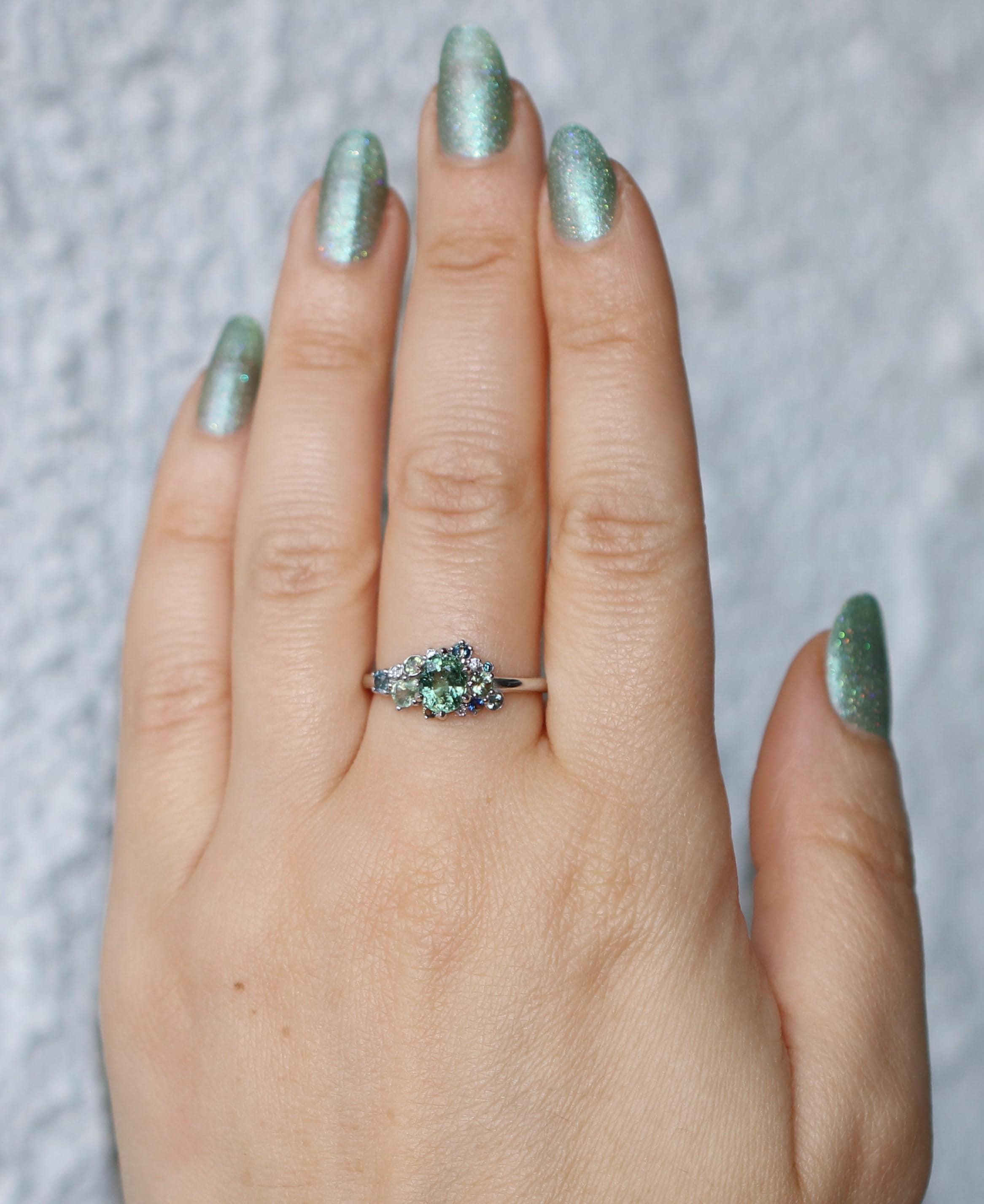 Ombre cluster stones: teal blue green natural sapphires and diamonds