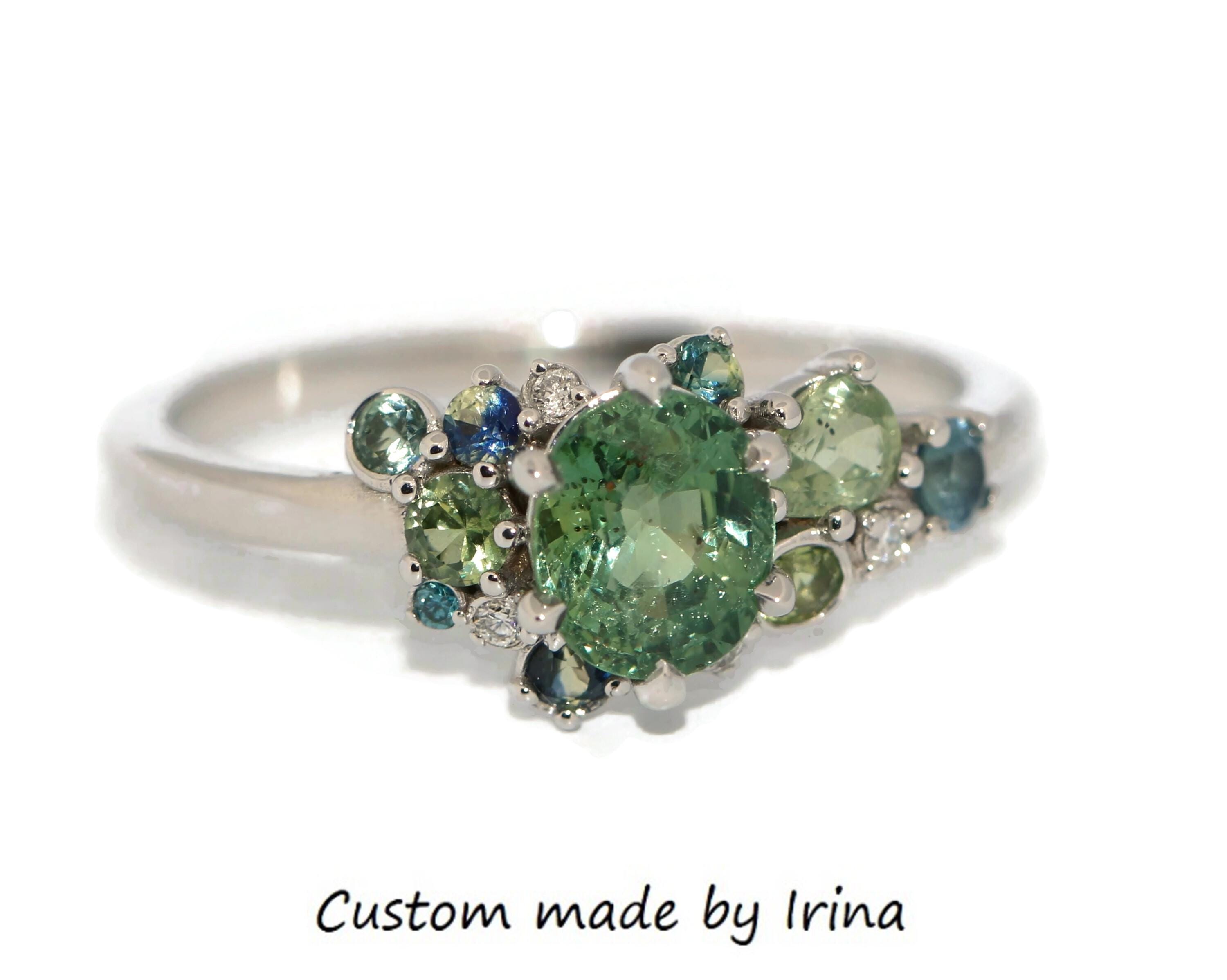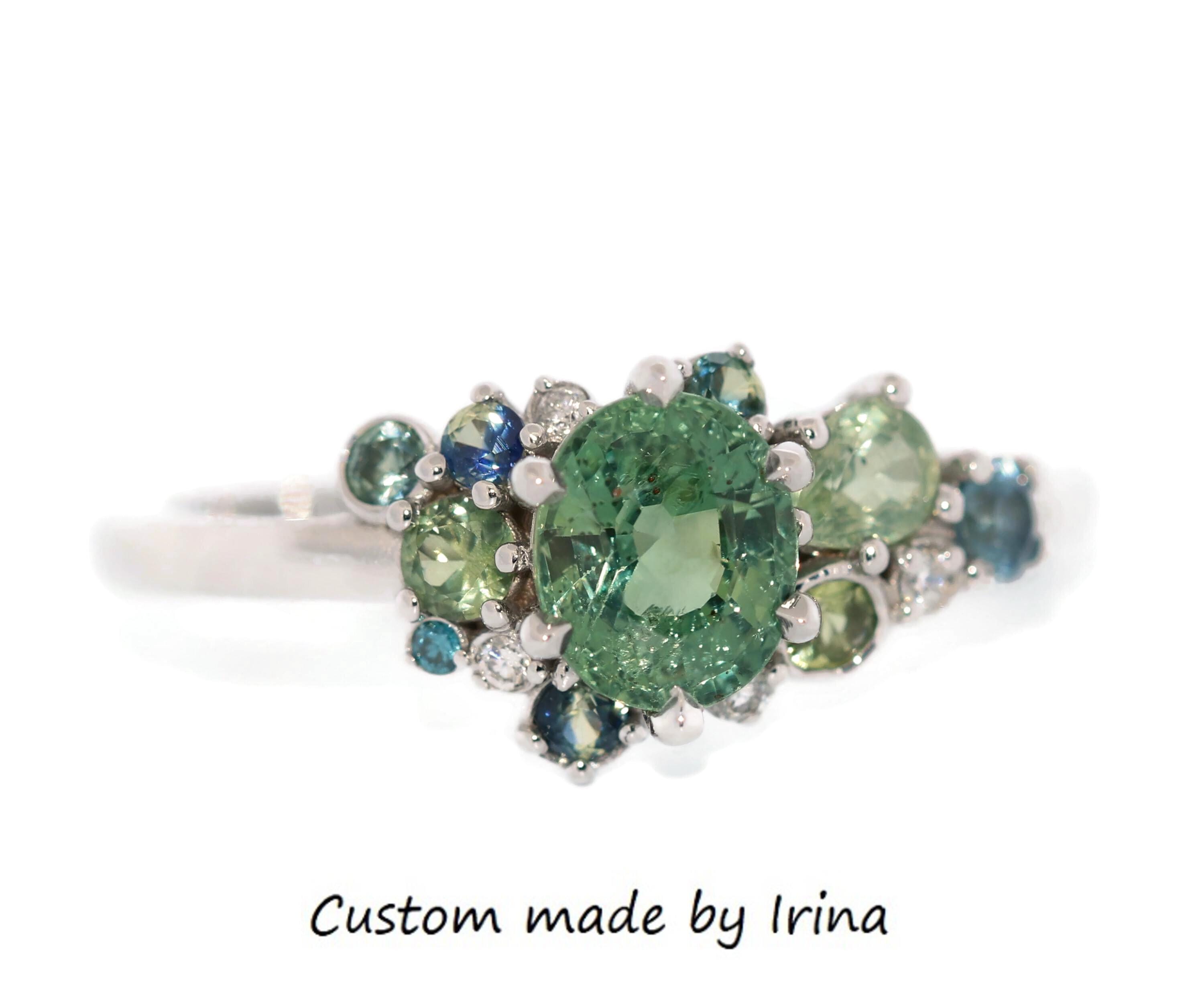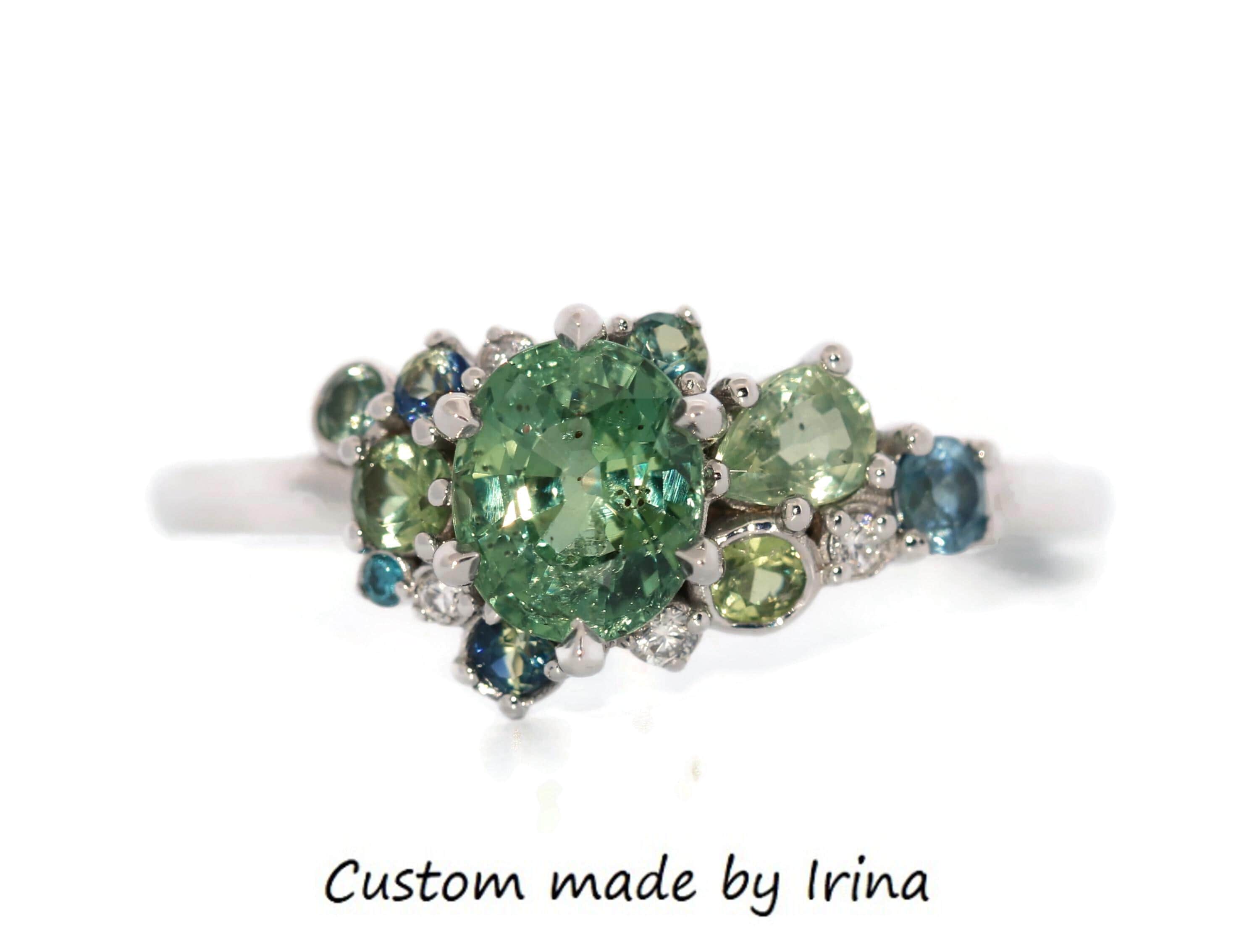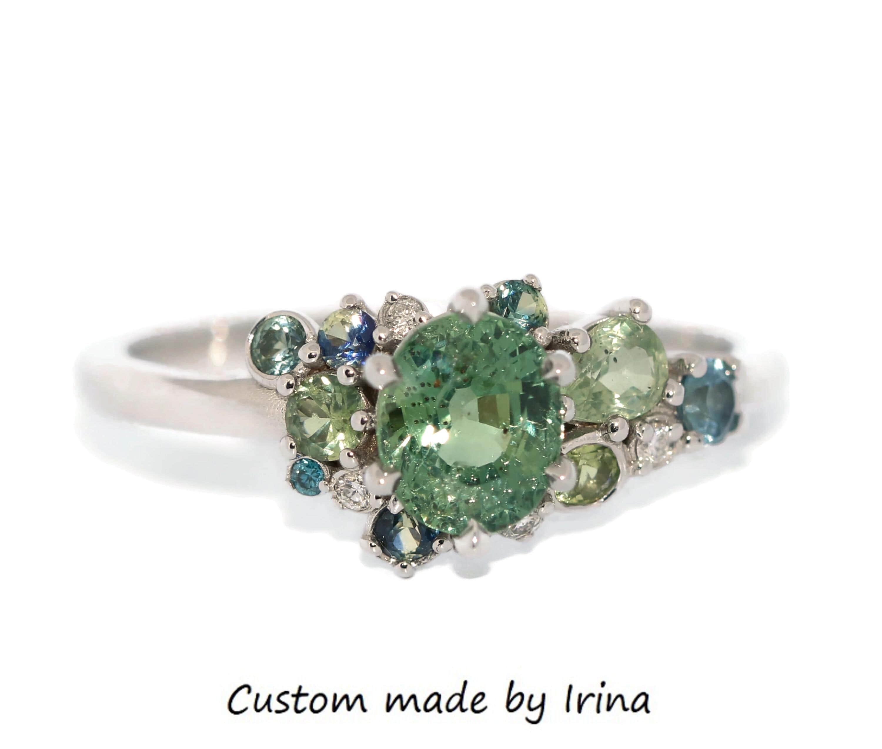 Ombre cluster stones: teal blue green natural sapphires and diamonds