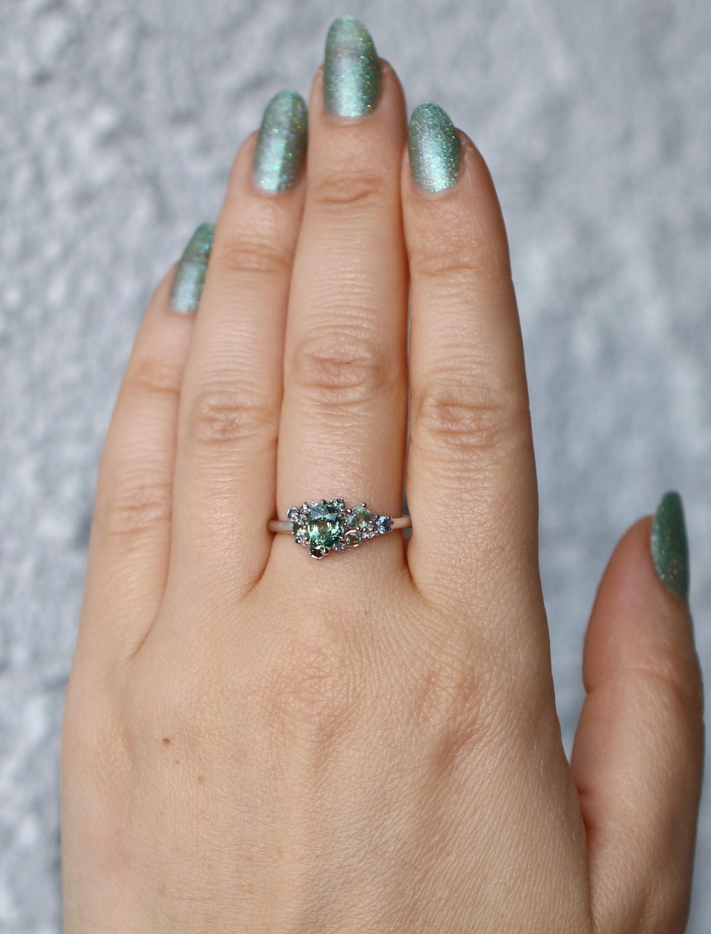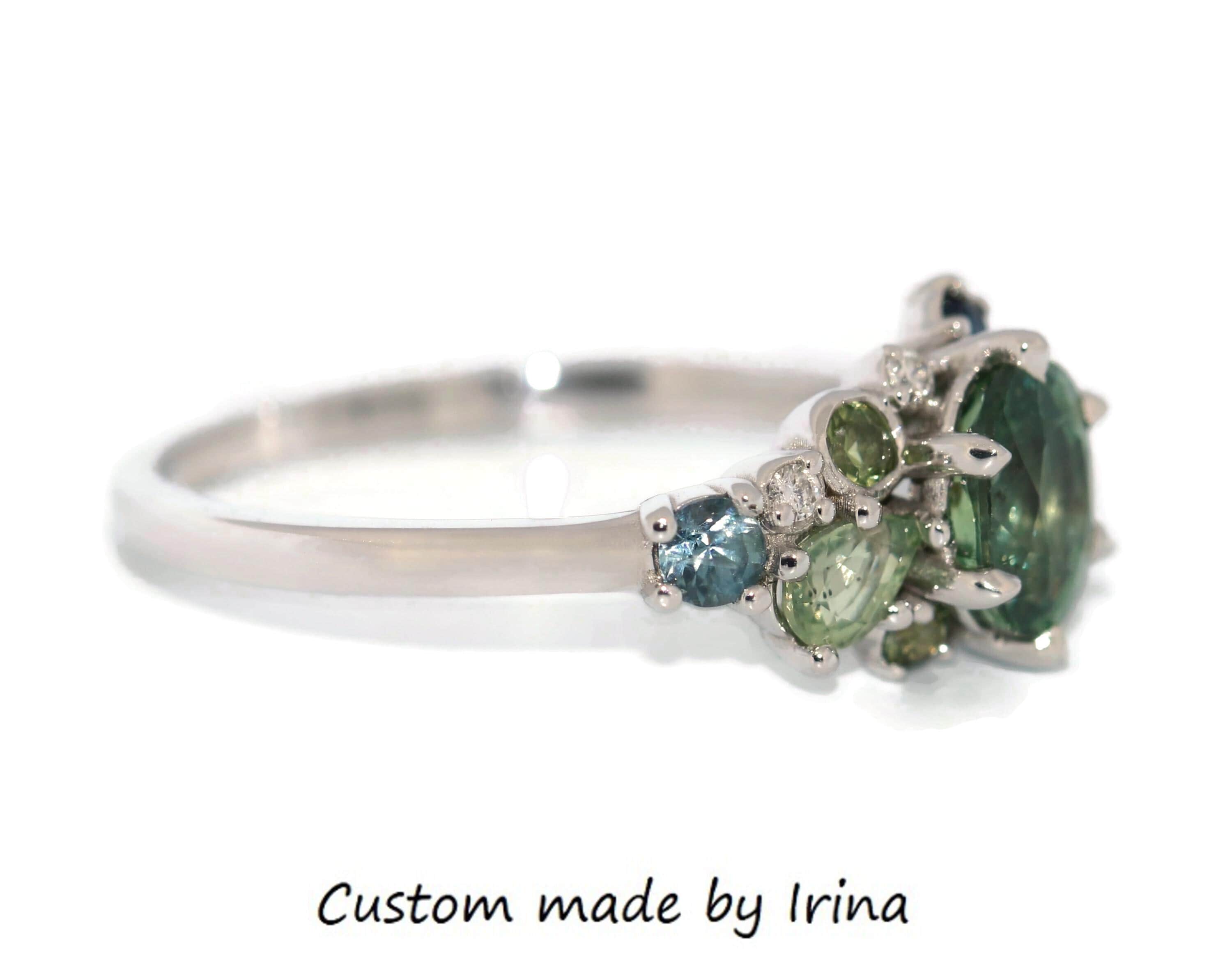 Custom Made Teal Blue Green 1.3 ct Oval Sapphire Cluster Ombre Ring.