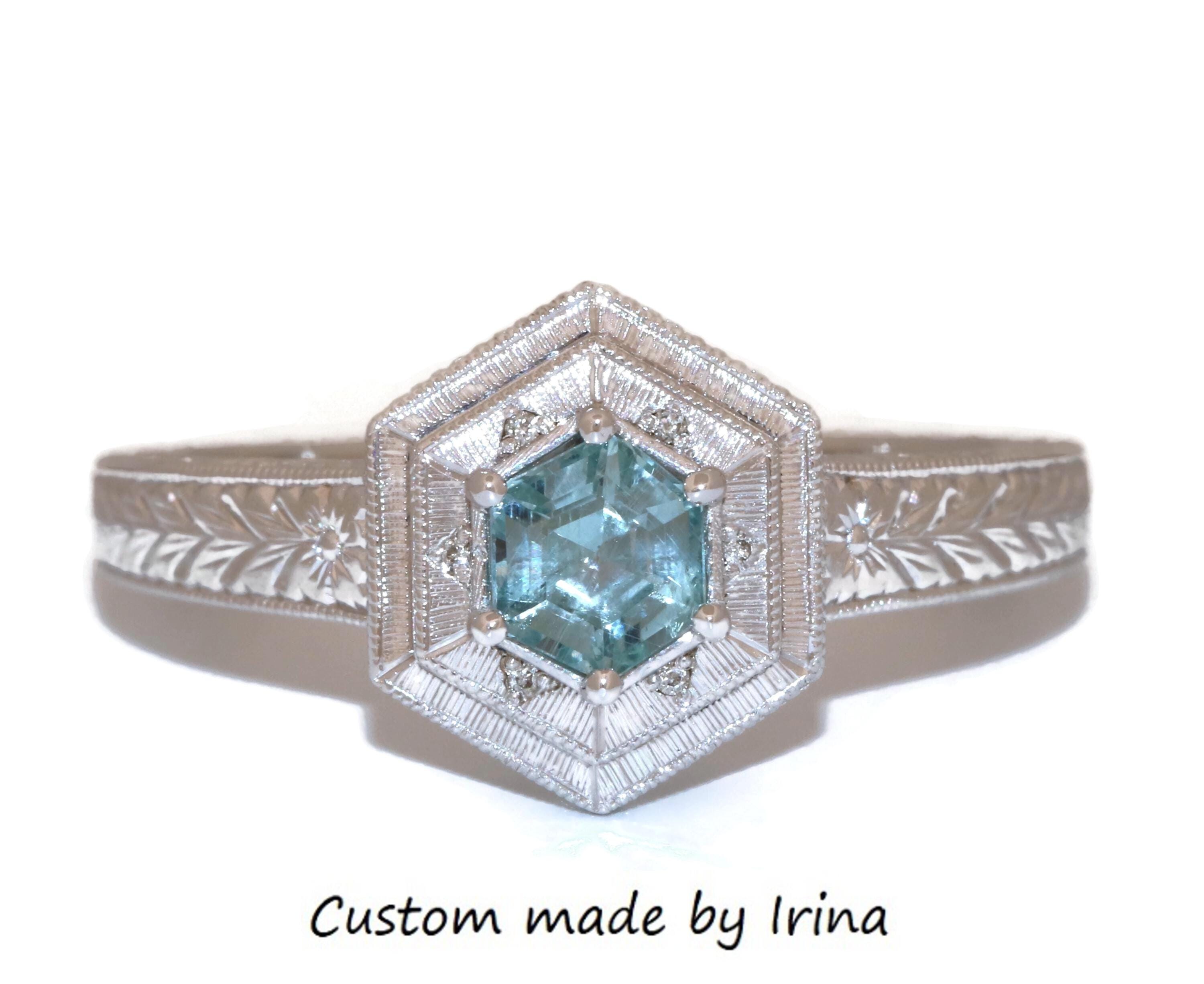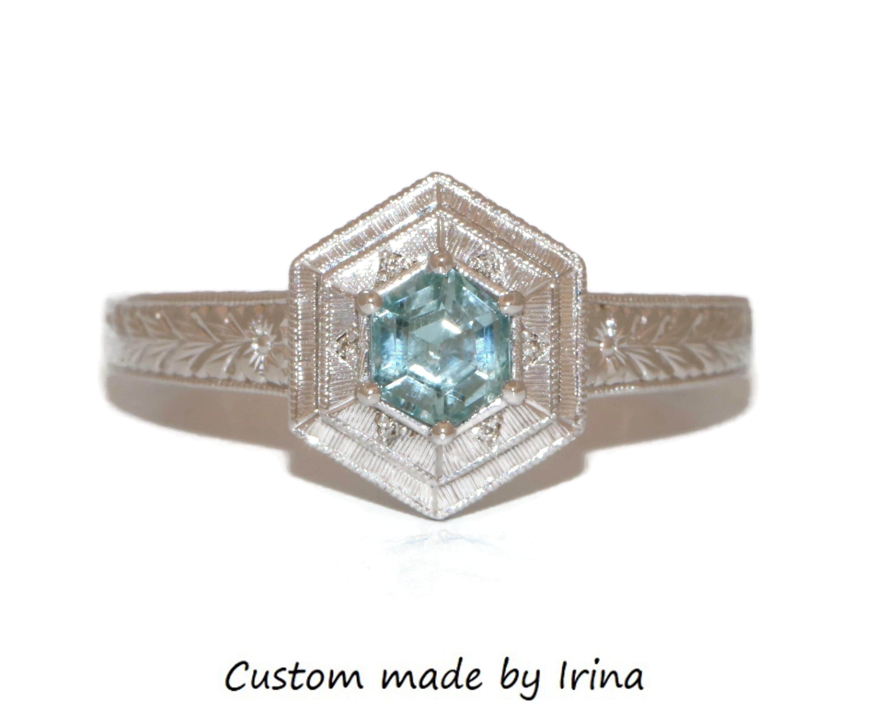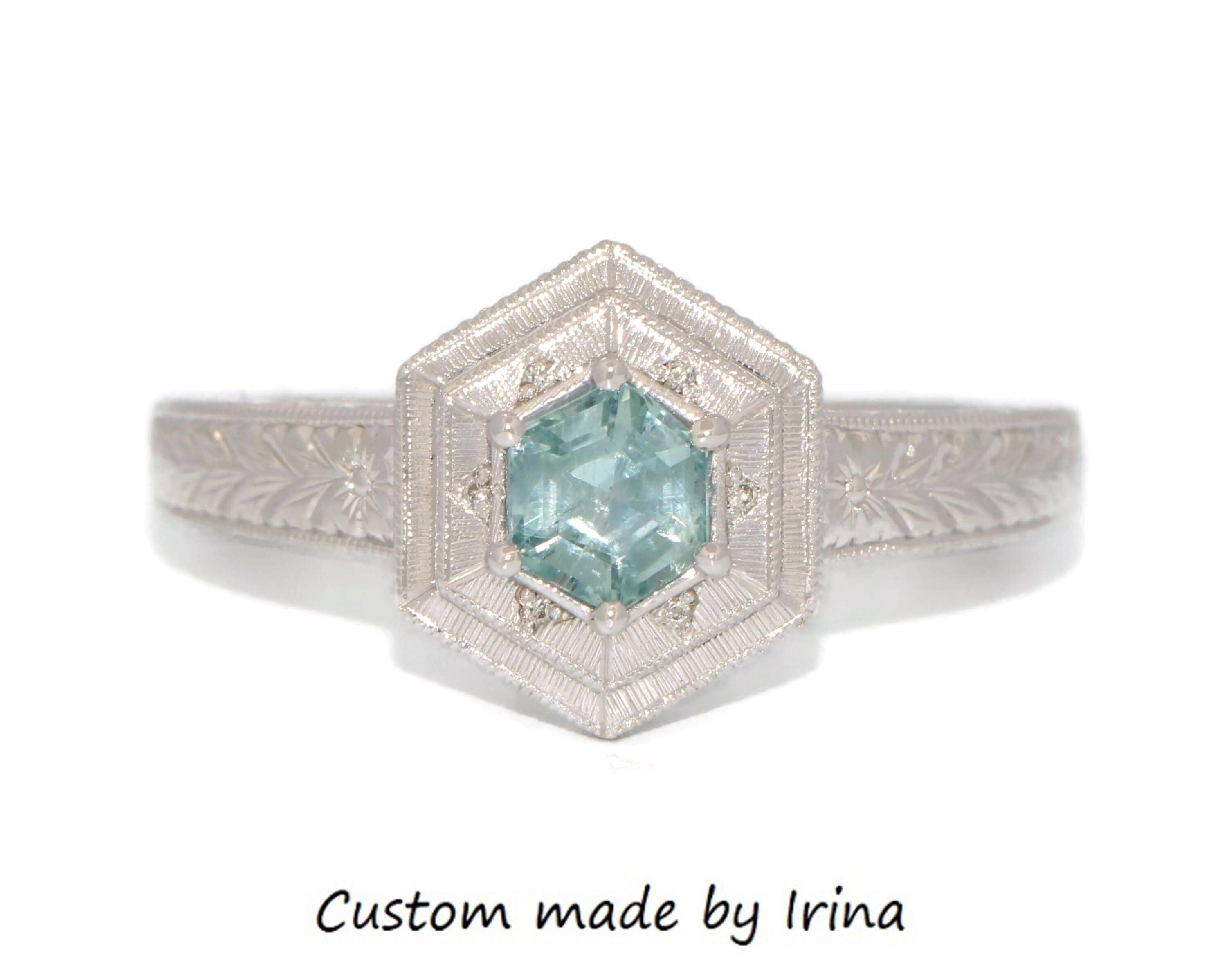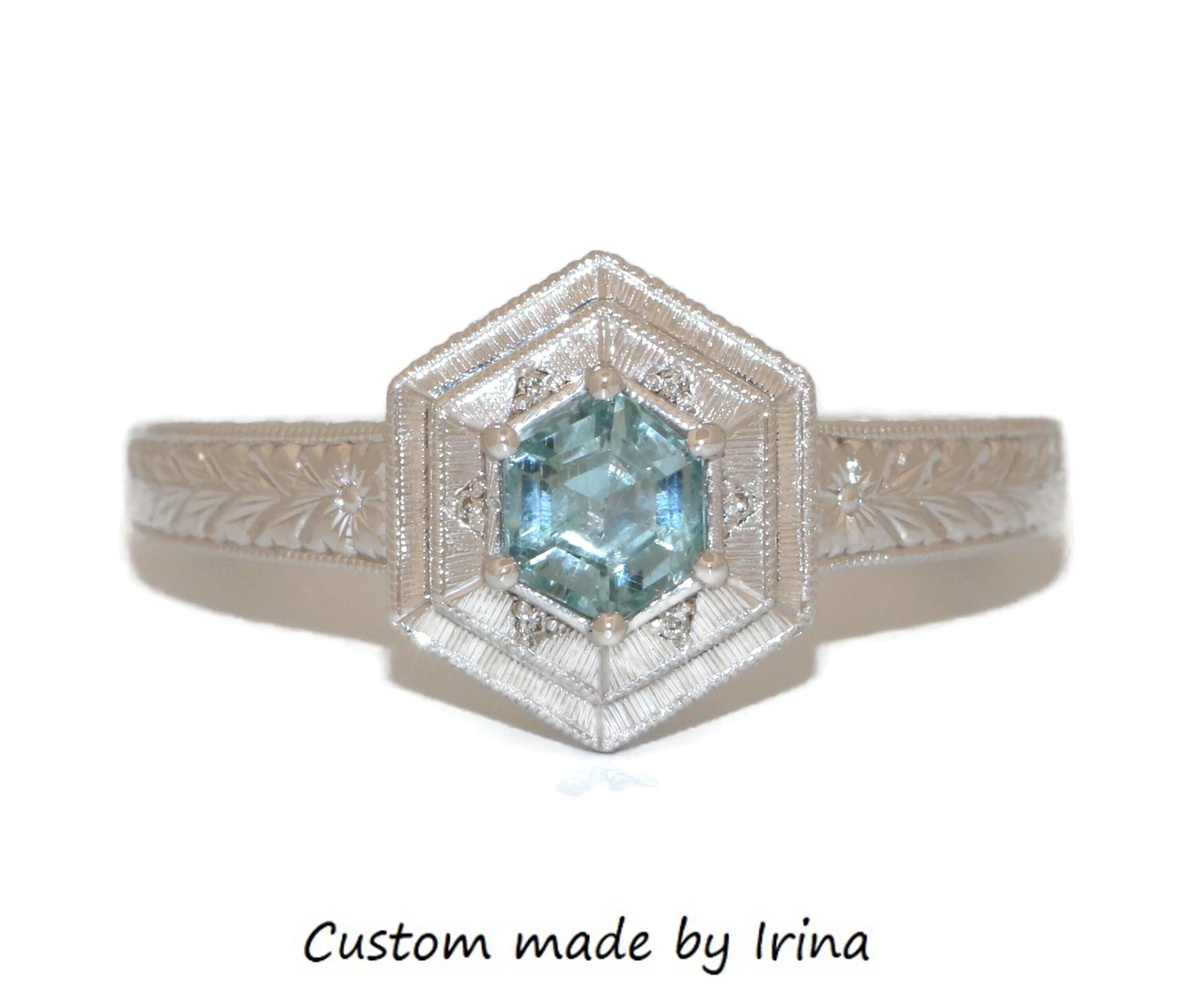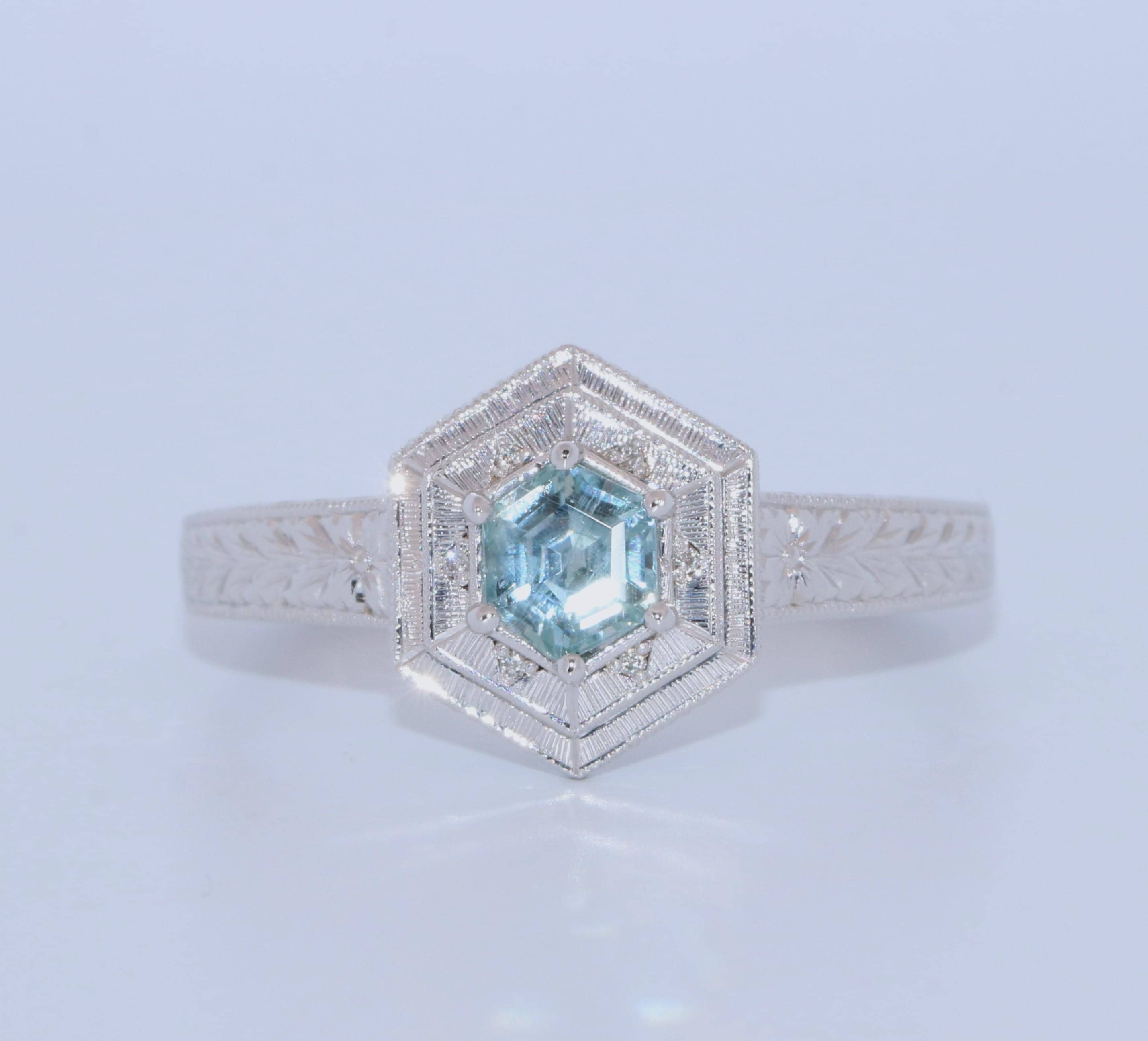 Custom made Hand Engraved Hexagon Unheated Natural Montana Sapphire Ring.