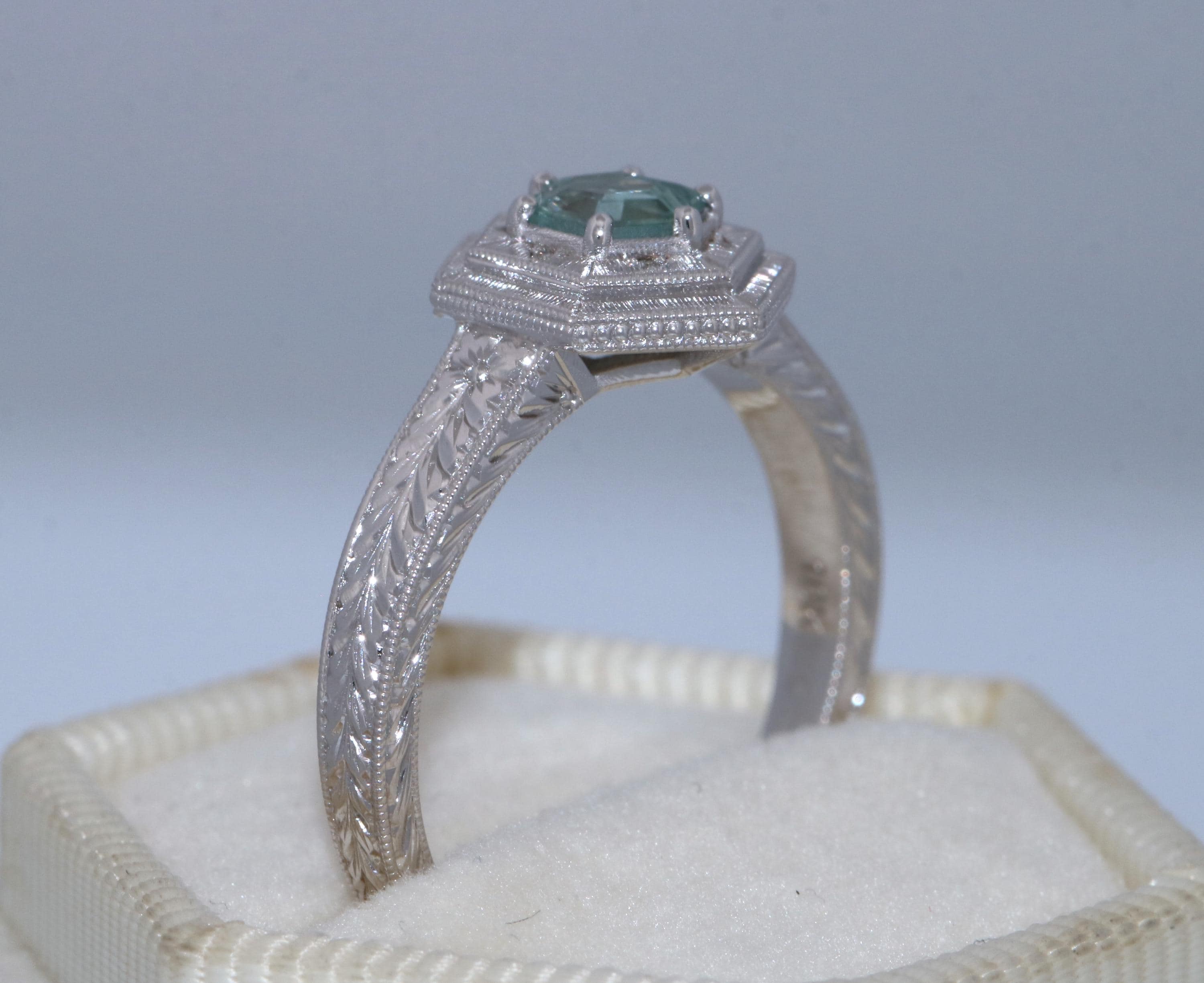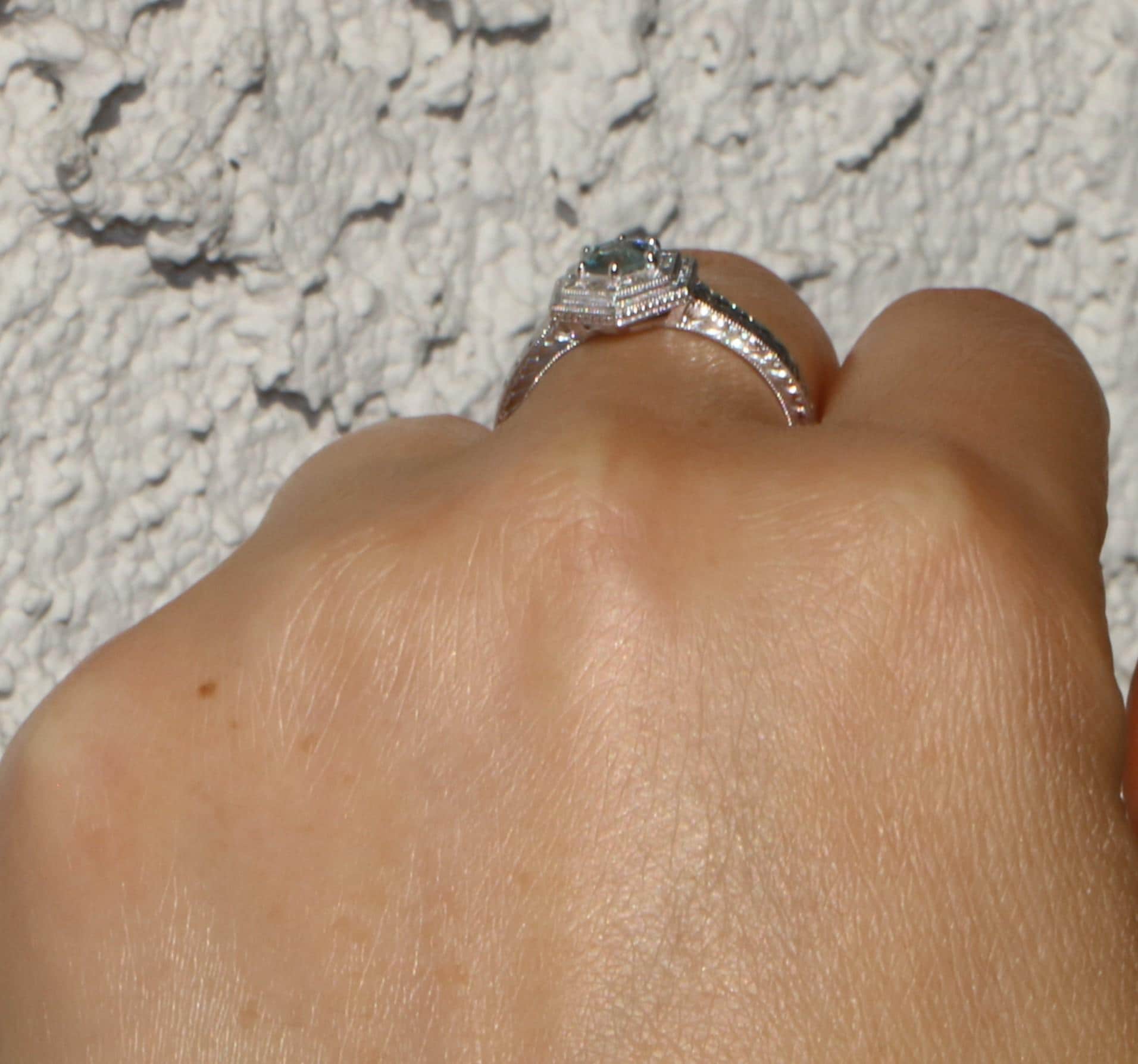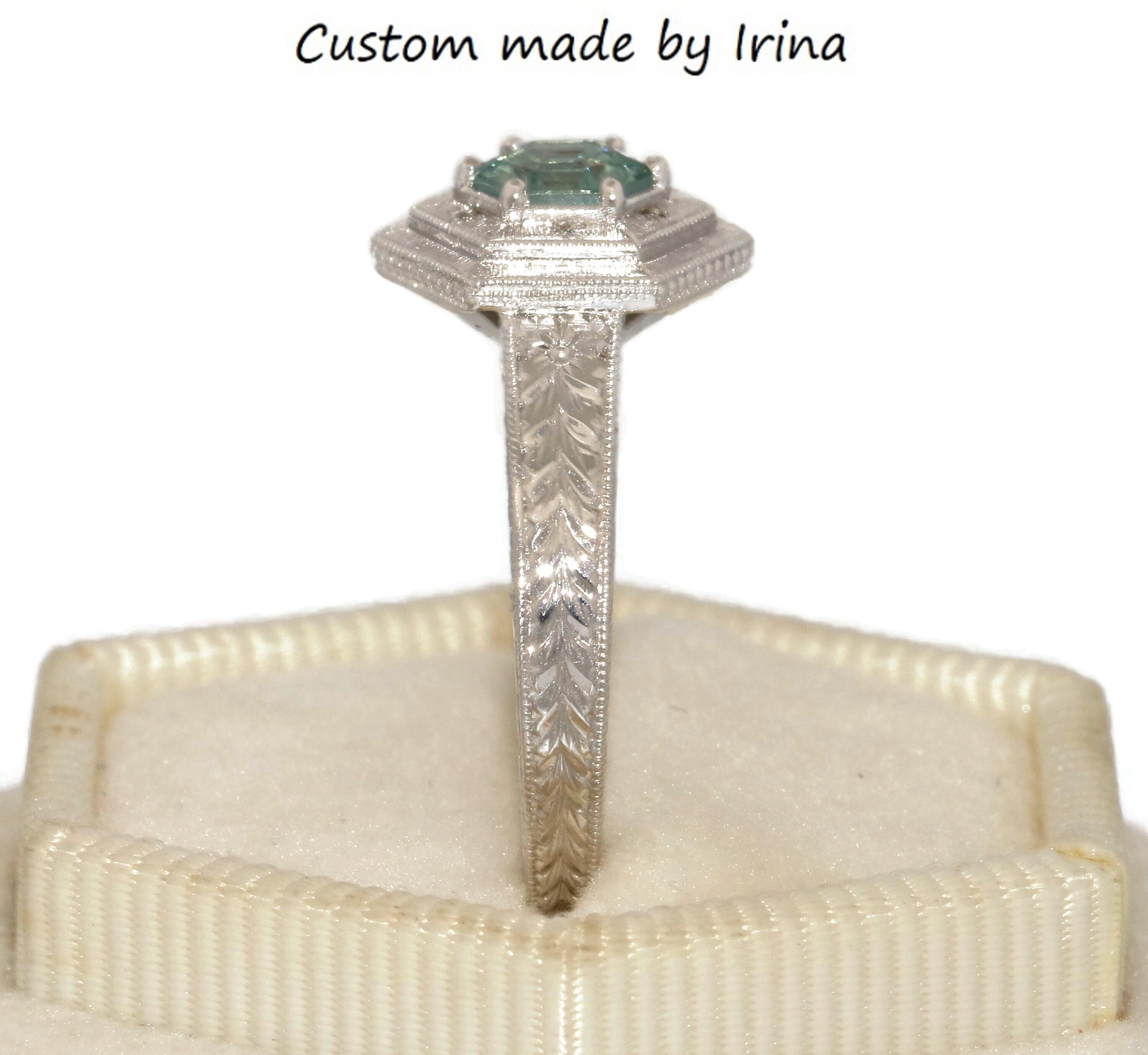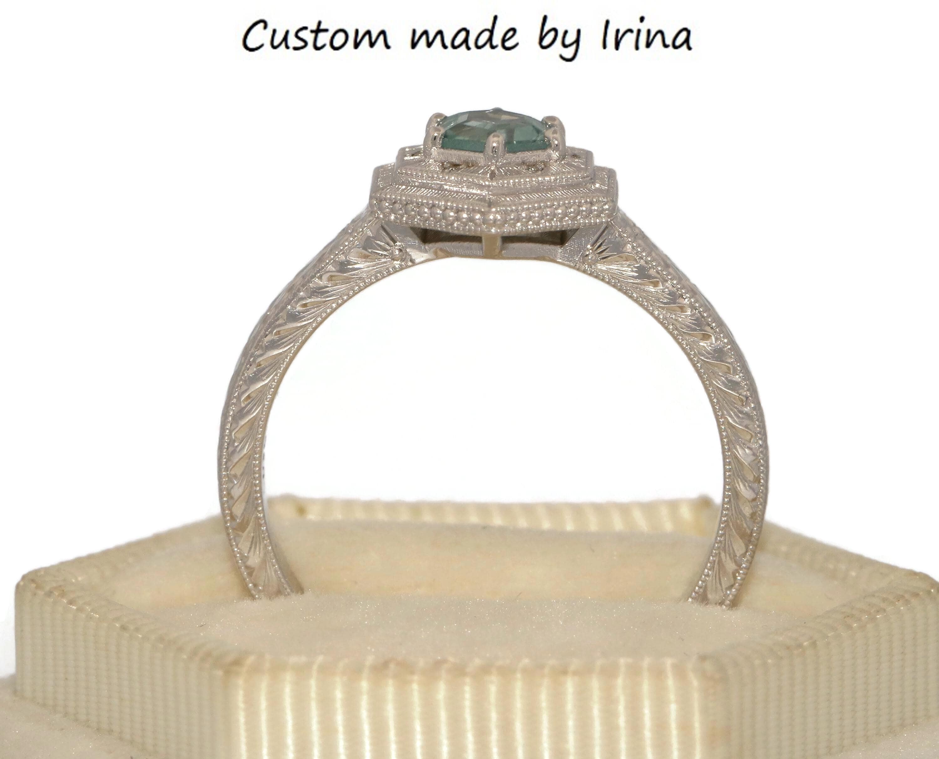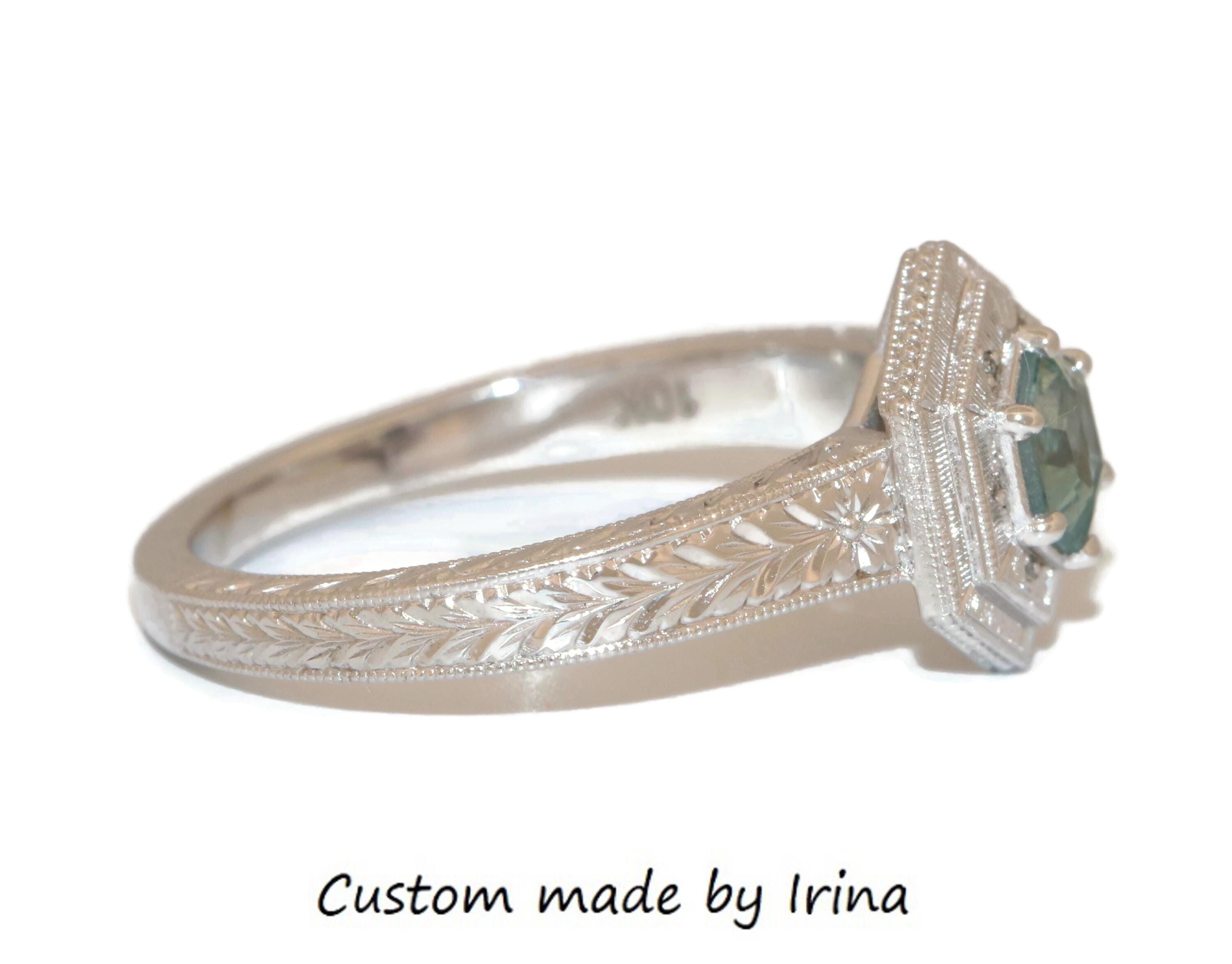 Custom made Hand Engraved Hexagon Unheated Natural Montana Sapphire Ring.