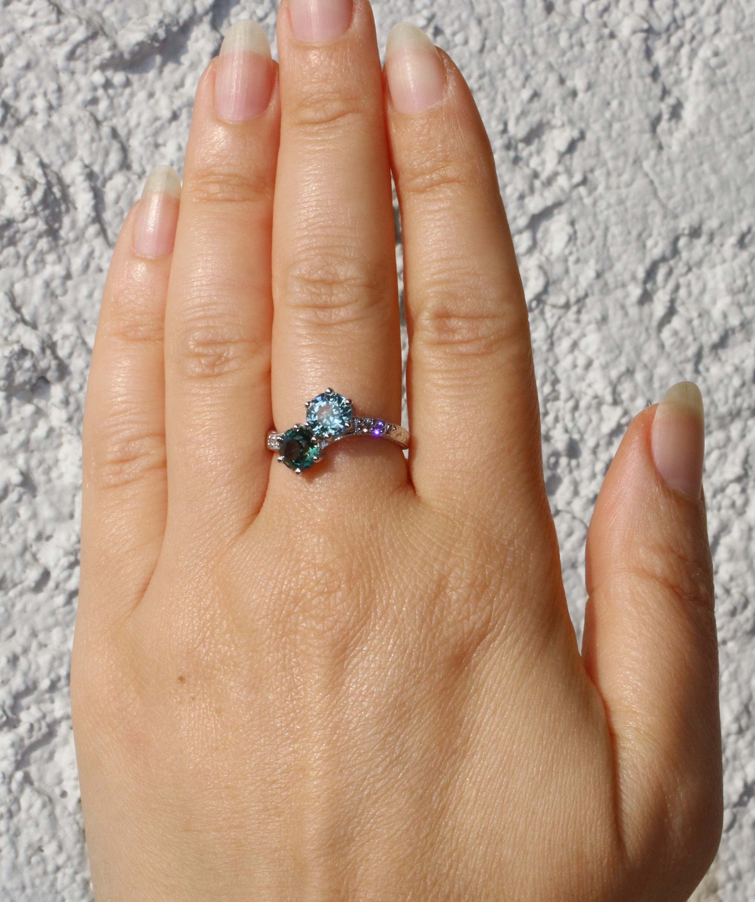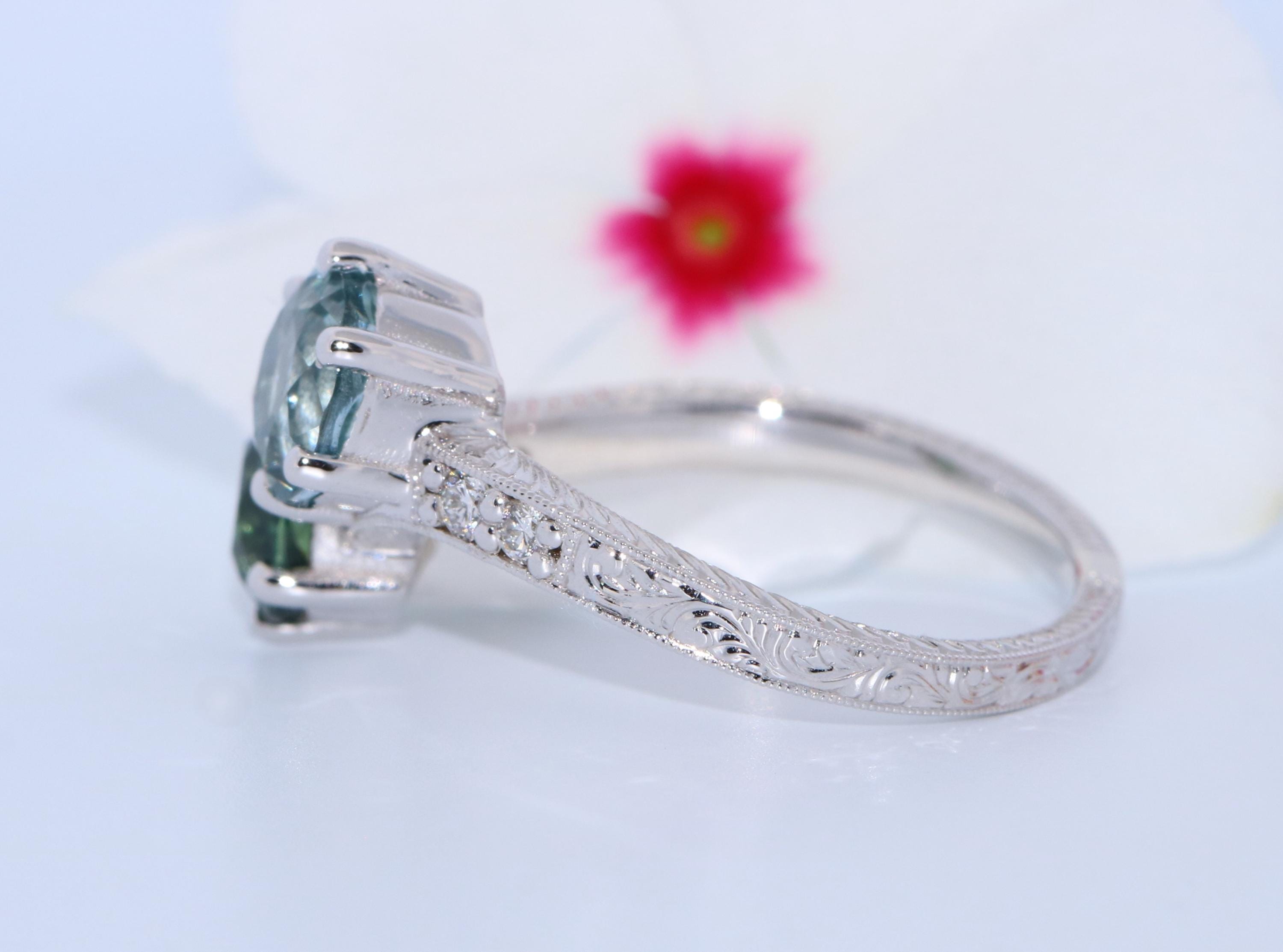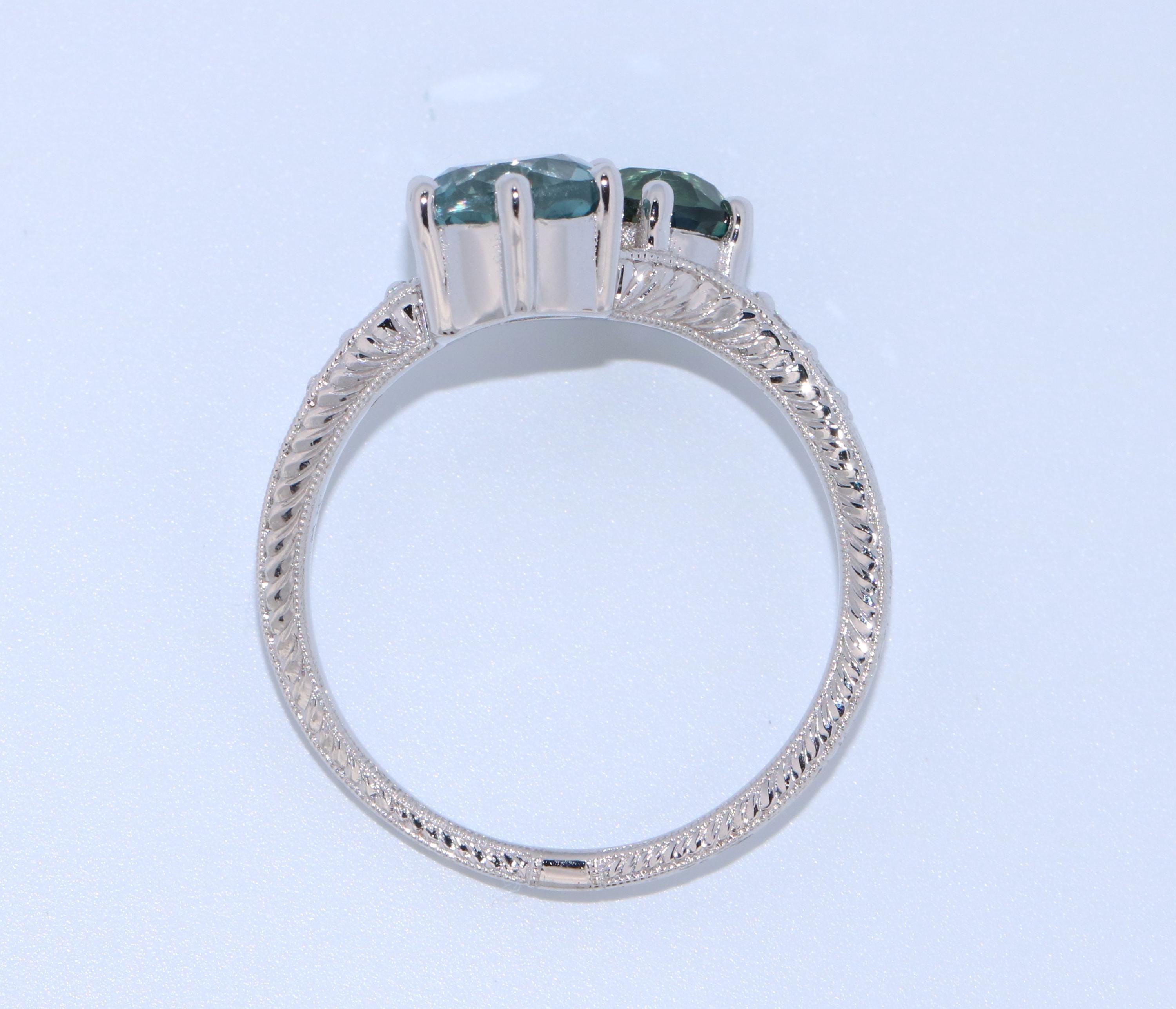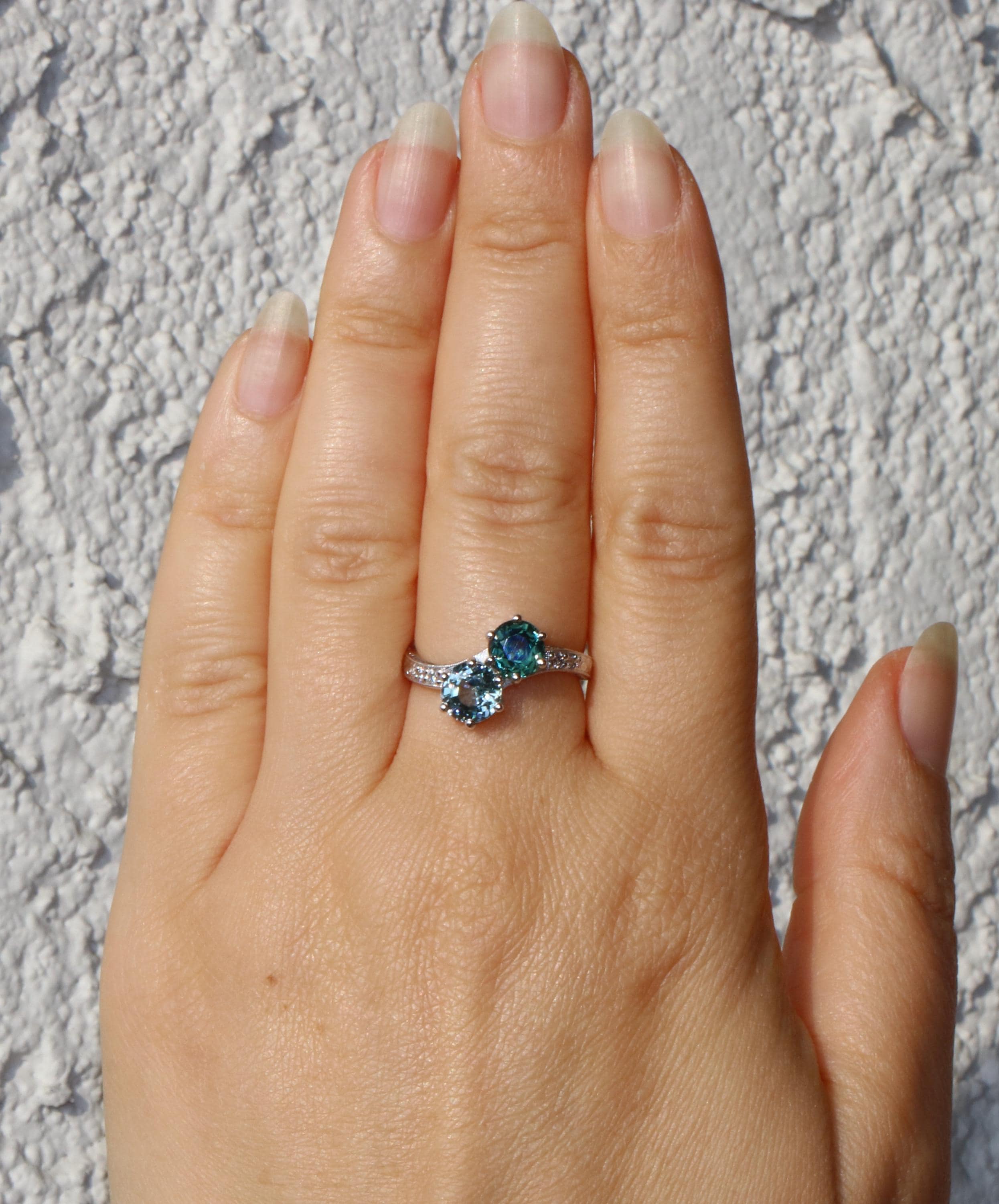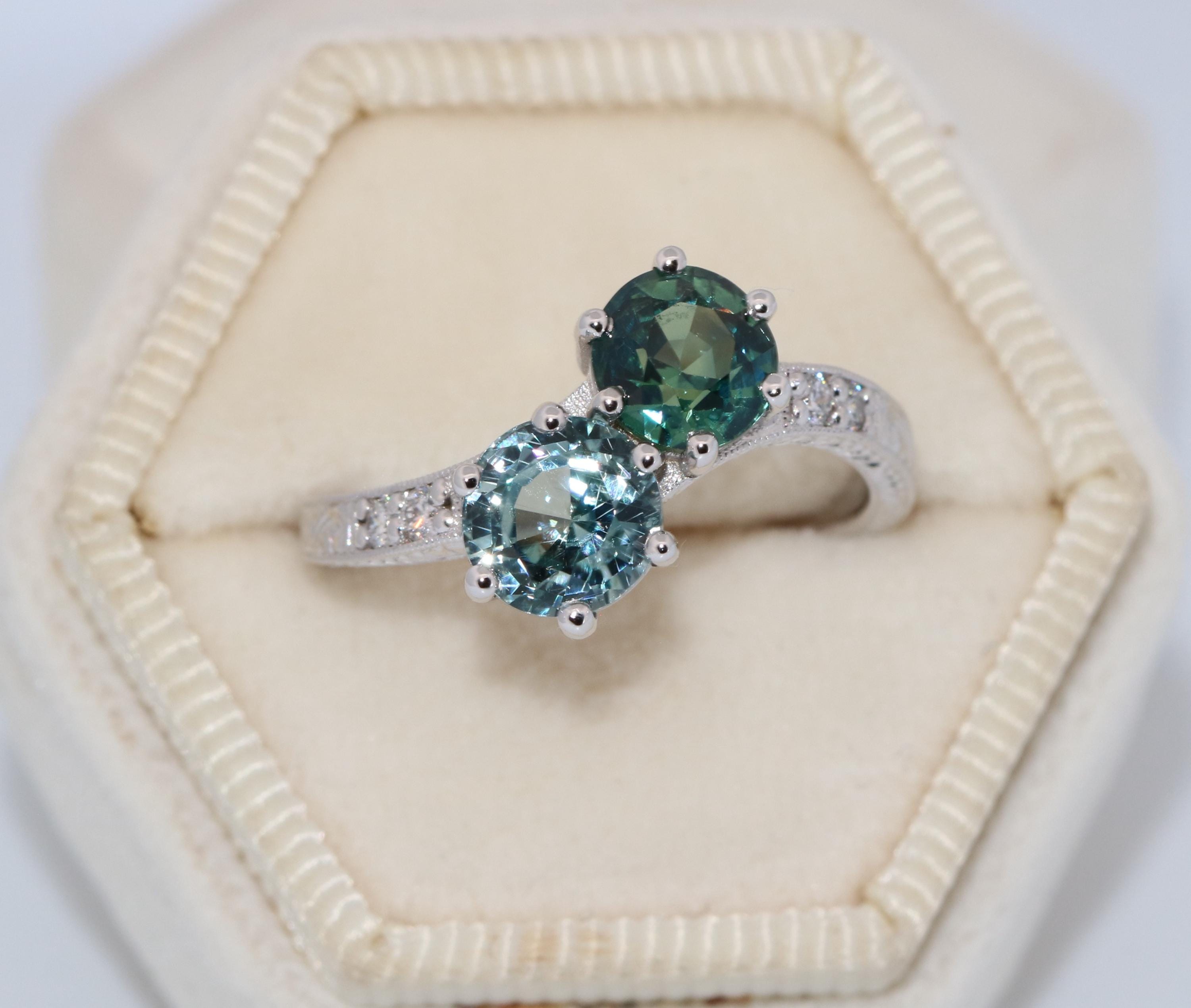 The original stunning ring featured a 1.3 ct teal blue green natural sapphire & 1.79 ct Round Shiny Blue Natural Montana Sapphire.