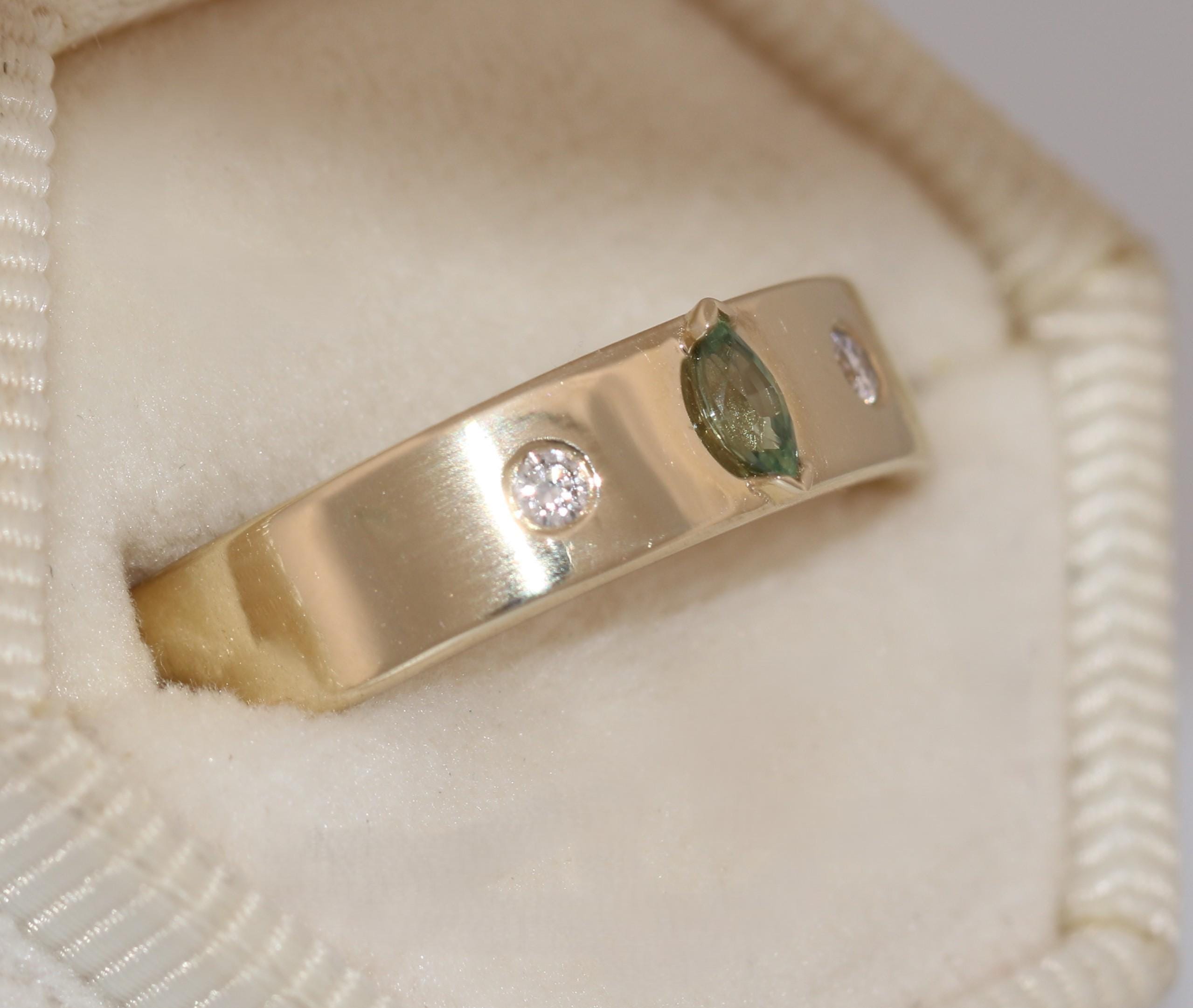 Stones: 4 by 2 marquise green natural sapphire and 2 small lab diamonds