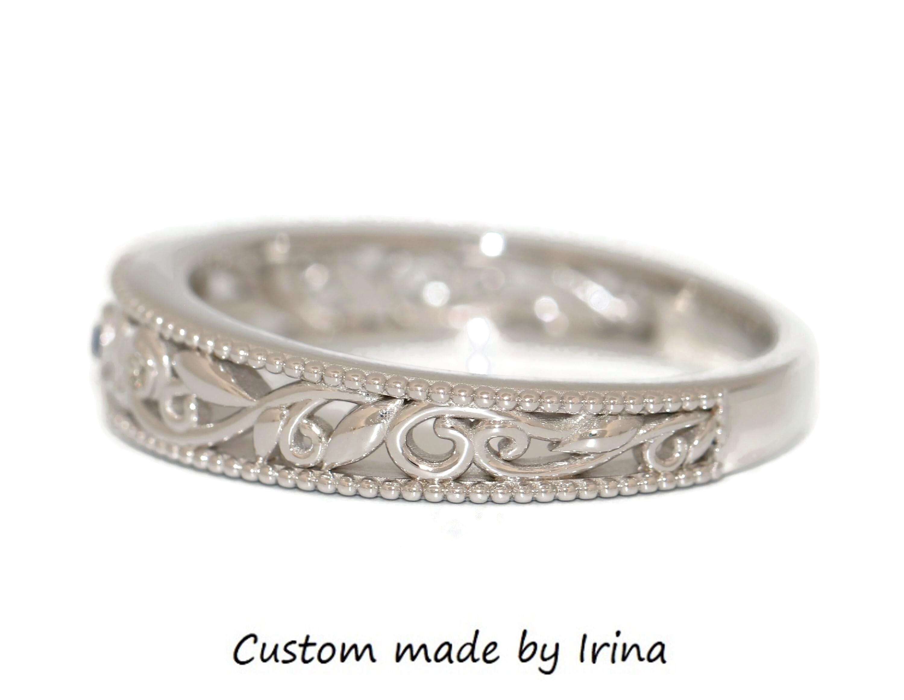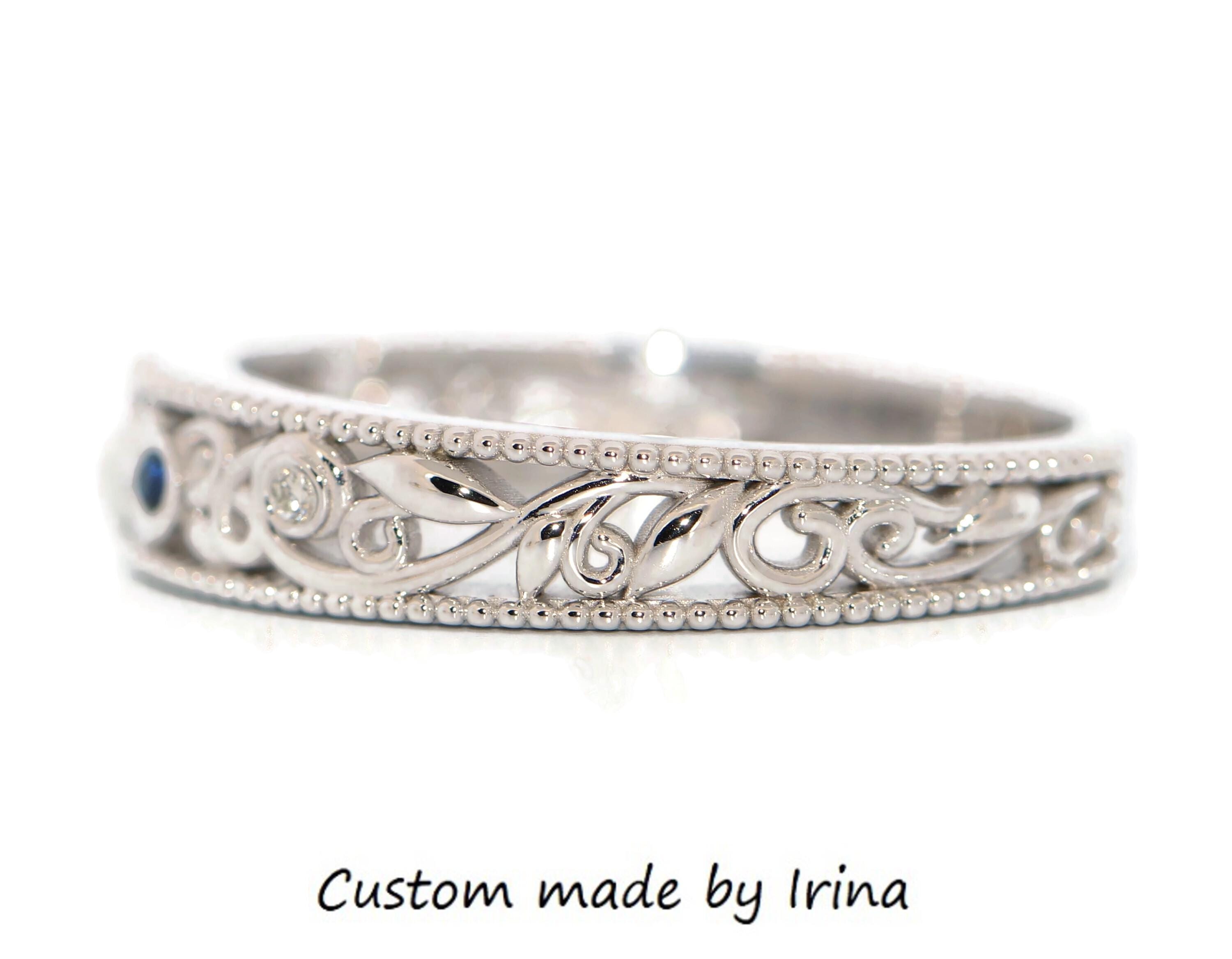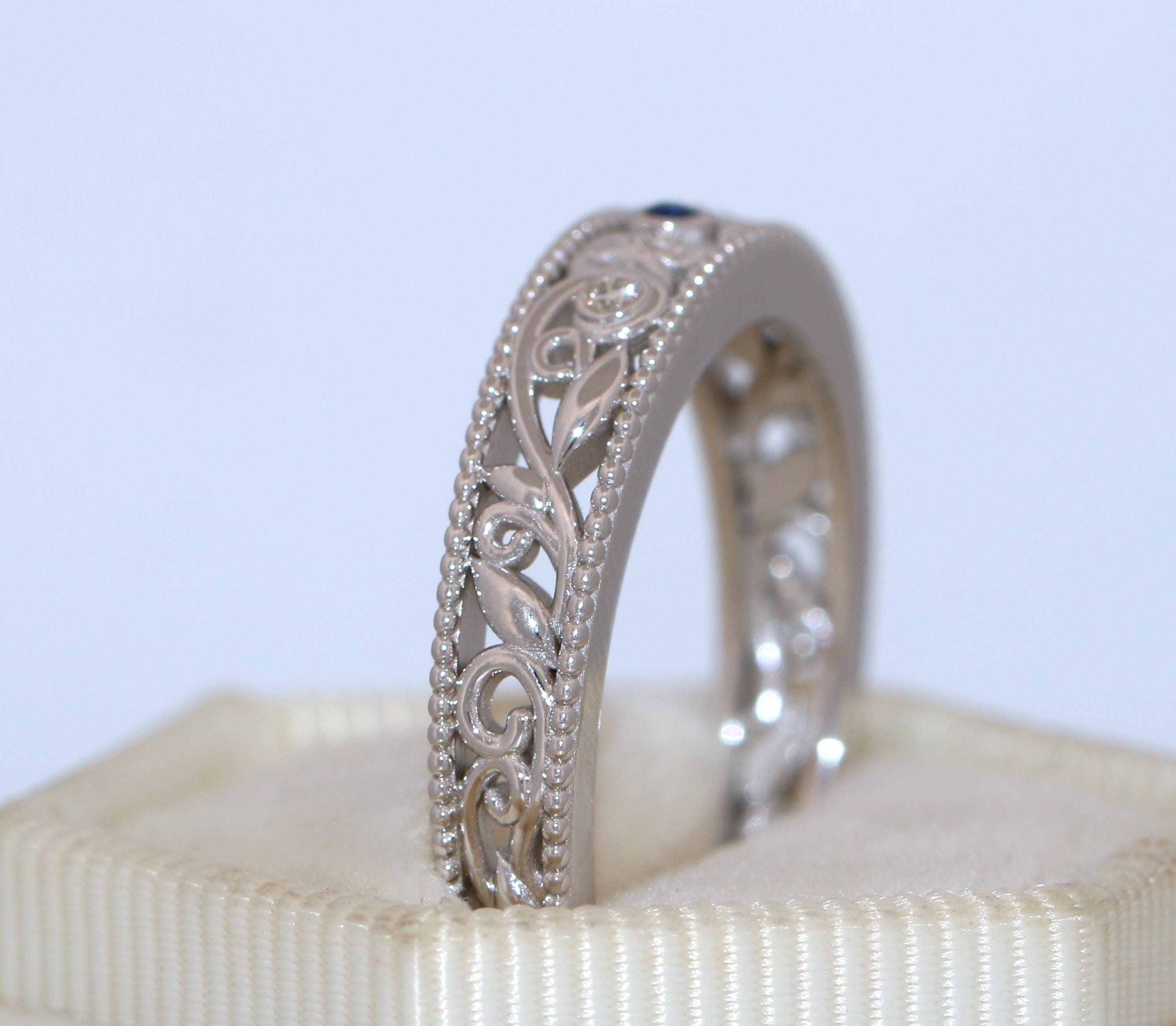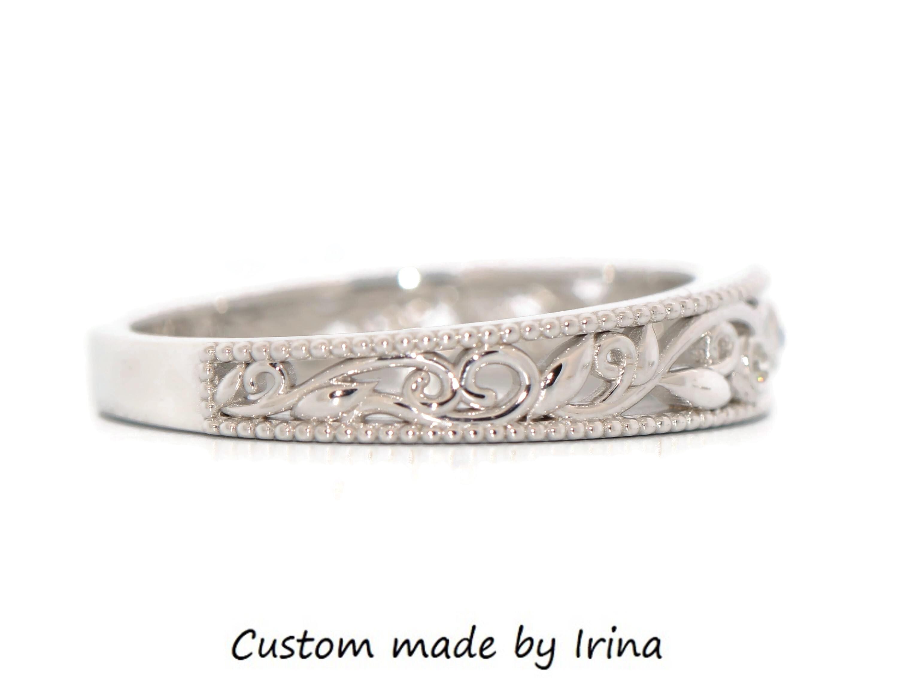 Custom Made Scrollwork Lace Organic Diamond Ring with dainty smooth leaf filigree pattern.