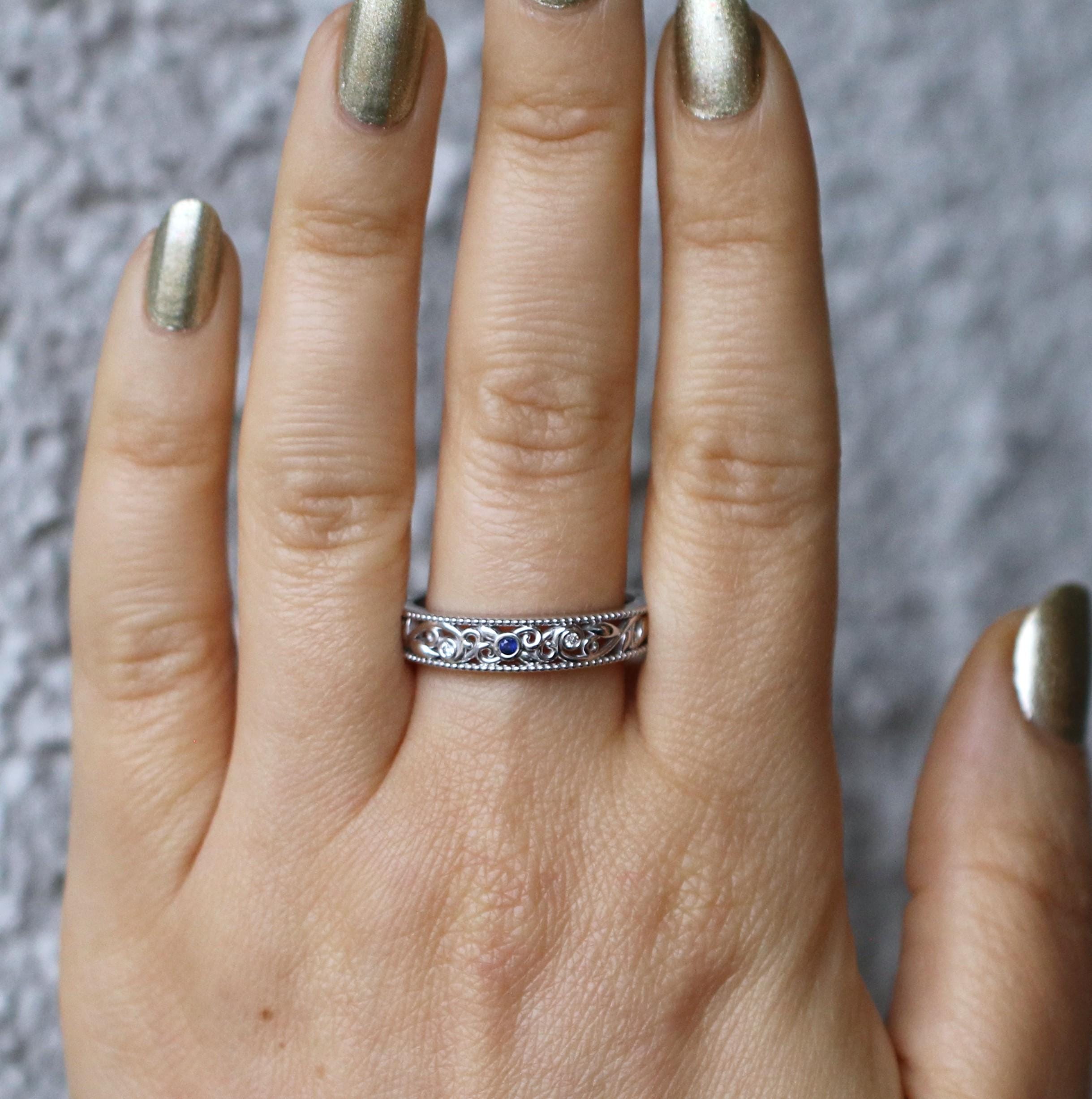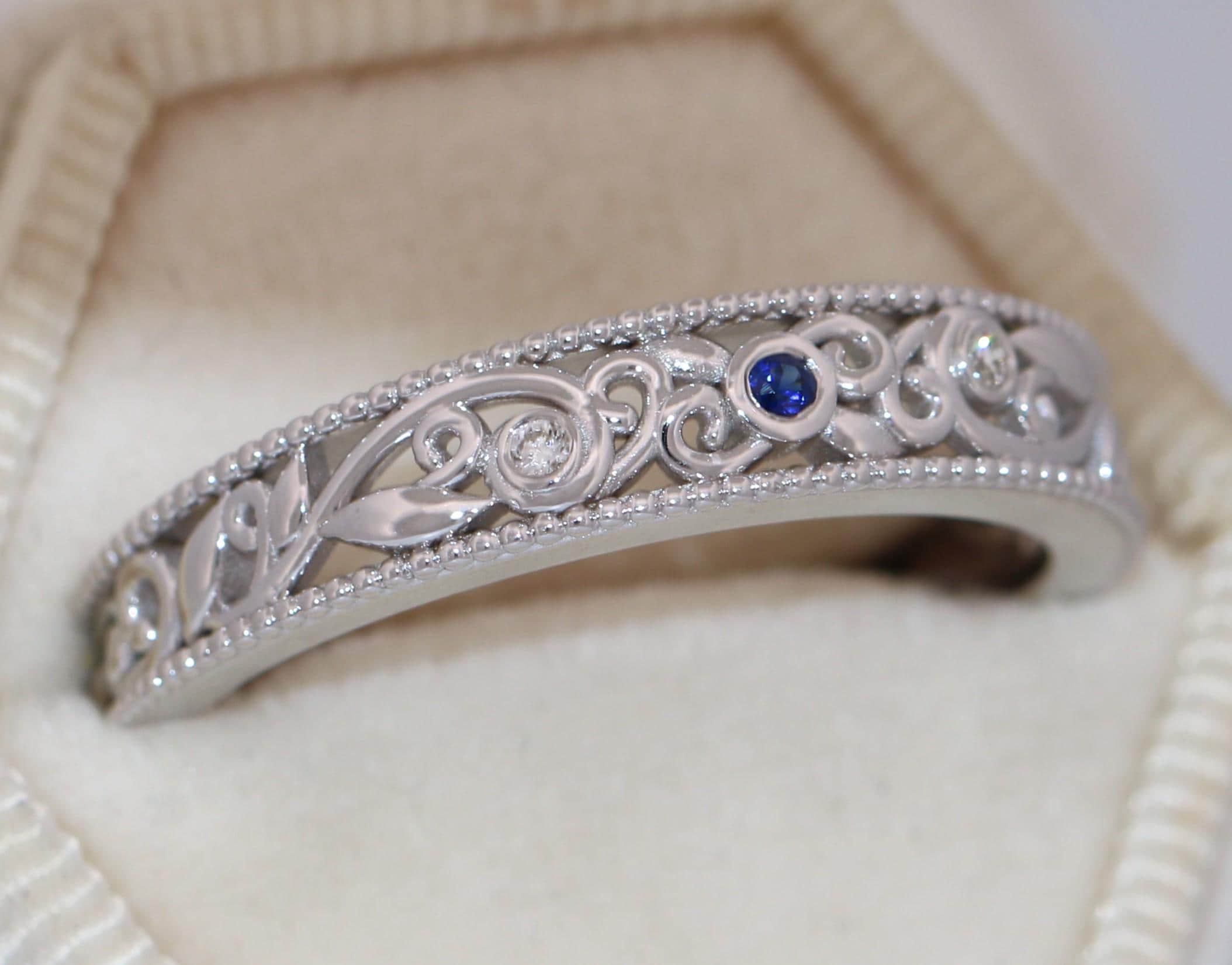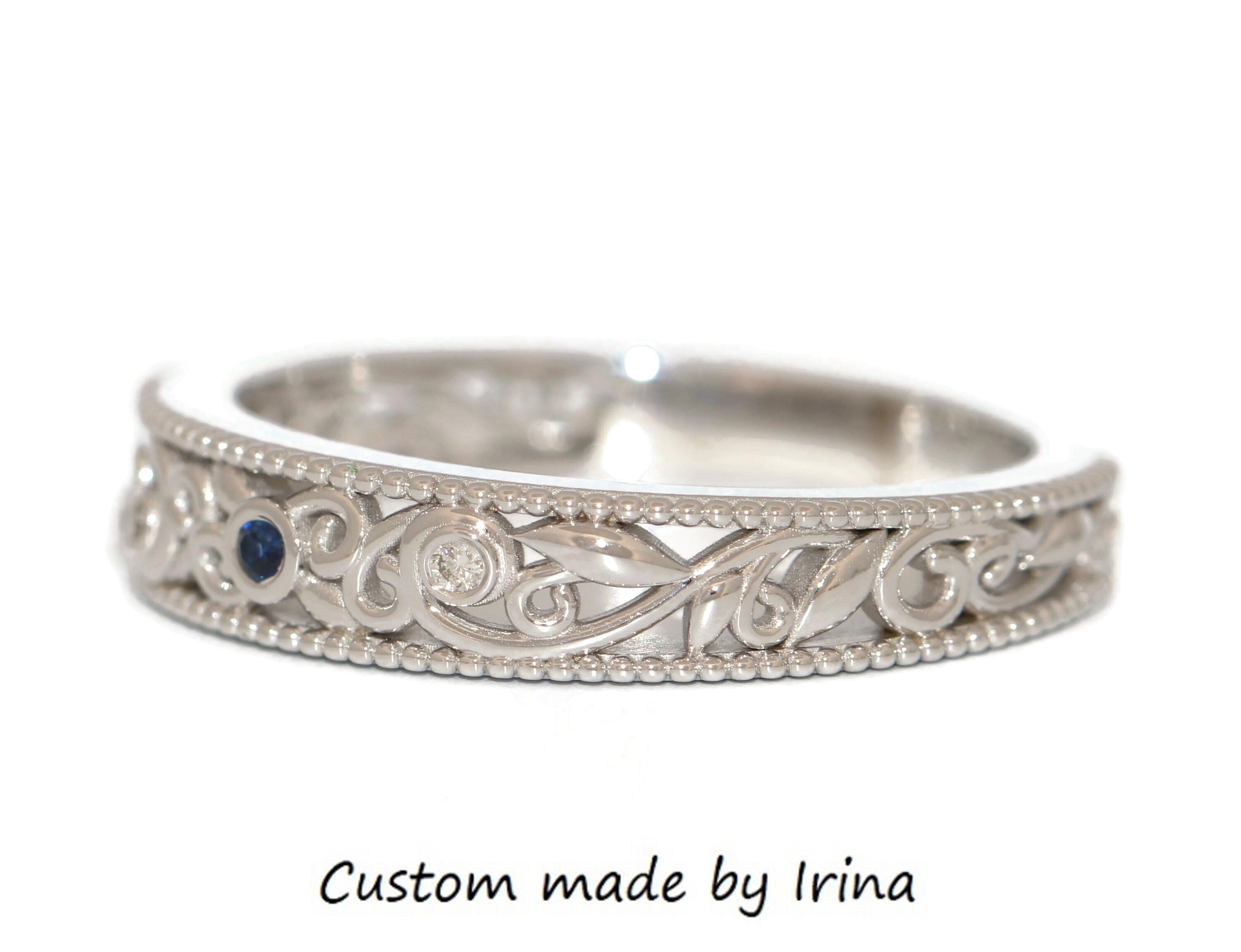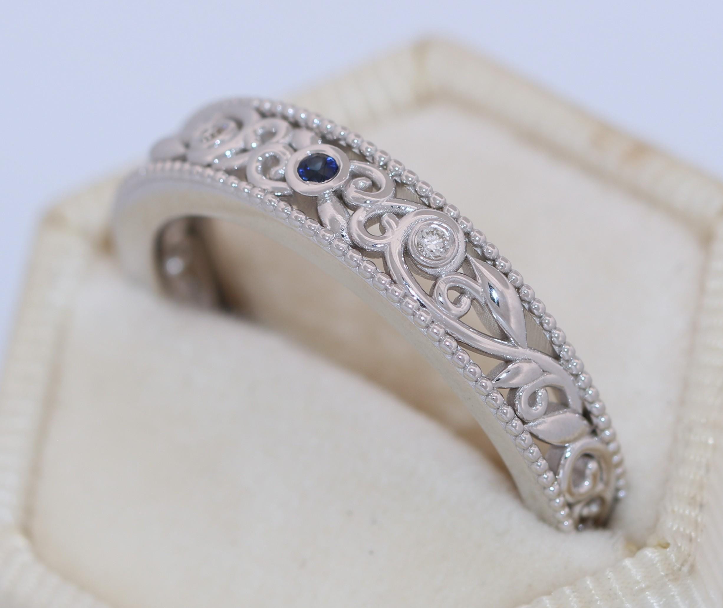 Custom Made Scrollwork Lace Organic Diamond Ring with dainty smooth leaf filigree pattern.