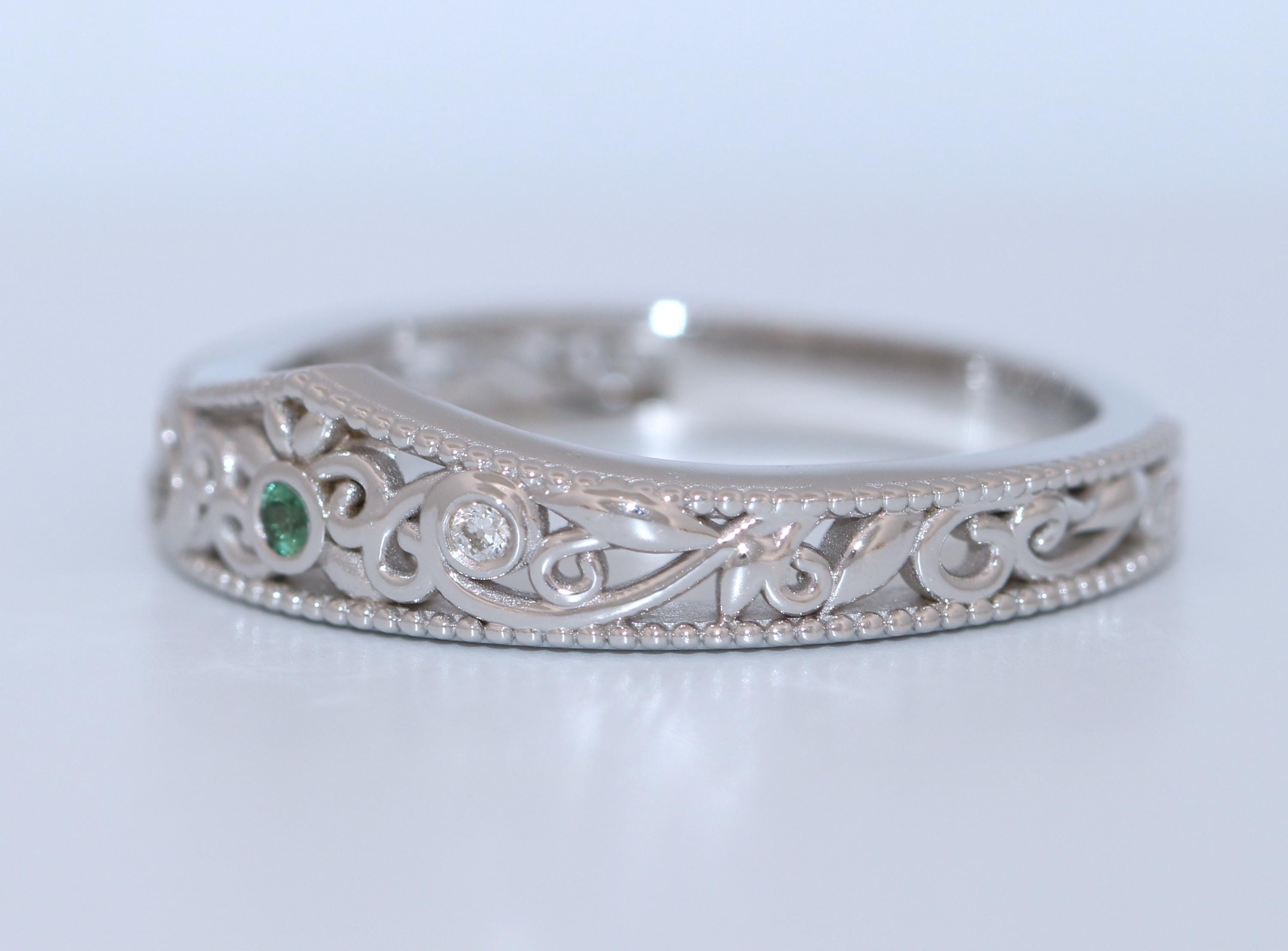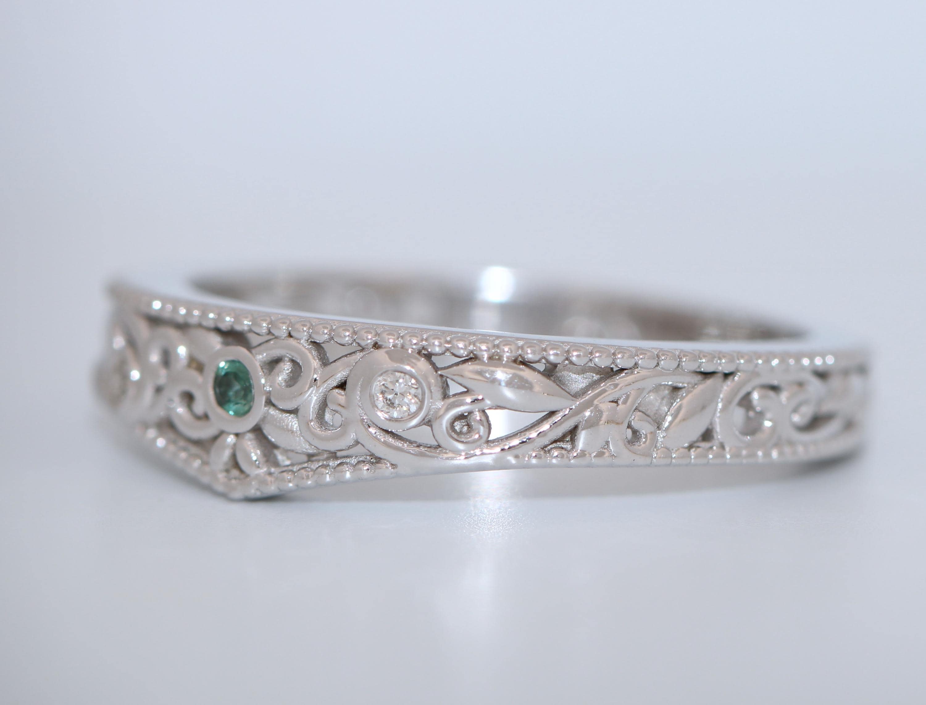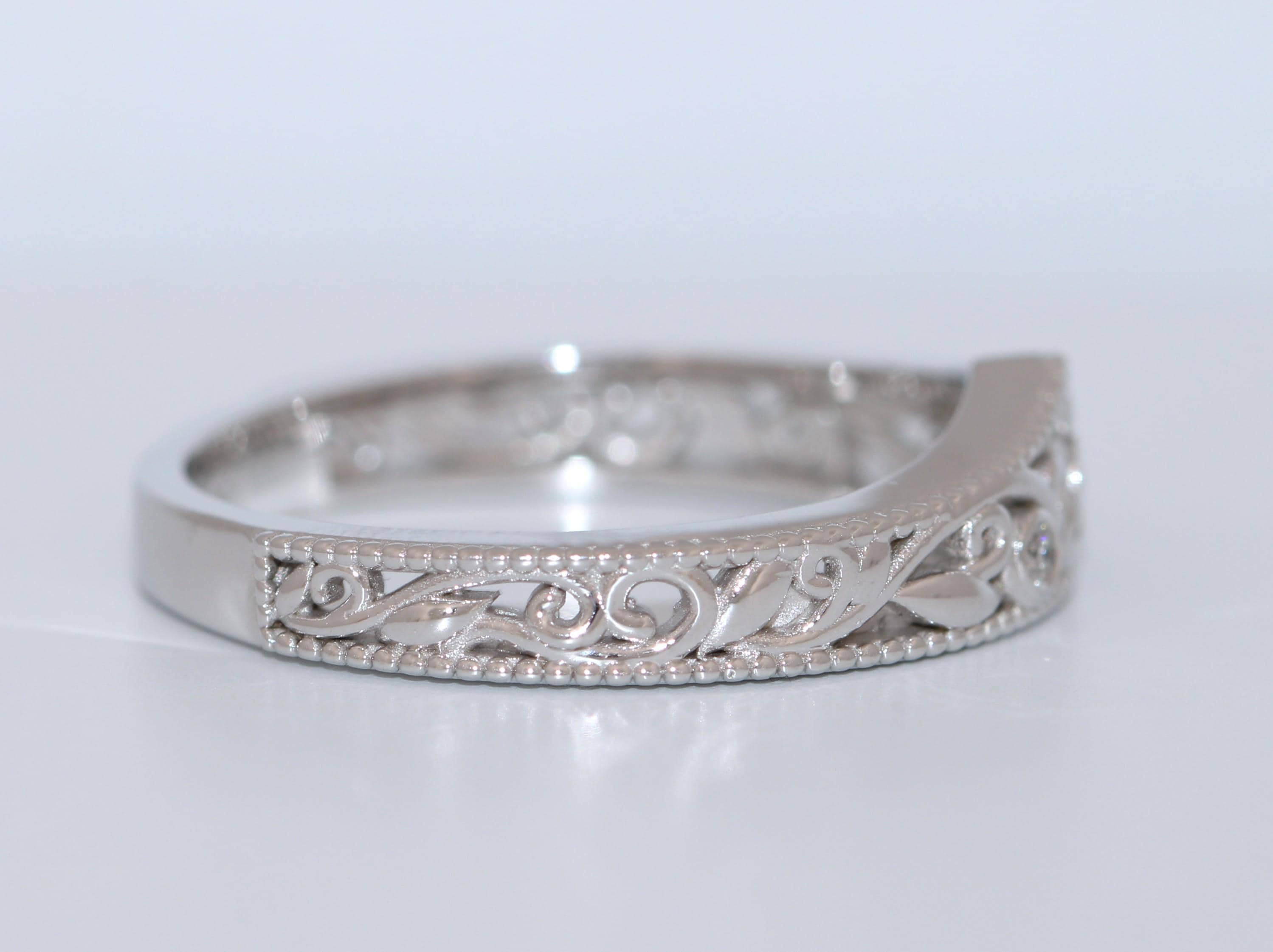 Flair Style Custom Made Scrollwork Lace Organic Diamond Ring with dainty smooth leaf filigree pattern.
