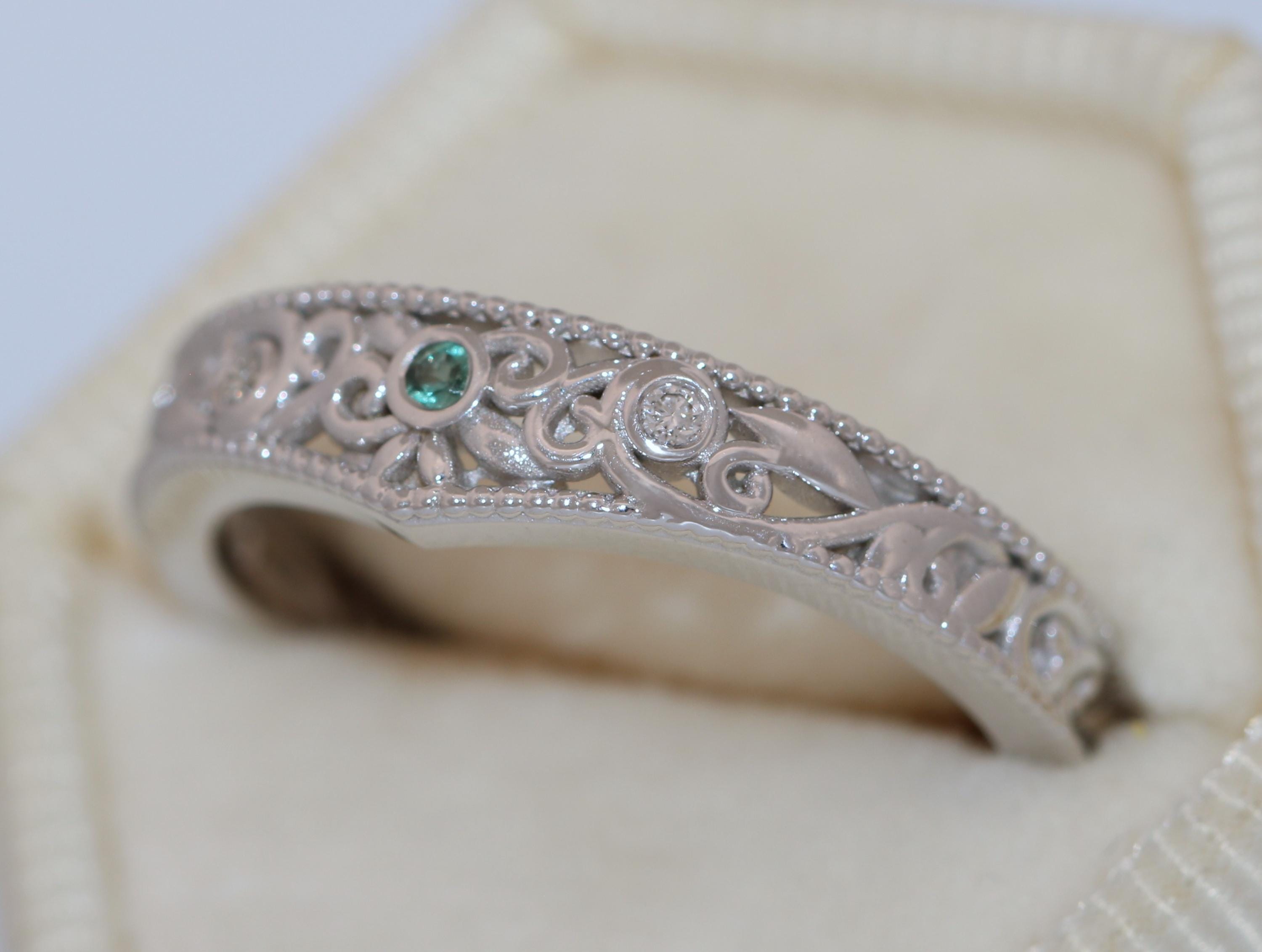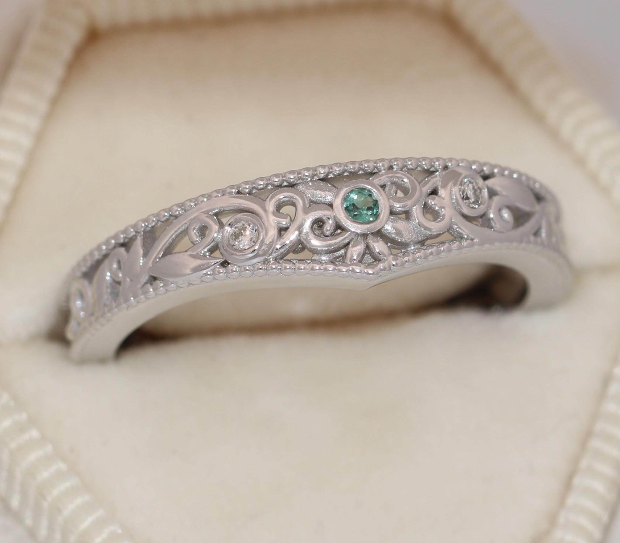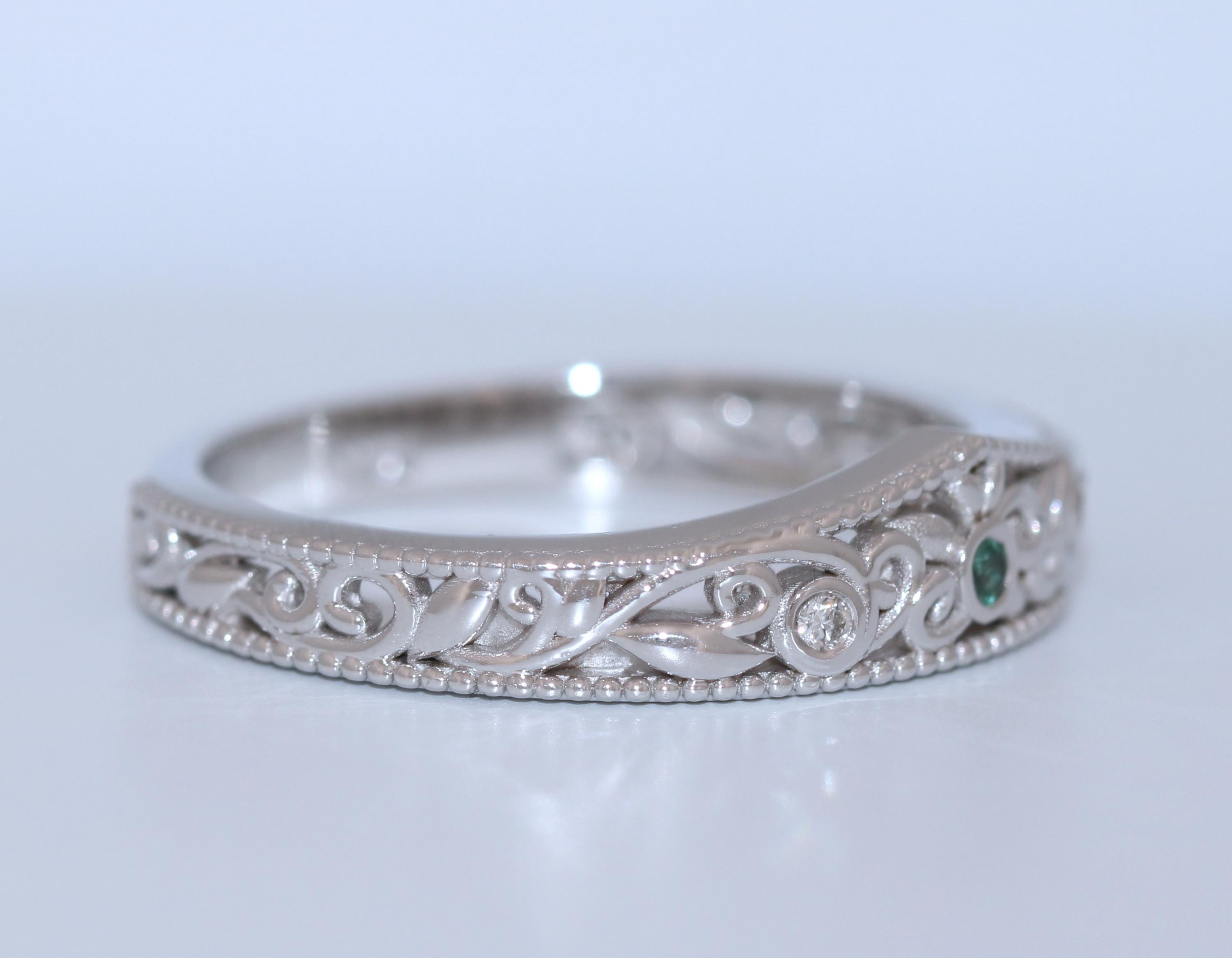 Flair Style Custom Made Scrollwork Lace Organic Diamond Ring with dainty smooth leaf filigree pattern.