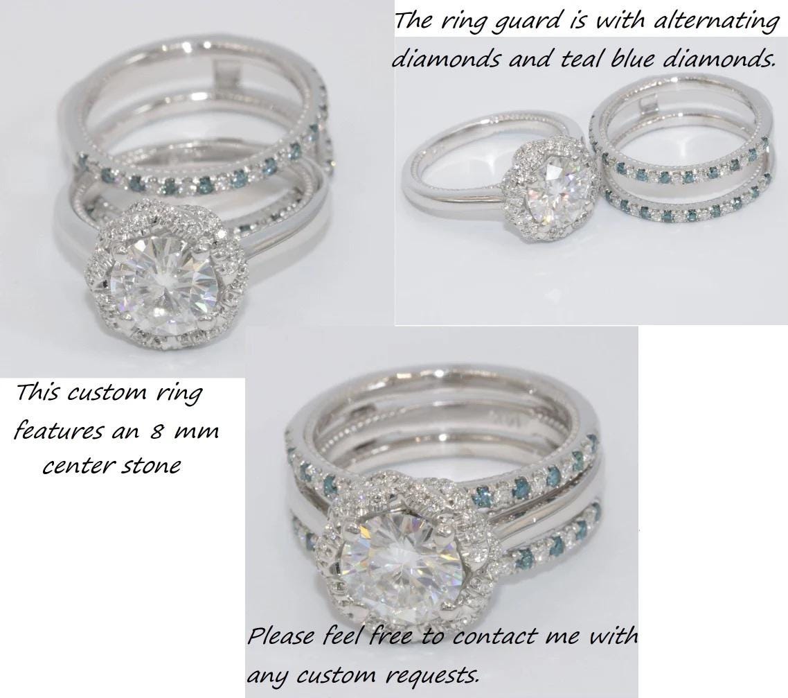 In the last 3 pictures you can see a different version of this ring with teal blue diamonds alternating ring guard. Please contact me for a price quote.