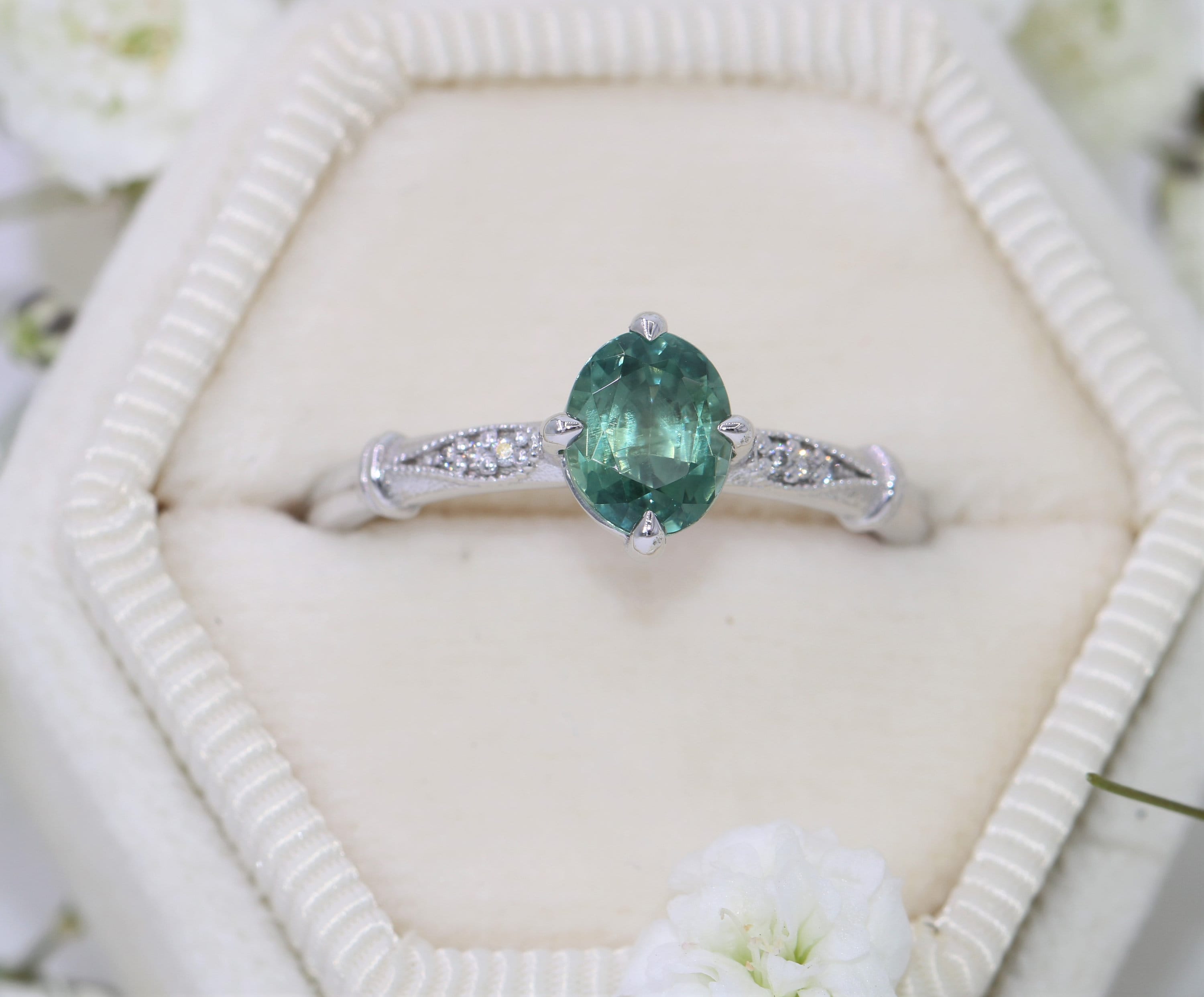 Edwardian style inspired custom-made Breathtaking Natural Teal Blue Green Montana Sapphire Engagement Ring.