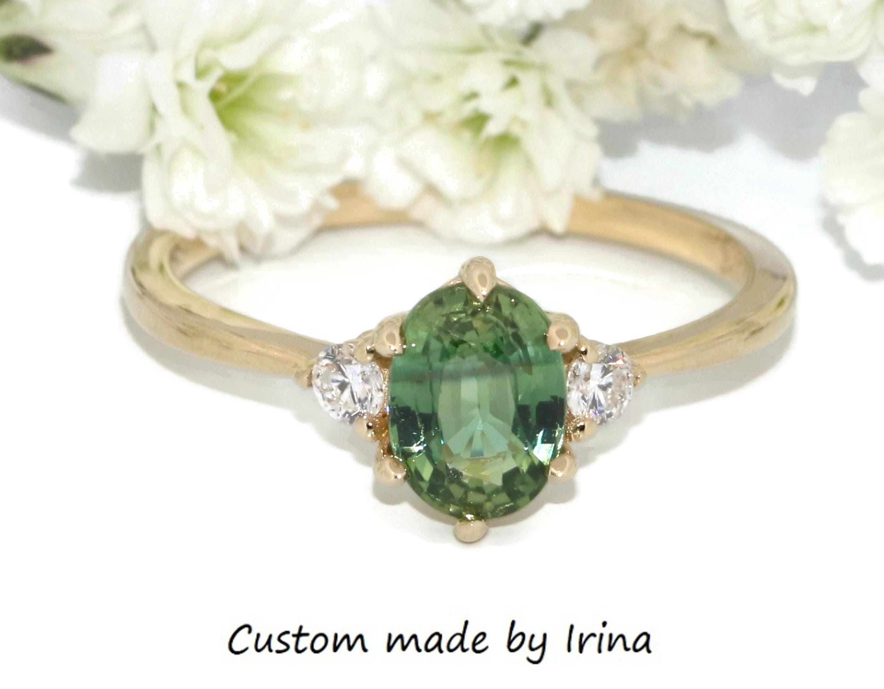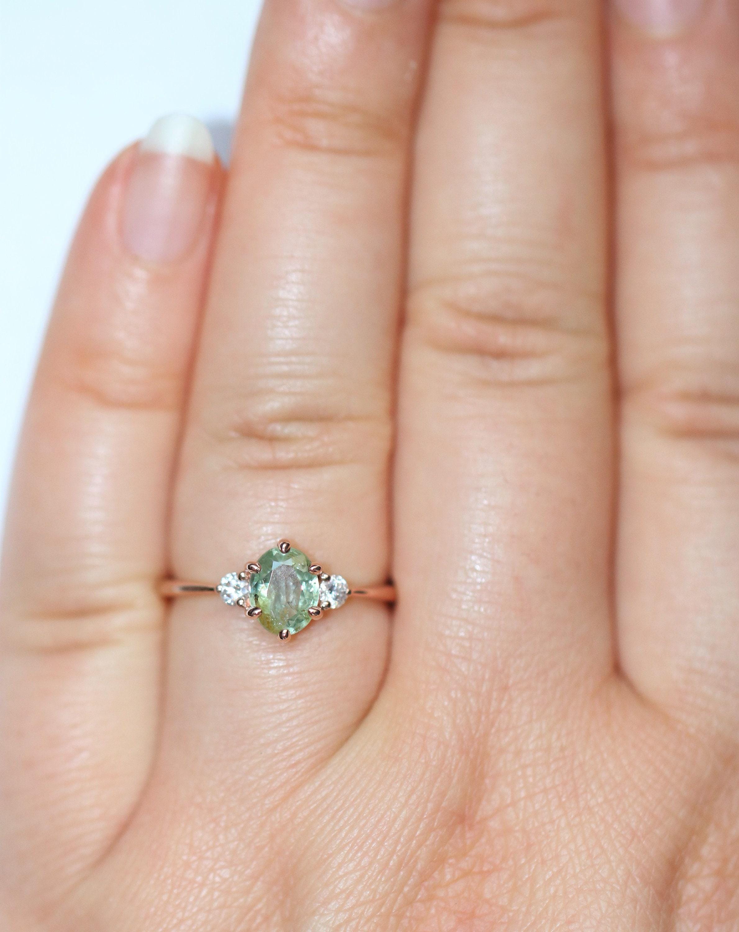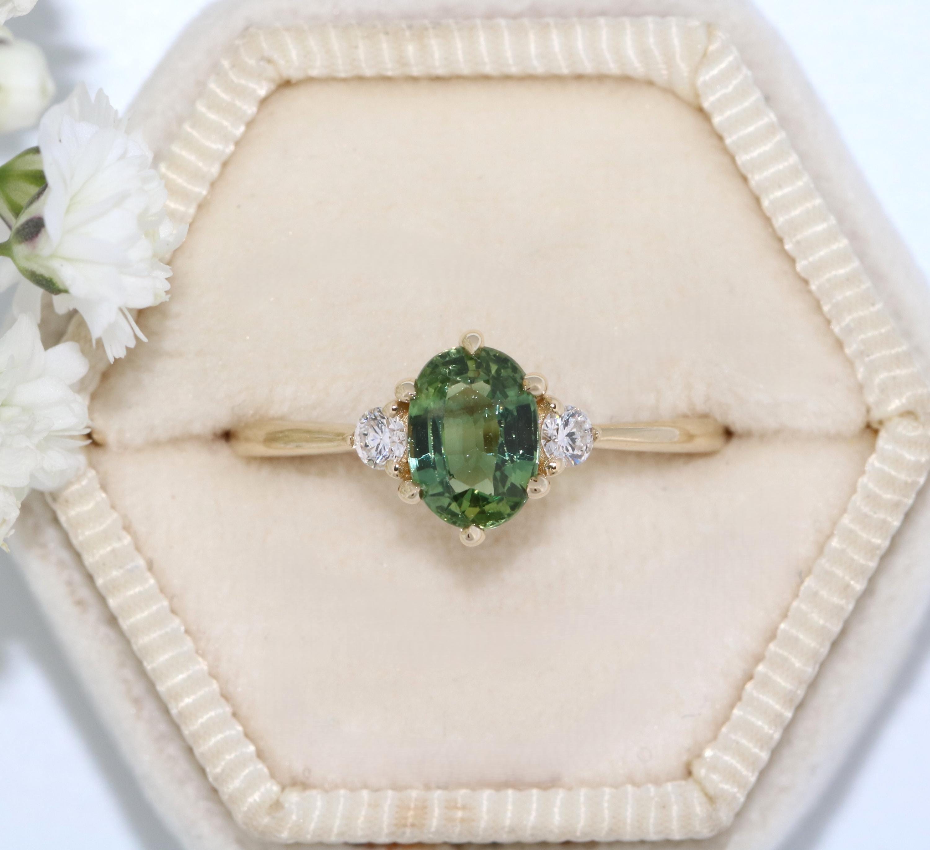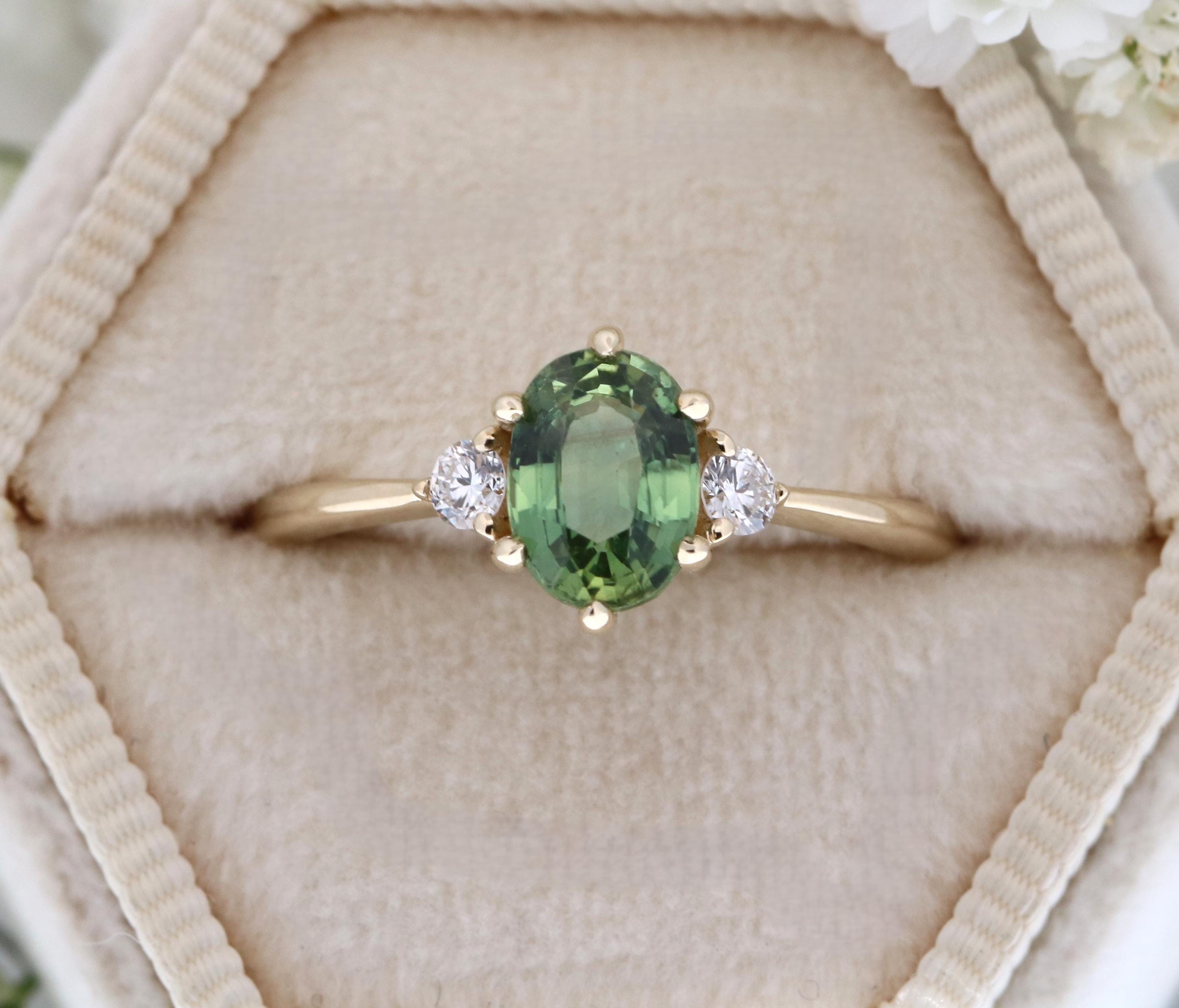 3 Stone Teal Green Natural Sapphire Classic Engagement Ring.