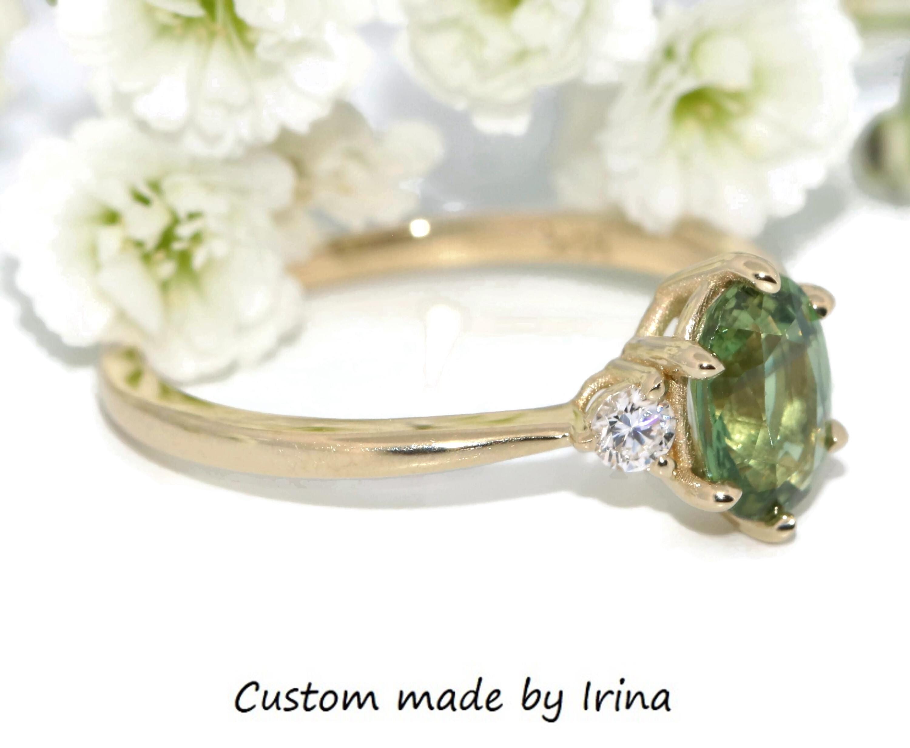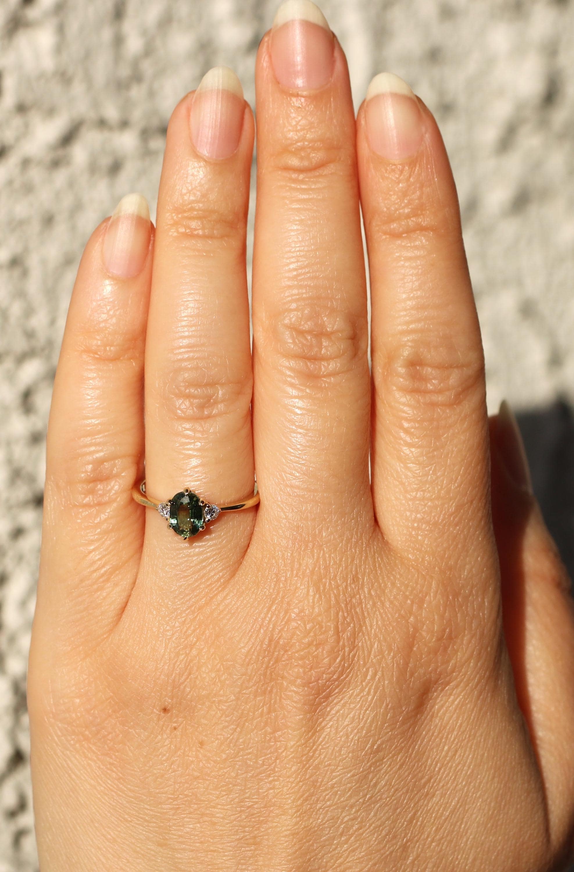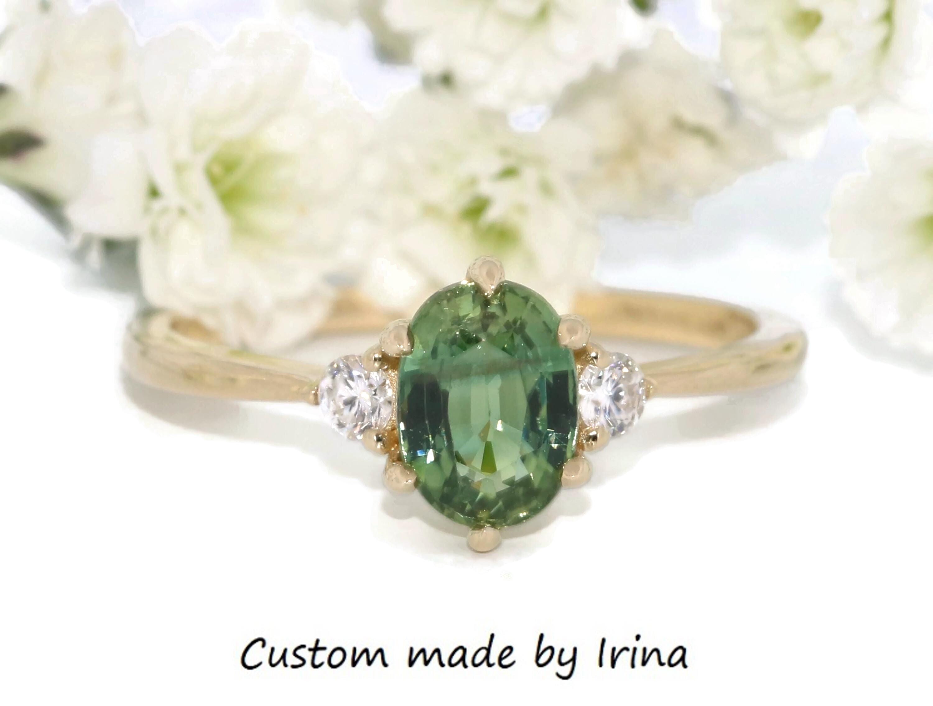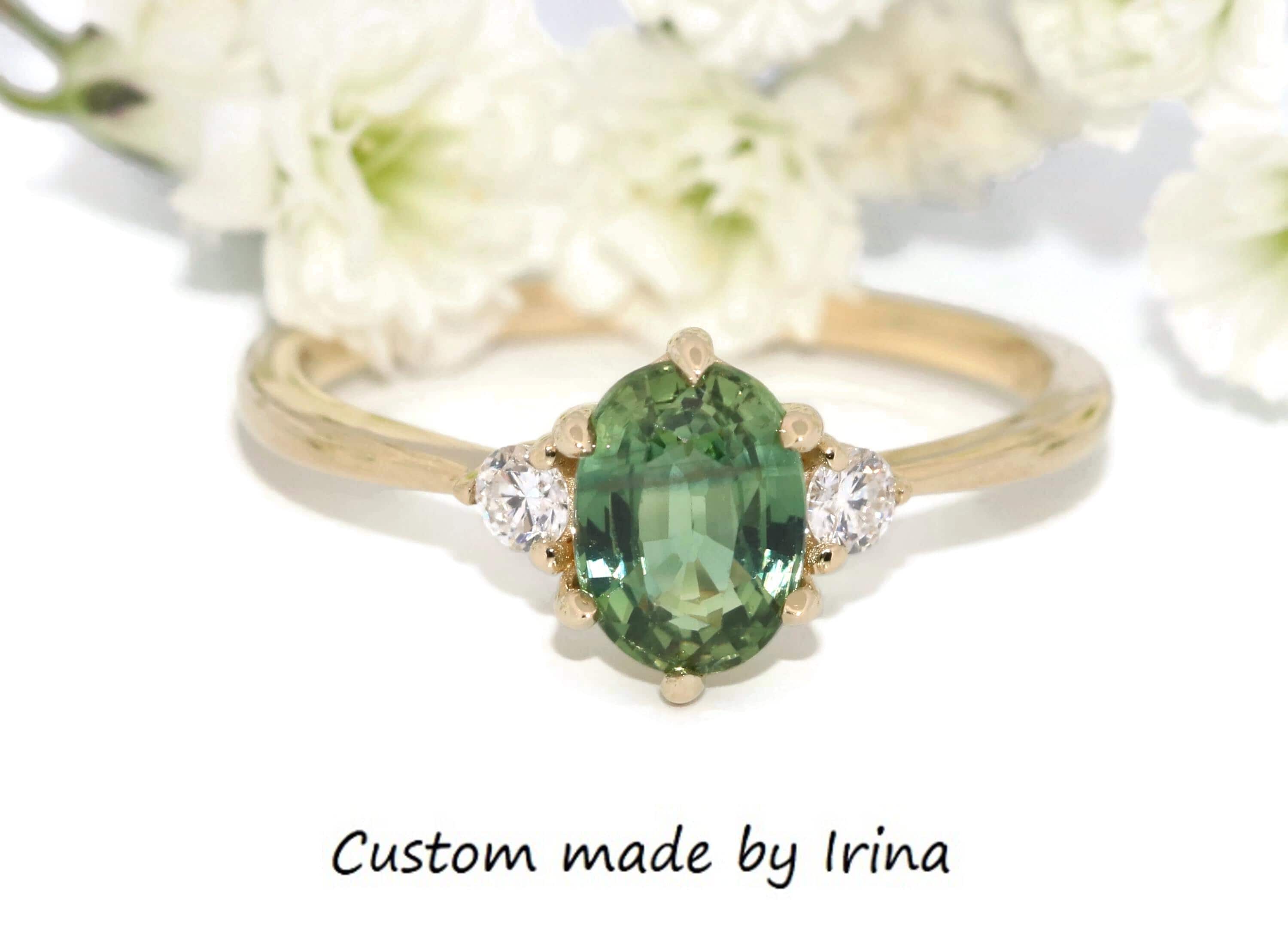 3 Stone Teal Green Natural Sapphire Classic Engagement Ring.